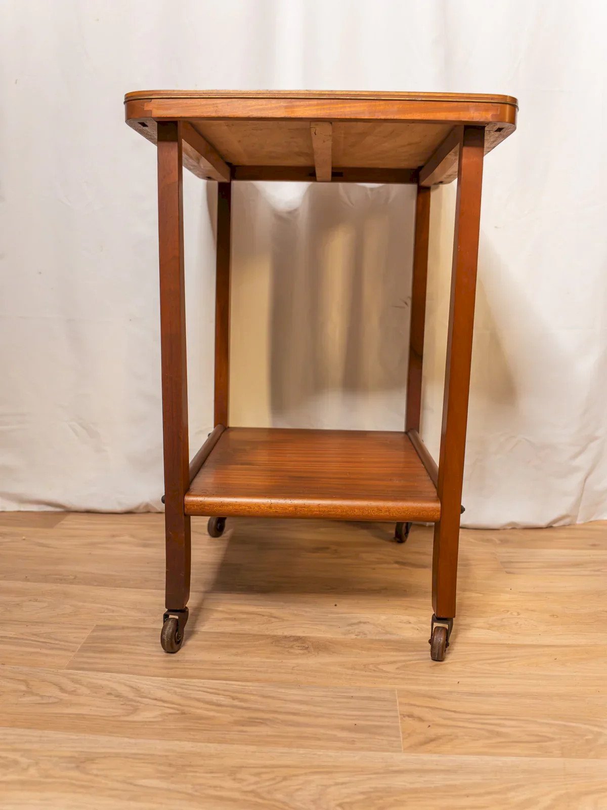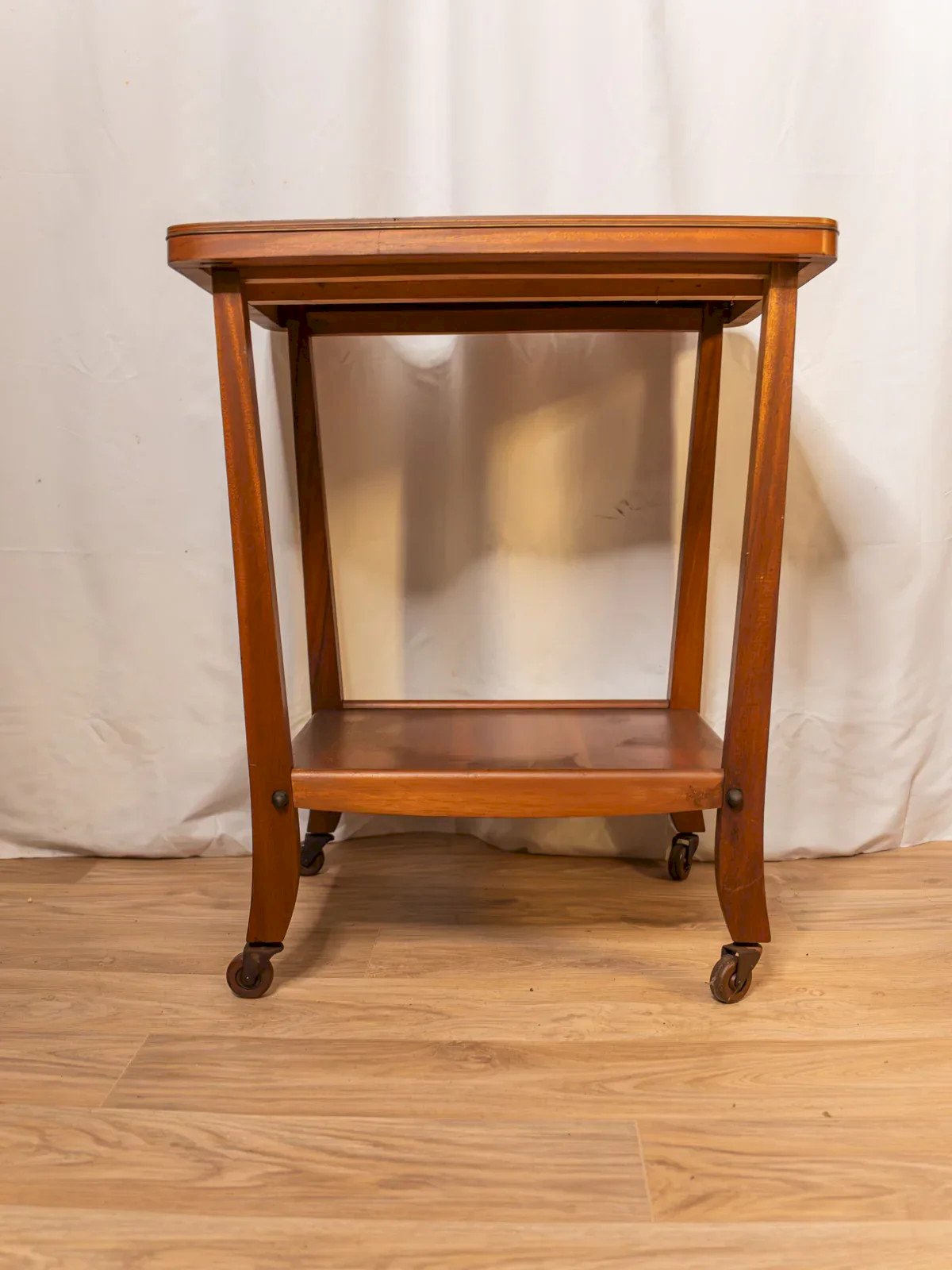 Invite this wheeled serving cart to animate your interior with elegance: its two dark wooden trays, accented with a golden trim, evoke a warm and refined vintage style. Practical and mobile, it moves easily to serve drinks and dishes or to be used as a side table in the living room or kitchen, creating a friendly and structured atmosphere. Signs of wear and traces of time are present. Length: 63 cm Width: 50 cm Height: 77.5 cm A brief history of the serving cart The serving cart, also known as a serving table, originated in the 17th century. At that time, it was used to serve and clear dishes during meals. Equipped with wheels, it can be transferred from one place to another effortlessly and allows for quicker table clearing by reducing the number of trips between the dining room and kitchen. Its great utility is what has made the serving cart an important piece of furniture, also serving tea or breakfast. This small mobile side table has managed to find a prized place in our interiors over the centuries. Condition: Used: Item that has been used. Item showing some superficial signs of wear... Used: Item that has been used. Item showing some superficial signs of wear, fully operational, and functioning correctly. It may be a demonstration model or an item returned to the store after a short period of use. Any possible imperfections. Brand: Debongout Type: Thrifted product Material: Wood, Metal, Plastic, Brass Style: Country Custom: Serving carts