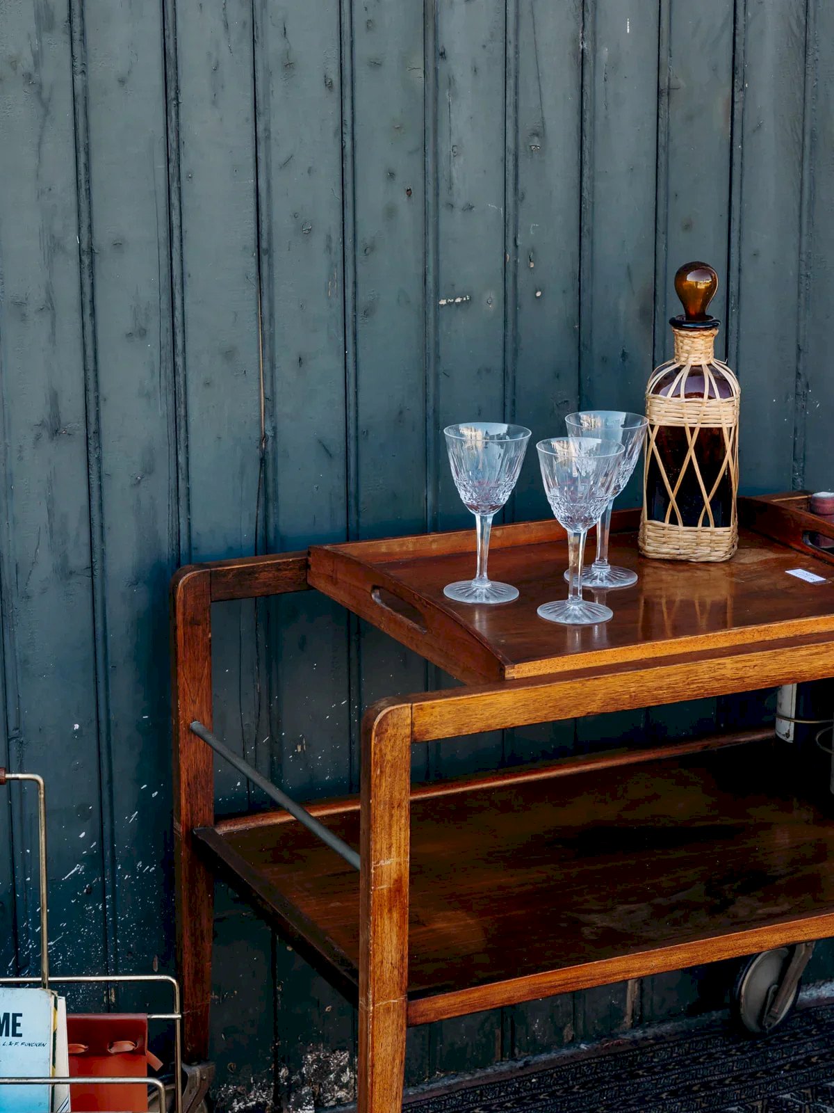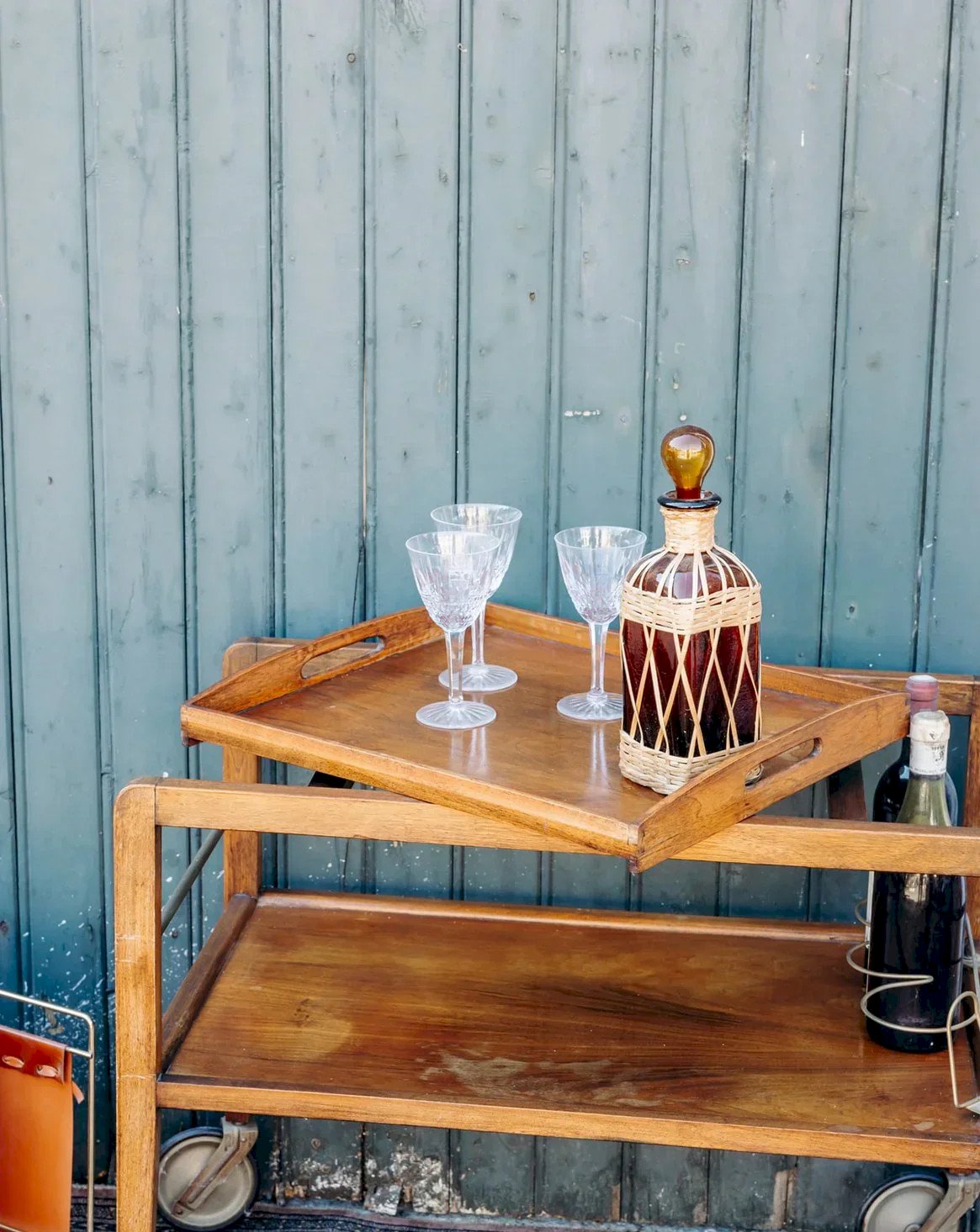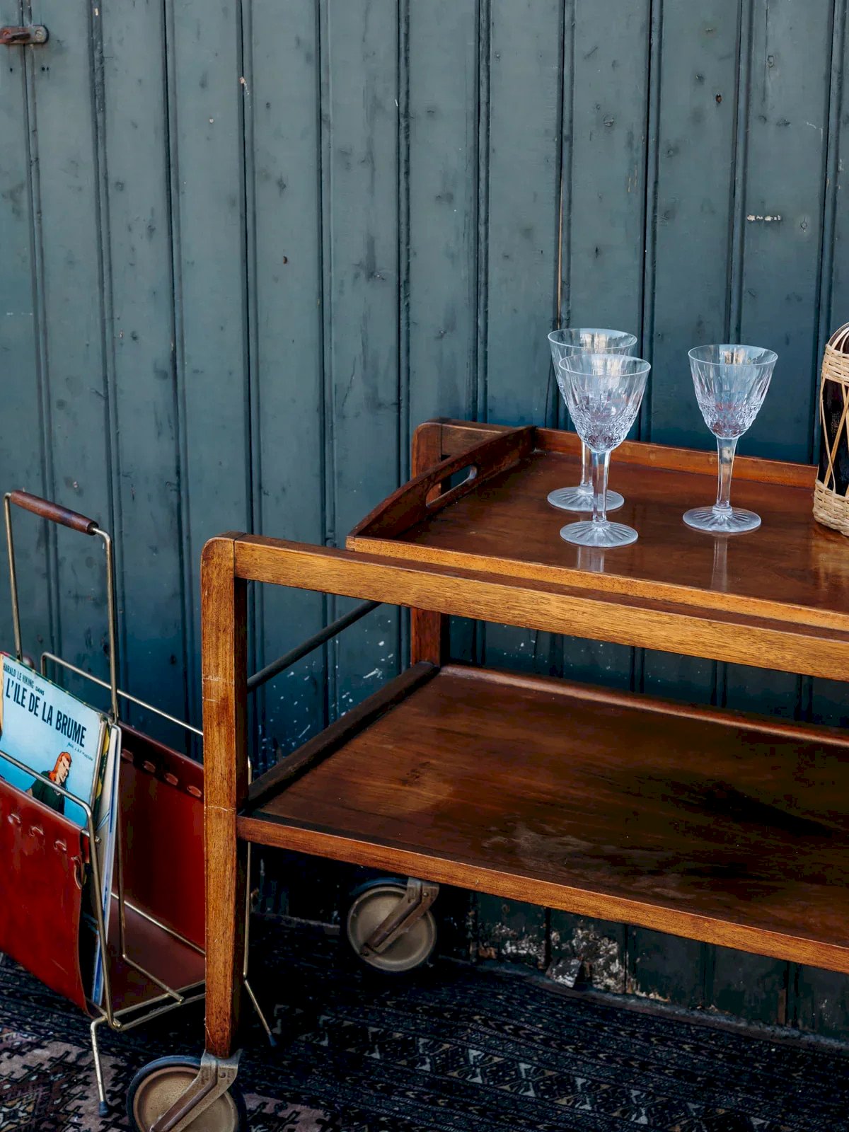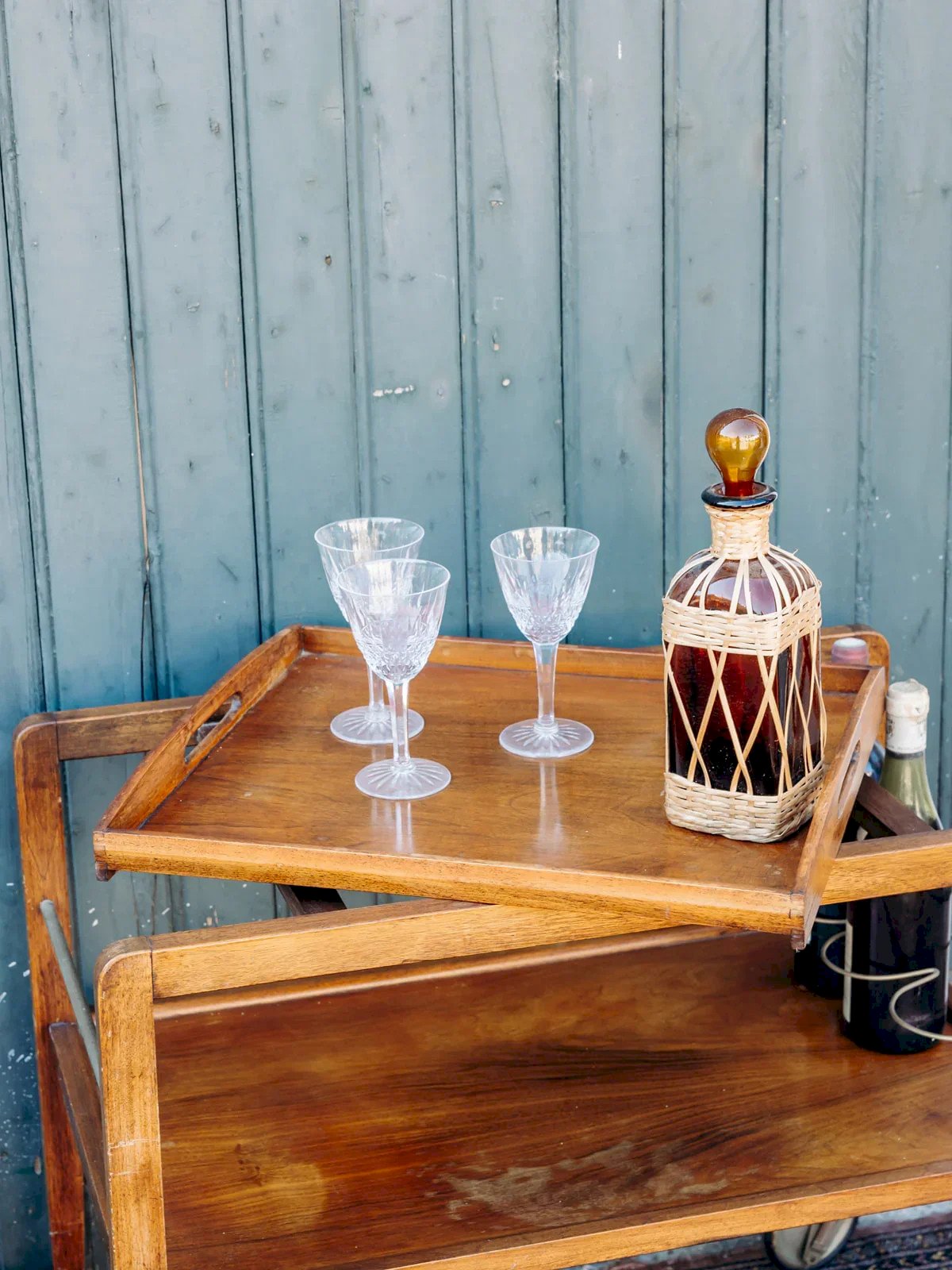 Treat yourself to this small modular wooden cart, perfect for adding a touch of elegance to your home. Equipped with large wheels, it moves easily according to your needs. Its removable top tray allows you to serve your guests with ease. Inside, three compartments specifically designed for bottles ensure clever and practical storage. An essential for combining functionality and style! Web exclusive, the meeting will take place at your home! Length: 75 cm Width: 75 cm Height: 62 cm Height between the two trays: 24 cm Tray dimensions: Length: 48 cm Width: 40 cm A brief history of the cart The cart, also known as a serving table, emerged in the 17th century. At that time, it was used to serve and clear dishes during meals. Fitted with wheels, it can be moved from one spot to another effortlessly and helps clear the table more quickly by reducing the number of trips between the dining room and the kitchen. Its great utility has made the cart an important piece of furniture, also used to serve tea or breakfast. This small mobile side table has found a place of honor in our homes over the centuries. Condition: Used: Item has been used. Item shows some superficial signs of wear... Used: Item has been used. Item is fully operational and working correctly. It may be a display model or an item returned to the store after a short period of use. any potential imperfections. Brand: Debongout Type: Vintage product Material: Wood Style: Country Customized: Carts