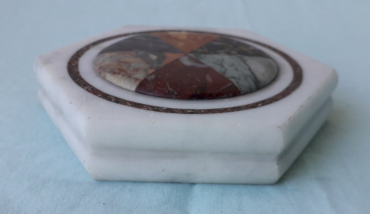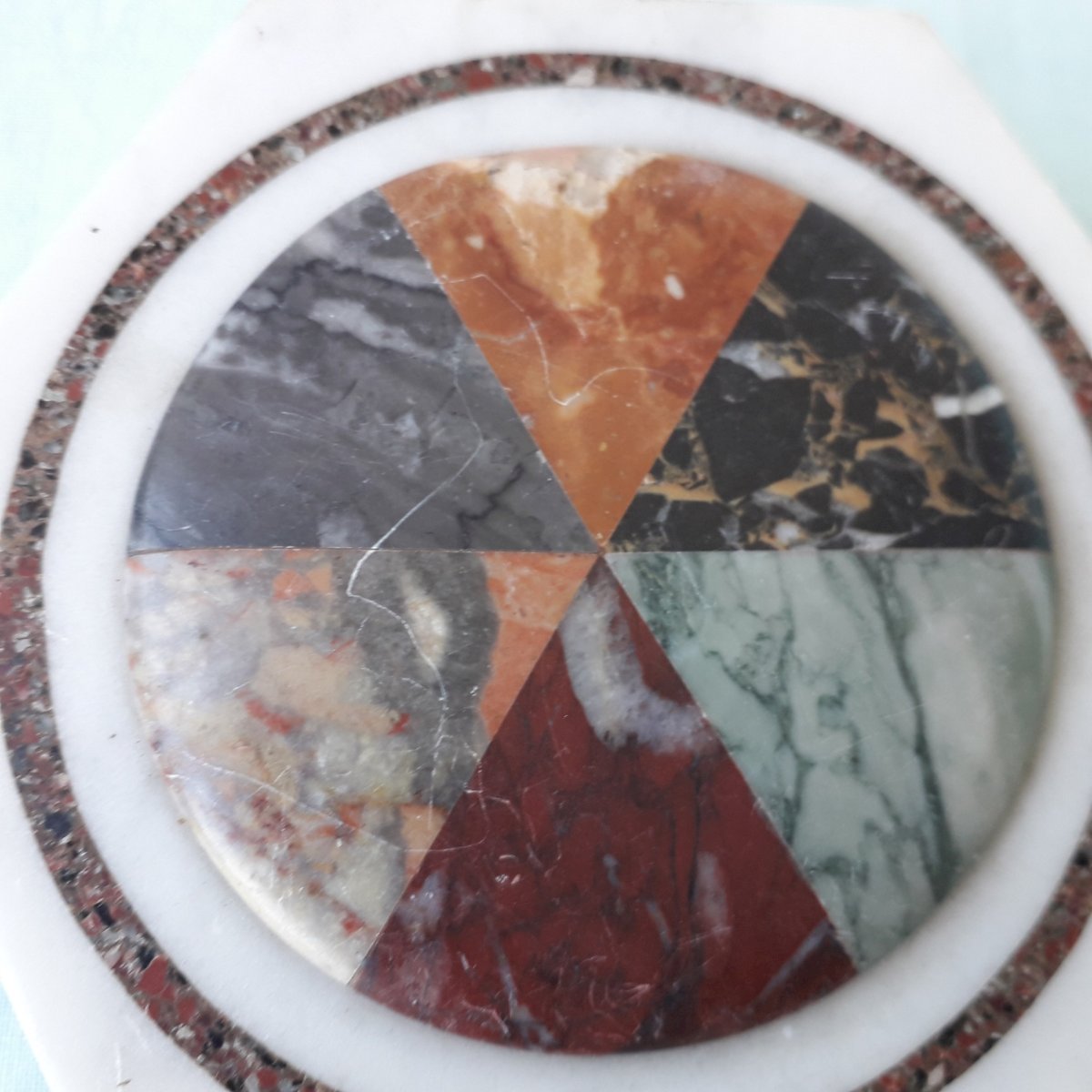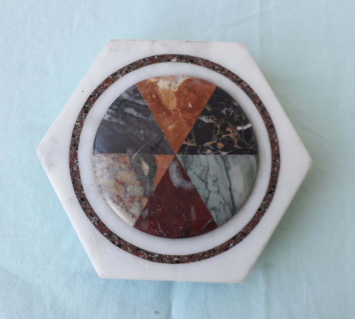 Hexagonal white marble paperweight, with a center circle composed of 6 other marbles in different shades.