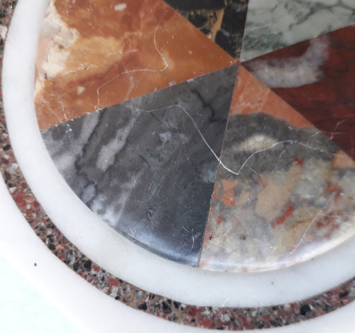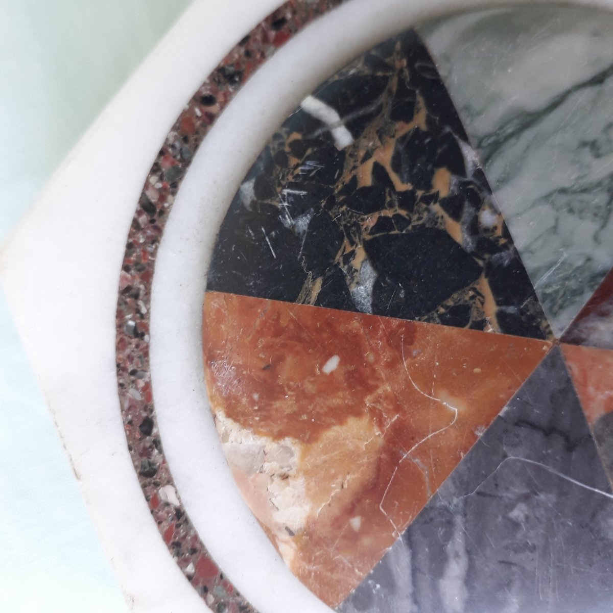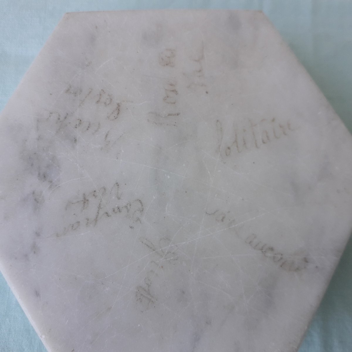 Hexagonal white marble paperweight, with a center circle composed of 6 other marbles in different shades.