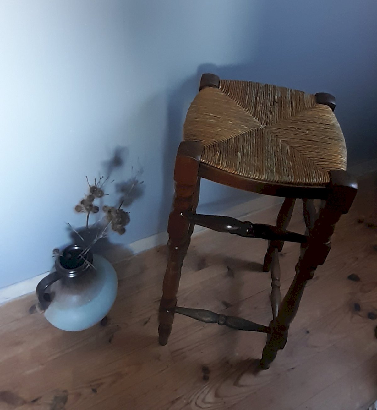 This high wood and straw stool is of an old manufacture that exudes a reassuring authenticity and a warm spirit.