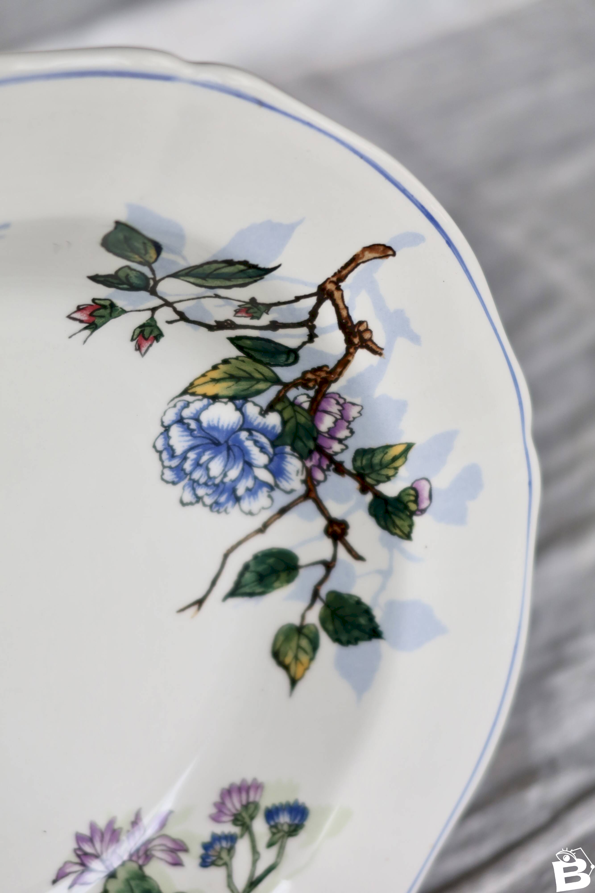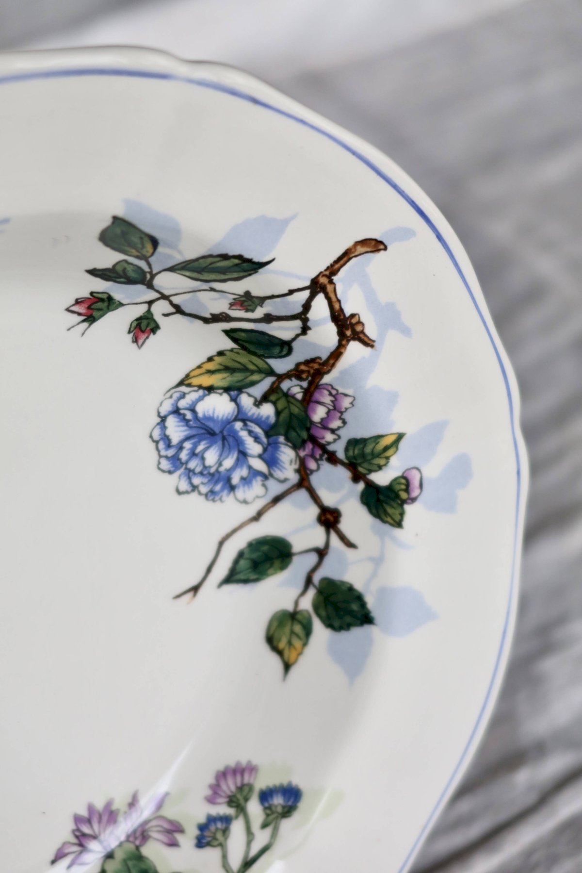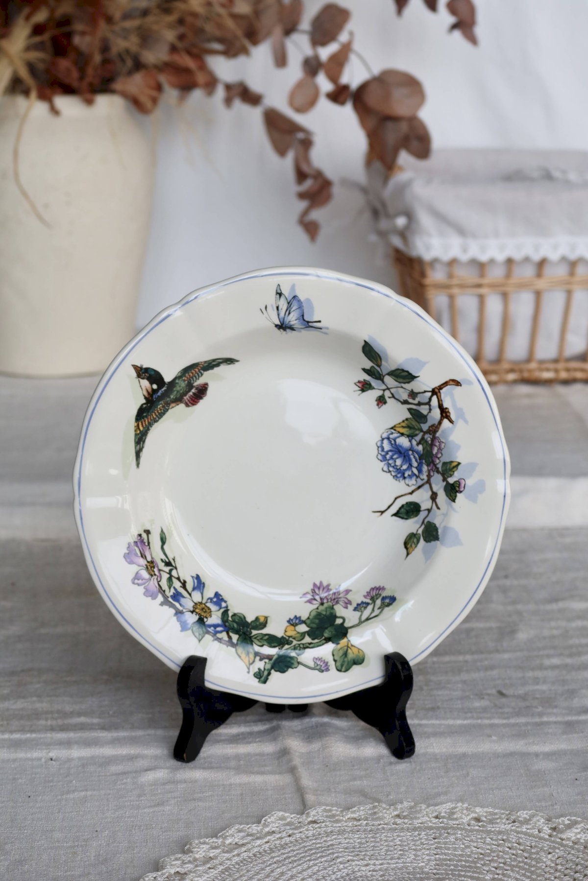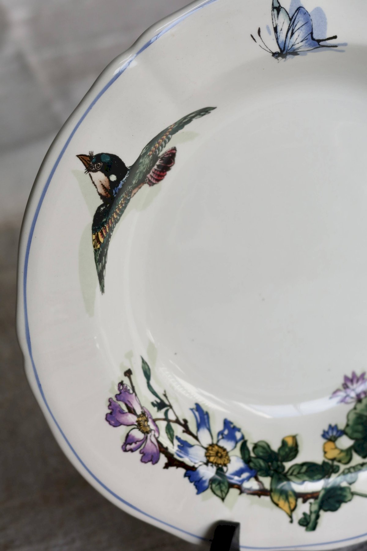 Hollow plate in porcelain from Gien, model L’Oiseau poète: narrative decoration of a bird in flight, a butterfly, and a frieze of polychrome flowers, highlighted by a fine blue border. Nice shine, no wear, perfect both for the table and as wall decor. Dimensions: 23cm X 3cm. L: 23 W: 23 H: 3