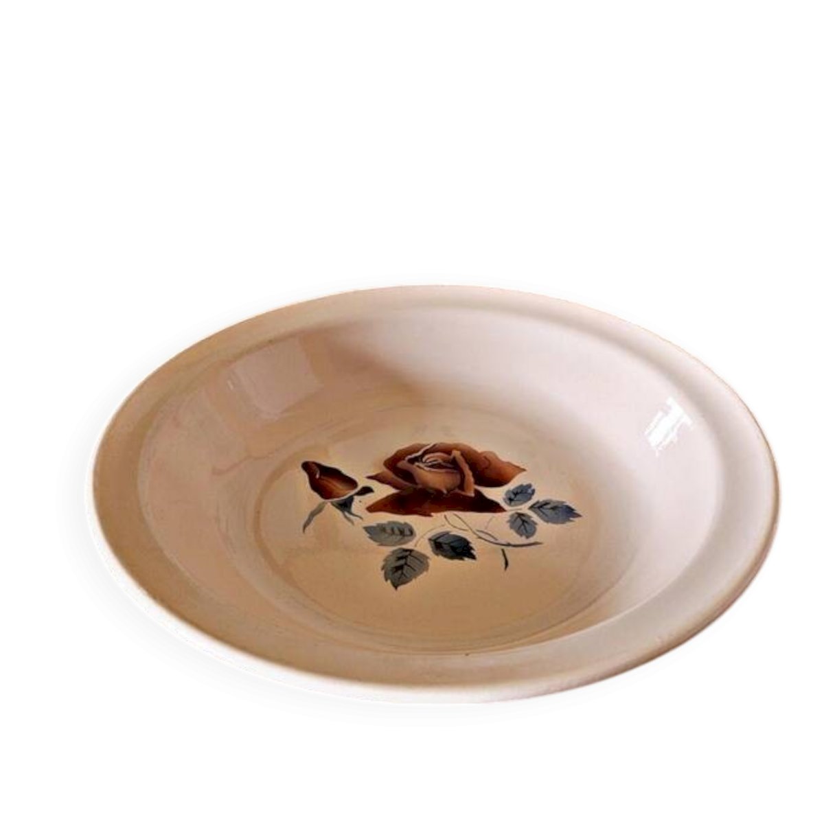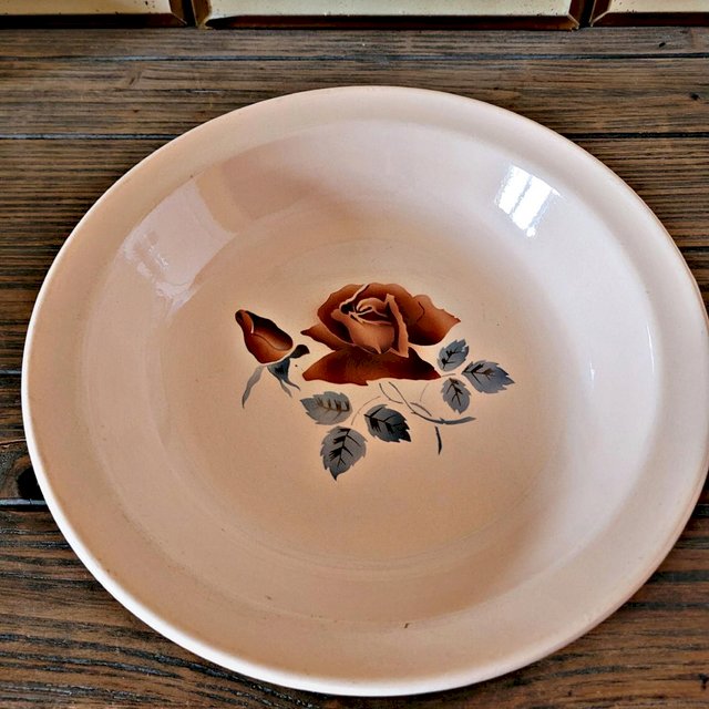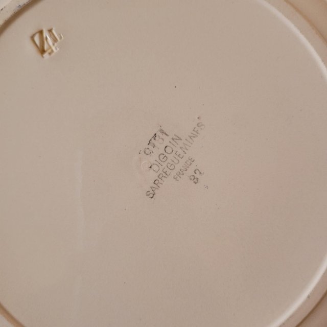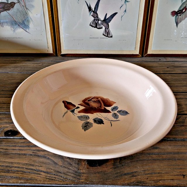Hollow round plate Digoin Sarreguemines model 9481 (the stamp is a bit faded, maybe 9181). Pink earthenware, rose decoration. Good condition, except for a small chip on the underside that doesn't affect its use. ? diameter 27 cm X height 5 cm. Weight of the plate: approximately 630 g. L: 27 W: 27 H: 5