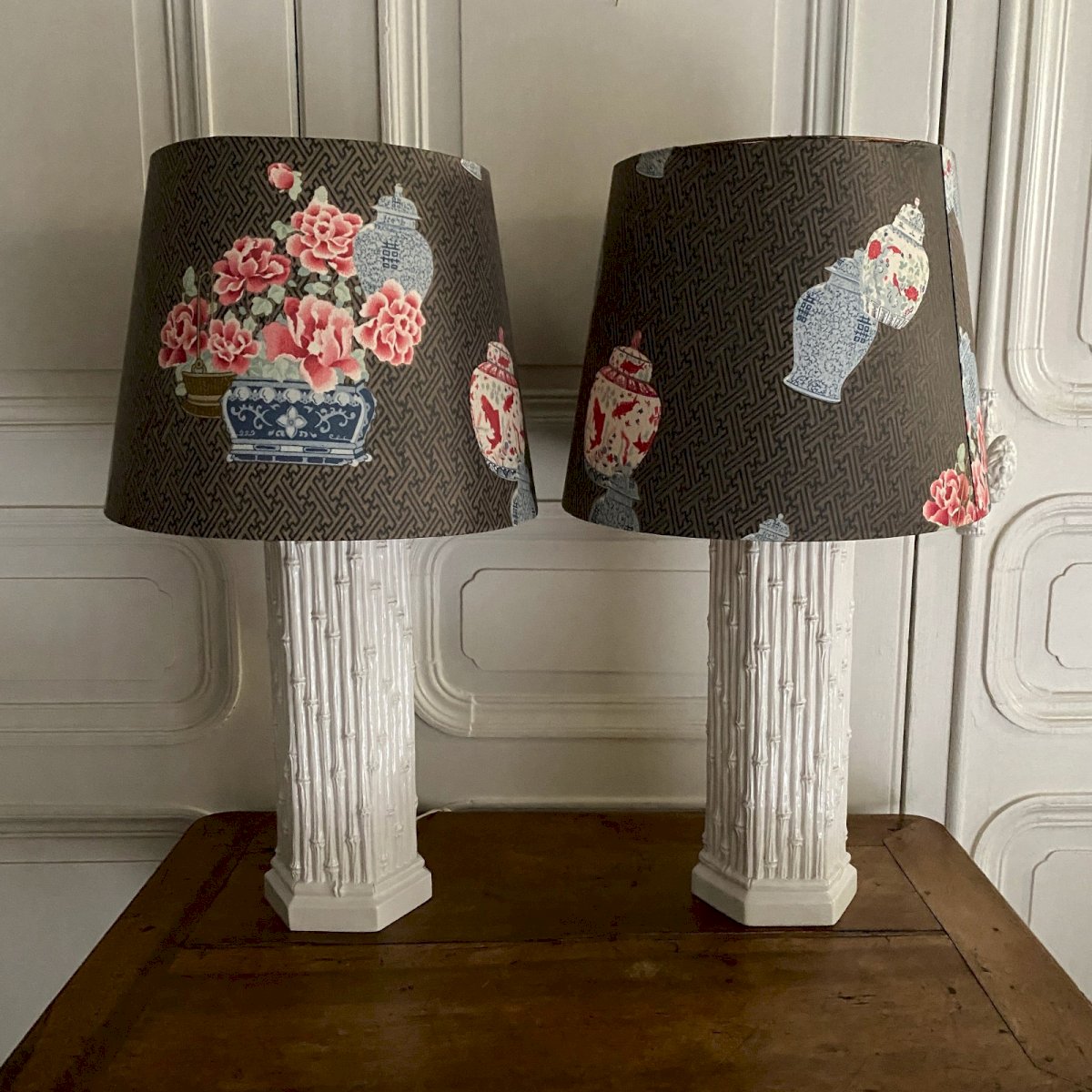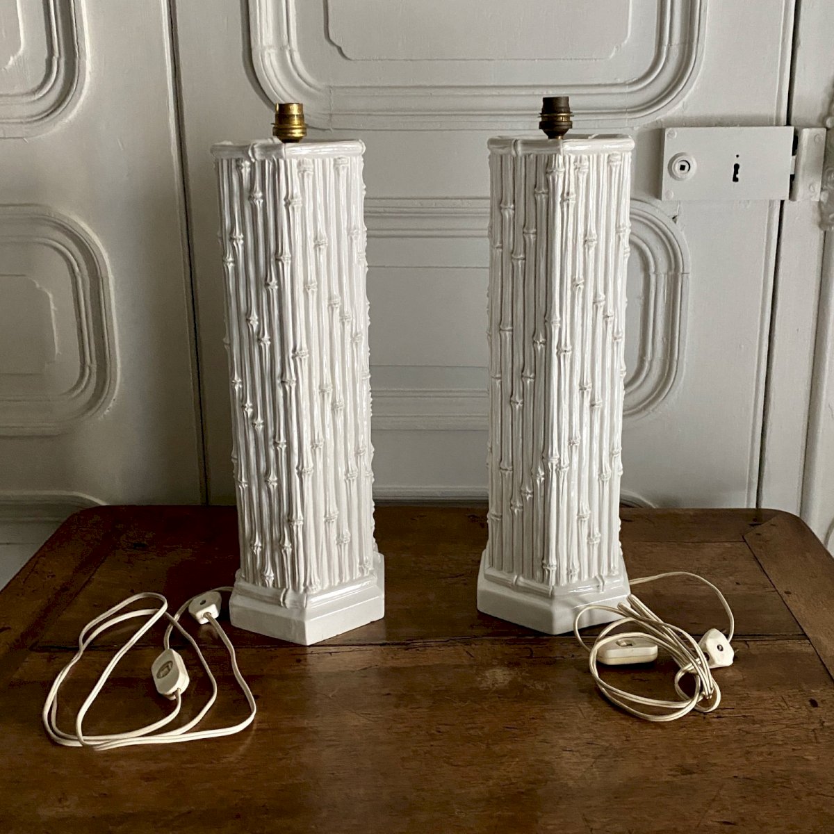 Pair of Hollywood Regency lamps in bamboo imitation ceramic mid-20th century M3765 This pair of lamps from the 1960s is made of ceramic and is a model known as "Hollywood Regency" with bamboo imitation. We provide the two Chinese-decorated lampshades. We note one or two missing parts on the base, and a crack photographed (which is probably a firing crack). The ensemble can be considered suitable. The electrical wiring is old, so it needs to be reviewed for safety reasons. Our photos allow you to appreciate the quality of the item. For the condition, please detail the photos. Do not hesitate to zoom in. The photos are an integral part of the description. Dimensions: Height: 46 cm Width: 15 cm A: 1ANC63SVNT P: 1648018 I remain at your disposal for any questions. Type: Table lamp Subtype: Indoor Height: 46 cm Material: Ceramic Length: cm Width: 15 cm