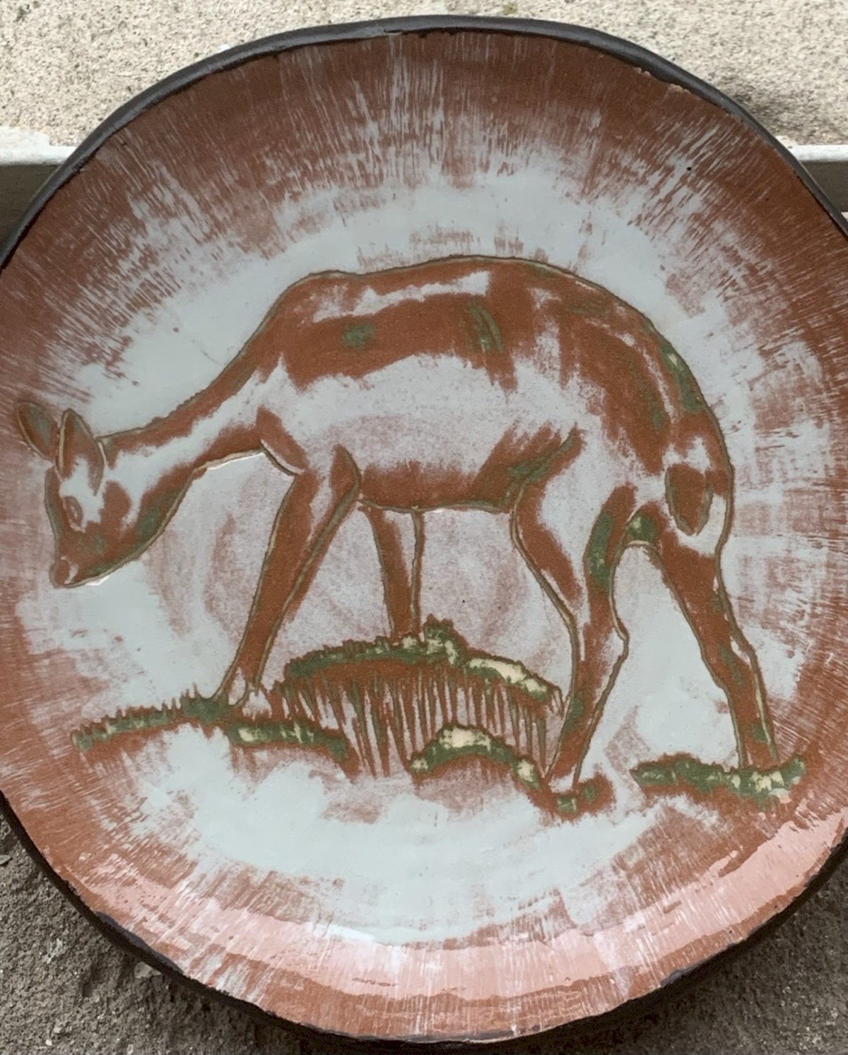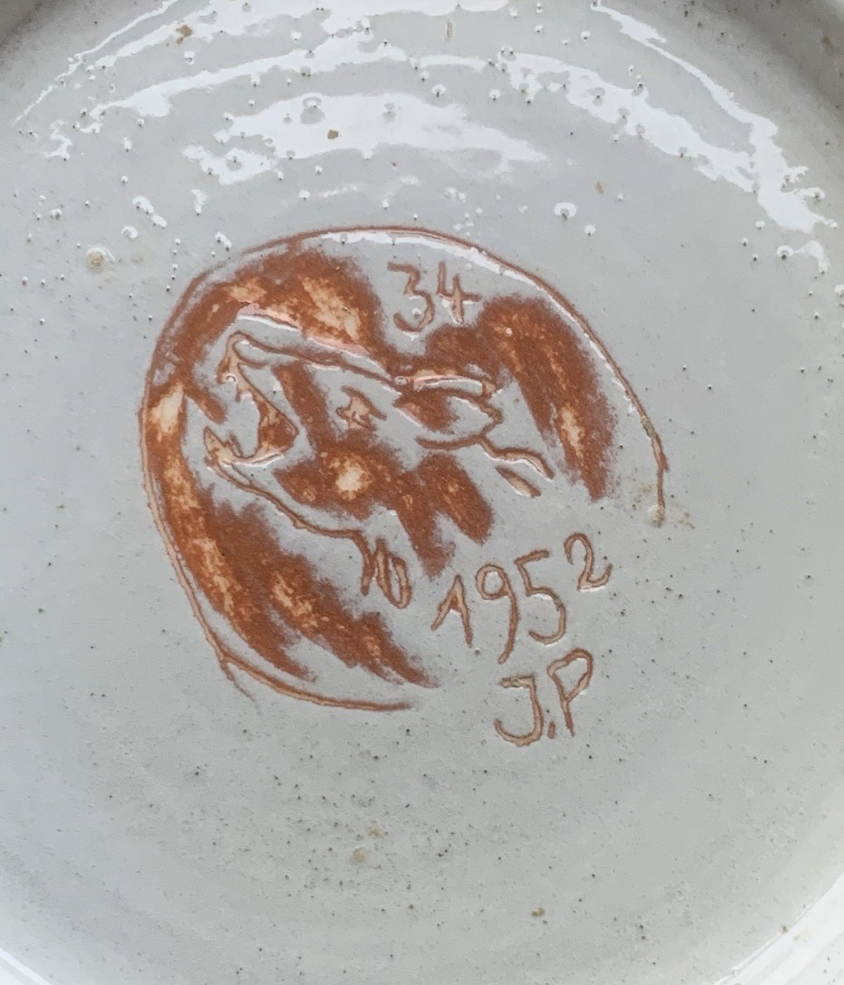 Decorative wall ceramic featuring a fawn or young deer grazing Brown-red engobe with green touches, scarified contours of the animal Naive and pictorial decoration On the reverse, a very beautiful animal stamp with the head of a canid Dating from 1952, initials J.P, and a number 34 Very beautiful ceramic In very good condition Can be hung Diameter: 15.3 cm Mark: JP Origin: France Country of origin: Metropolitan France Additional filters: JP