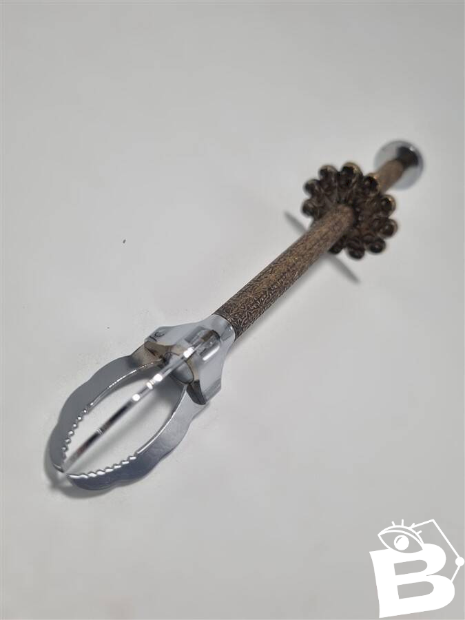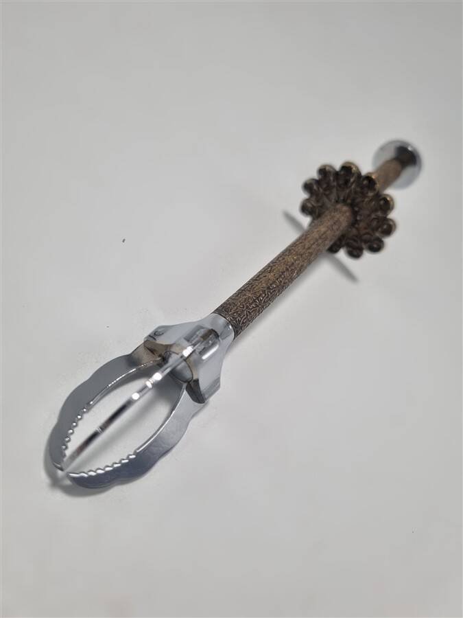 Ice tongs with a pretty decorated handle. Dimensions: 15.5 x 3.5 cm. Weight: 55 g. L: 3 W: 3 H: 15