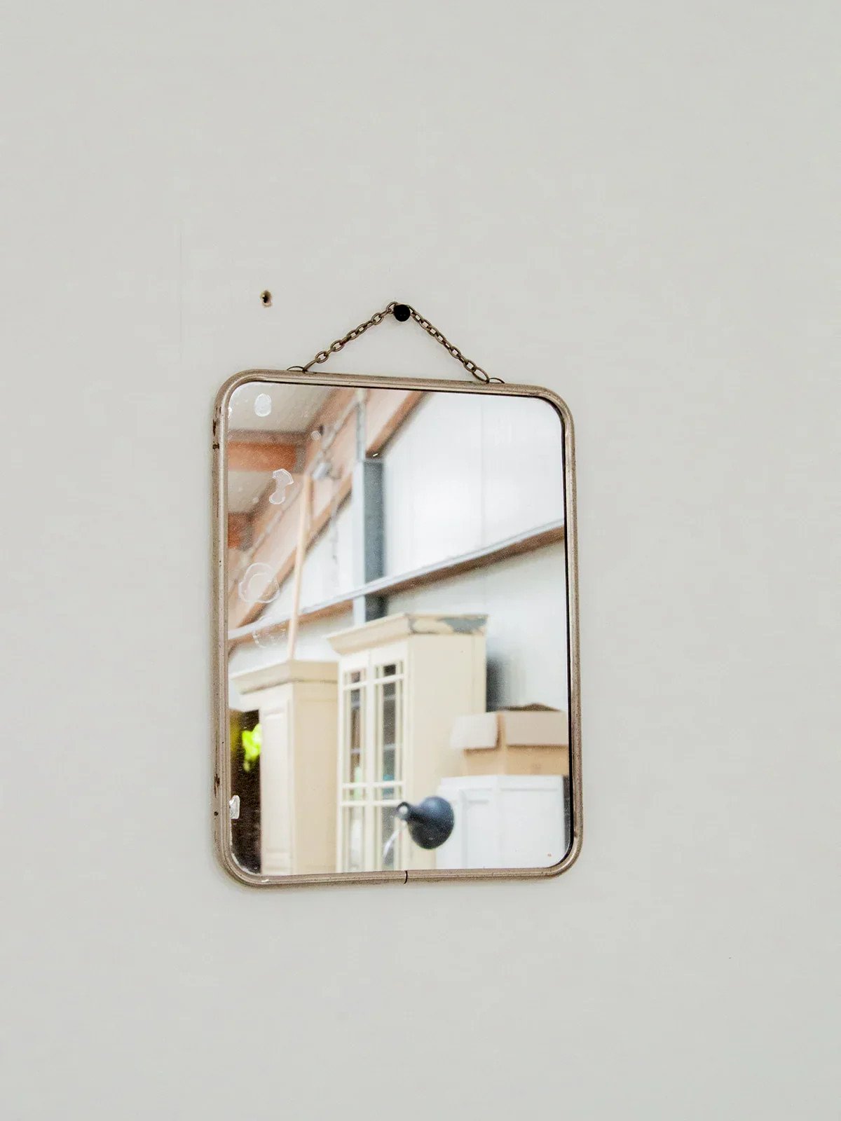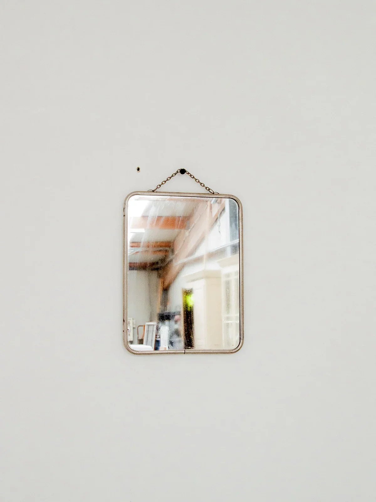 This wall mirror adds a subtly vintage touch to your interior. Its metal frame with slightly rounded edges gives it a soft and elegant look, while its slightly tarnished surface evokes the charm of antique pieces. Ideal for an entryway, a bedroom, or a bathroom, it easily integrates into all styles for an authentic and refined decoration. Length: 24 cm Width: 18 cm Condition: Used: Item that has been used. Item showing some signs of superficial wear... Used: Item that has been used. Item showing some signs of superficial wear, fully operational and functioning correctly. It may be a display model or an item returned to the store after a short period of use. Any potential imperfections. Brand: Debongout Type: Vintage product Material: Glass, Metal Style: Contemporary