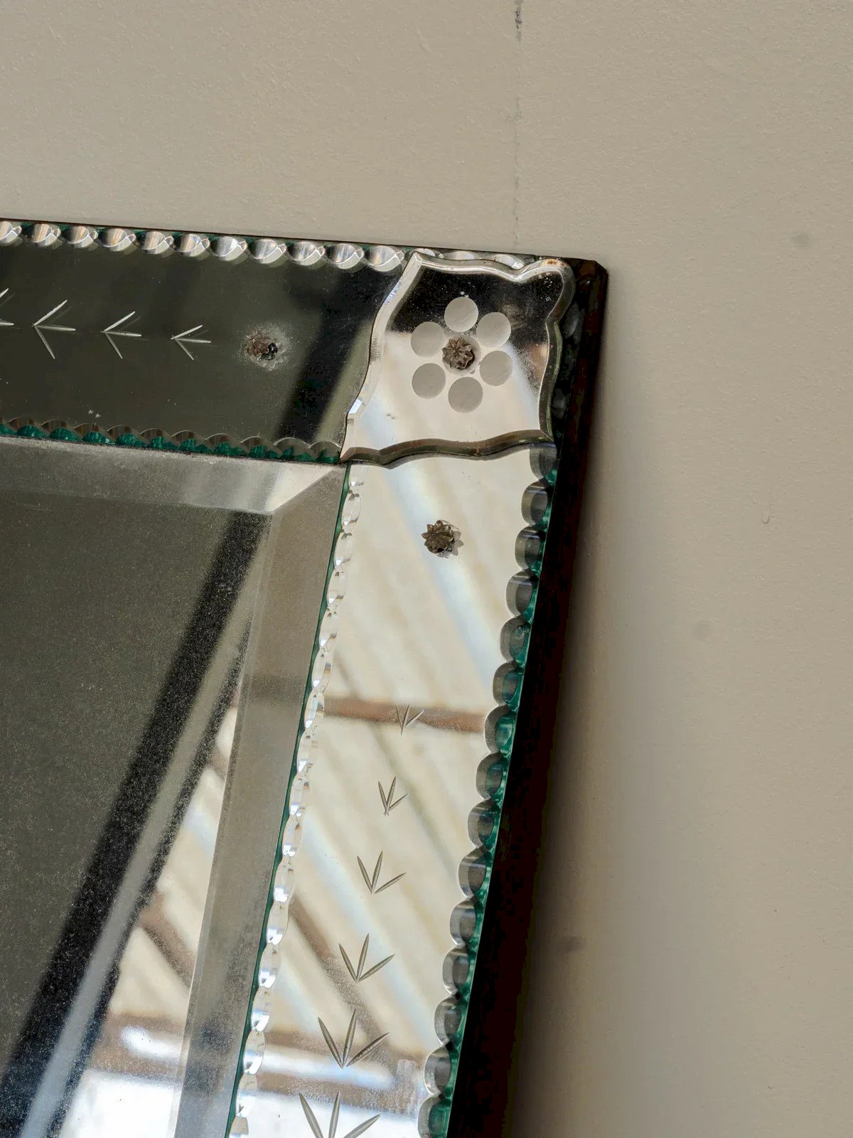 Enhance your interior with this 1920s mirror featuring transparent glass and a delicately decorated frame with floral patterns, adding a touch of retro elegance. Its vertical format is substantial enough to dress up an entryway or a dresser, reflecting light and enlarging the space while remaining delicate, while the frame adds a romantic note, perfect for a bohemian-chic or classic ambiance. Some signs of wear over time are present. Length: 64 cm Width: 2.5 cm Height: 88 cm Condition: Used: An item that has been used. Item showing some superficial signs of wear, ... Used: An item that has been used. Item showing some superficial signs of wear, fully operational and working properly. It may be a demonstration model or an item returned to the store after a short period of use. any potential imperfections. Brand: Debongout Type: Chinned product Material: Glass Style: Contemporary