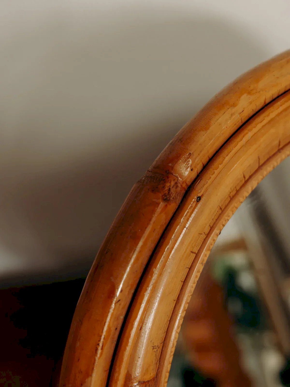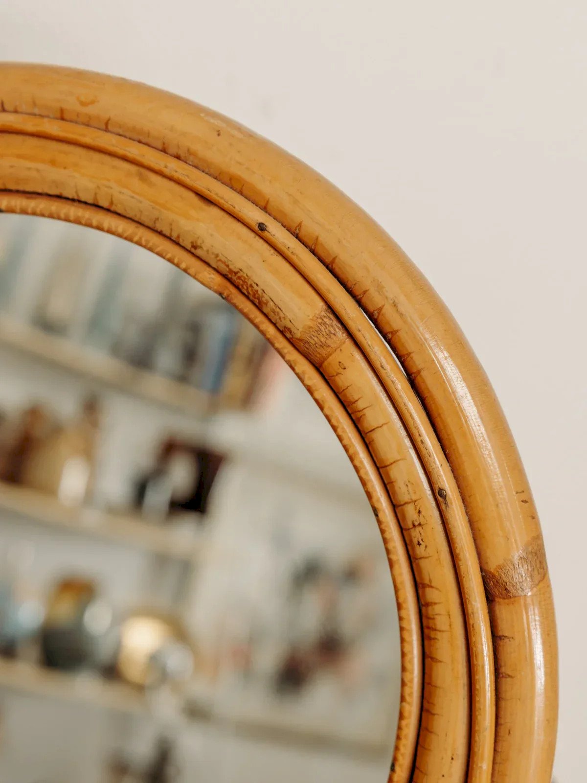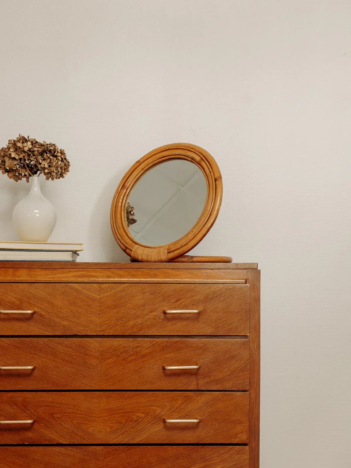 This vintage 70s rattan dressing table mirror will add a retro touch to your interior. In beautiful condition, it stands out for its elegant and warm design, perfect for enhancing a dressing table or harmoniously fitting into a wardrobe. Its artisanal rattan craftsmanship makes it a unique piece that will elevate your space while adding a touch of authenticity. Length: 38 cm Width: 32 cm Height: 40 cm Condition: Used: Item that has been used. Item showing some superficial signs of wear, fully operational and working correctly. It may be a demonstration model or an item returned to the store after a short period of use, with possible imperfections. Brand: Debongout Type: Vintage product Material: Rattan, Glass Style: Contemporary