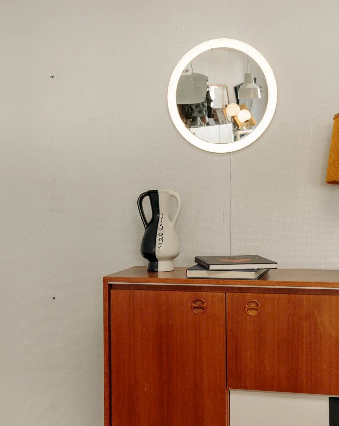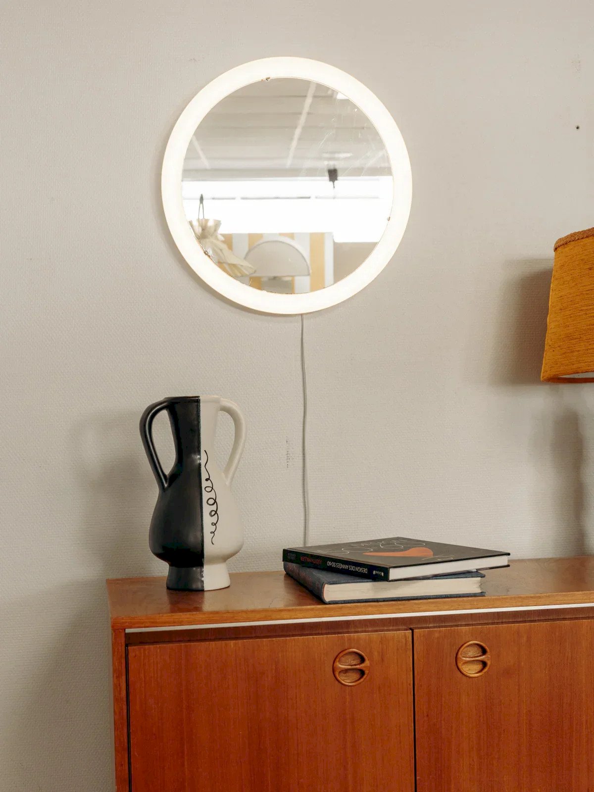 Discover the luminous mirror, a chic and functional accessory to enhance your space. With its round design conceived by Henrik Preutz, this backlit mirror adds a modern touch while providing pleasant brightness thanks to its built-in LED lighting. Although slightly marked on the edges, its overall good condition allows you to enjoy this sought-after vintage piece, no longer produced by Ikea. Ideal for bathrooms or dressing tables, it combines style and practicality. Length: 47 cm Width: 4 cm Height: 47 cm Condition: Used: Item that has been used. Item showing some superficial wear marks, fully operational and functioning correctly. It may be a demonstration model or an item returned to the store after a short period of use. The possible imperfections. Brand: Debongout Type: Thrifted product Material: Glass Style: Contemporary