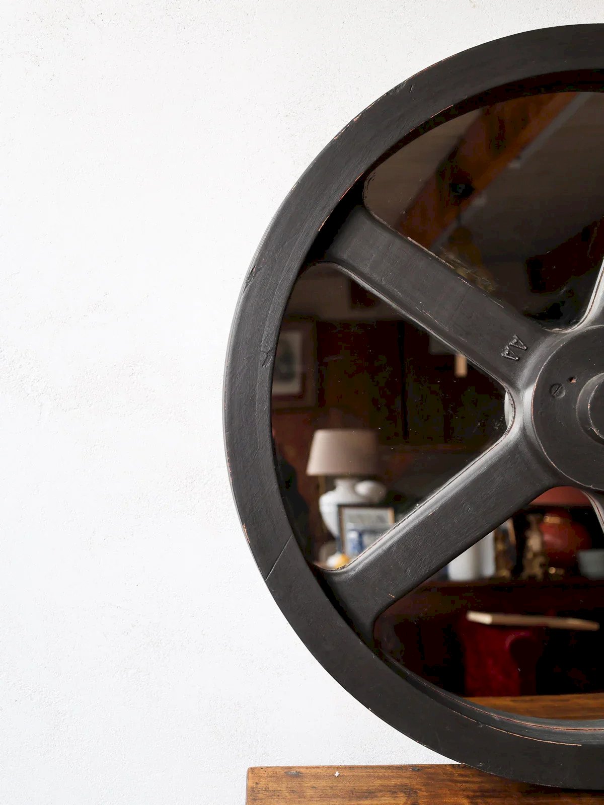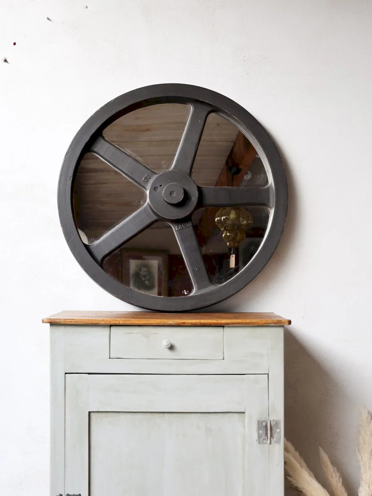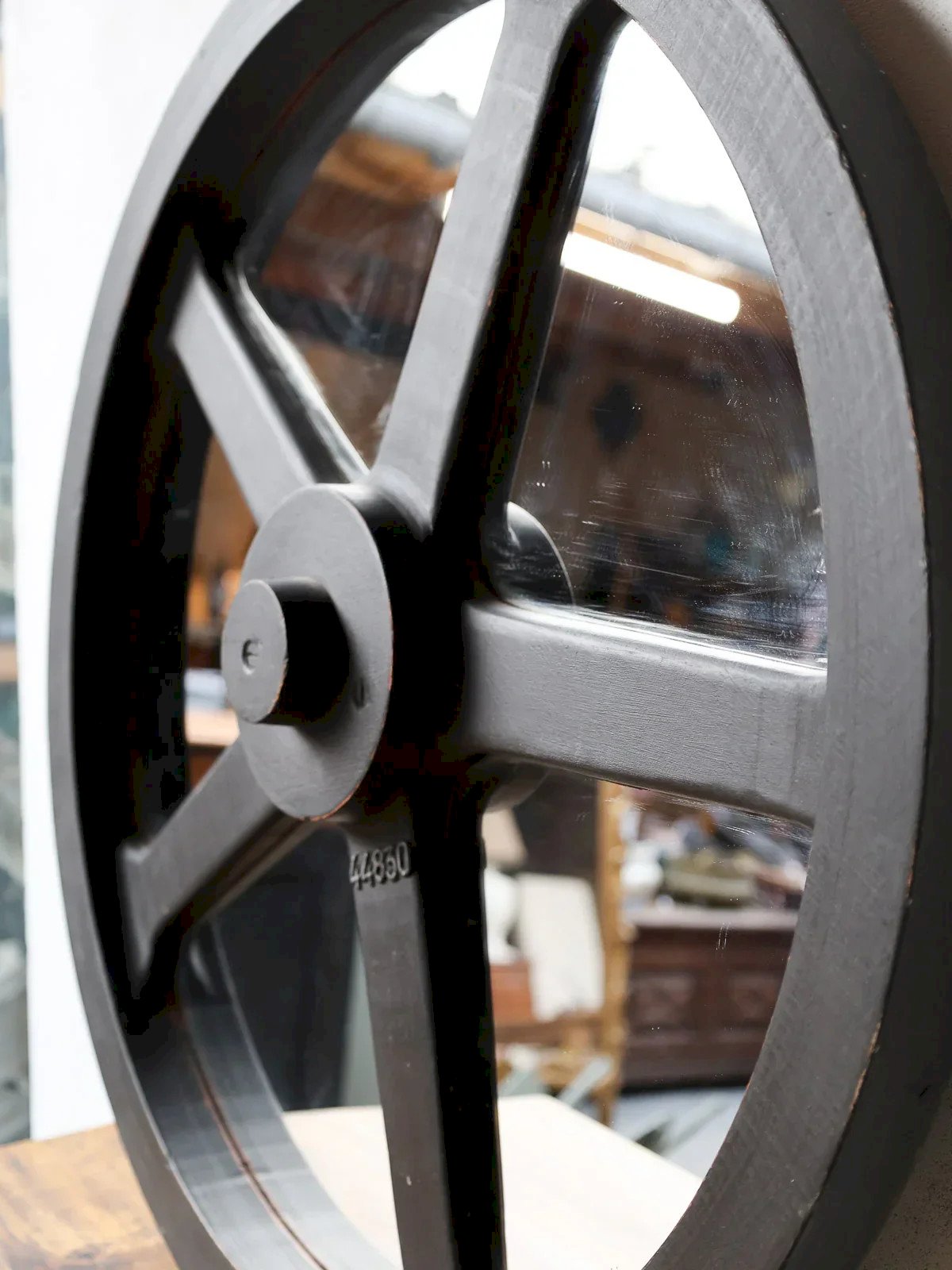 Enhance your interior with this black wood industrial mirror, whose large circle and thick frame provide architectural presence and sculptural depth. The central mirror, delicately framed by a smaller inner circle, creates a perfect point of balance above a console, in an entryway, or a living room. The black wood, with a matte finish, asserts a sleek and warm industrial style that interacts with contemporary materials. Ideal for structuring a wall and multiplying light. Height: 71.5 cm Width: 15 cm Length: 71.5 cm Condition: Used: An item that has been used. The item shows some superficial signs of wear... Used: An item that has been used. The item shows some superficial signs of wear, fully operational and functioning correctly. It may be a demonstration model or an item returned to the store after a short period of use. Possible imperfections. Brand: Debongout Type: Thrifted product Material: Wood, Glass Style: Contemporary