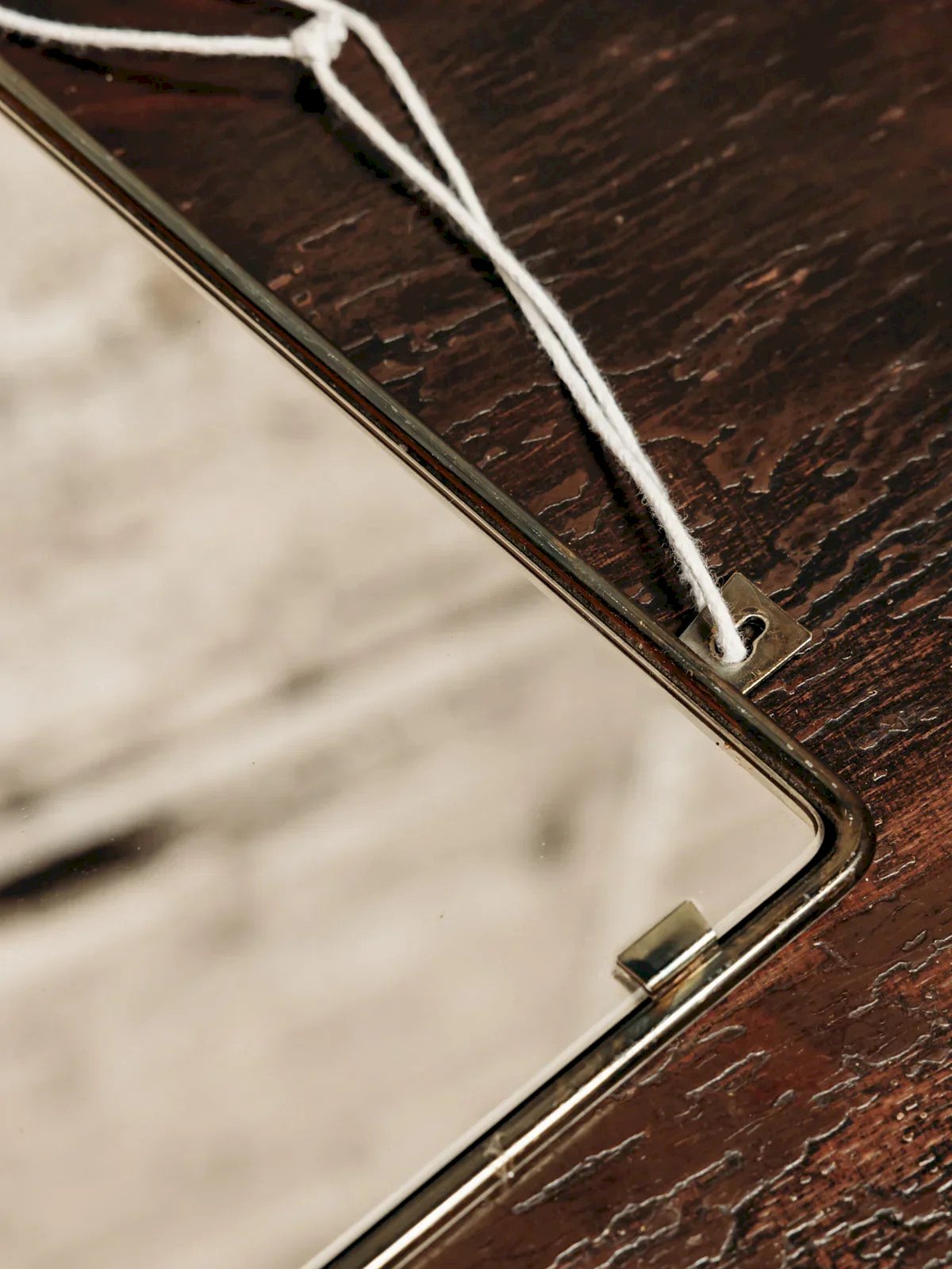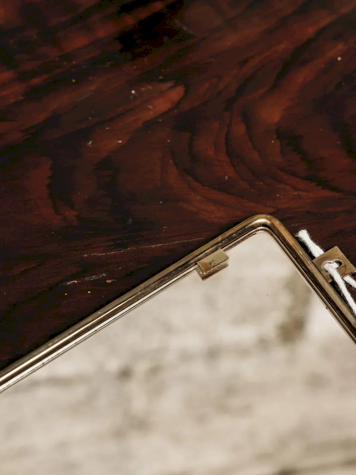 This small rectangular mirror with a golden metal frame adds an elegant and delicate touch to your decor. Its clean design and gold finishes give it a timeless charm, perfect for enhancing a wall discreetly. Easy to hang thanks to its small hooks or natural string, it easily finds its place in an entryway, a bedroom, or a reading nook. Alone or in combination with other mirrors, it beautifully reflects light and visually enlarges the space. Length: 36 cm Width: 30 cm Condition: Used: Item has been used. Item shows some superficial signs of wear... Used: Item has been used. Item shows some superficial signs of wear, fully operational and functioning properly. It may be a demonstration model or an item returned to the store after a short period of use. any possible imperfections. Brand: Debongout Type: Thrifted Product Material: Metal, Glass Style: Contemporary