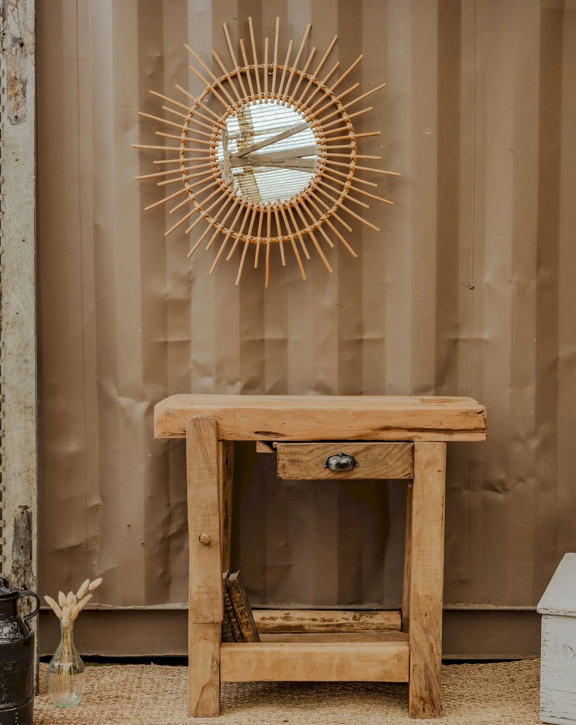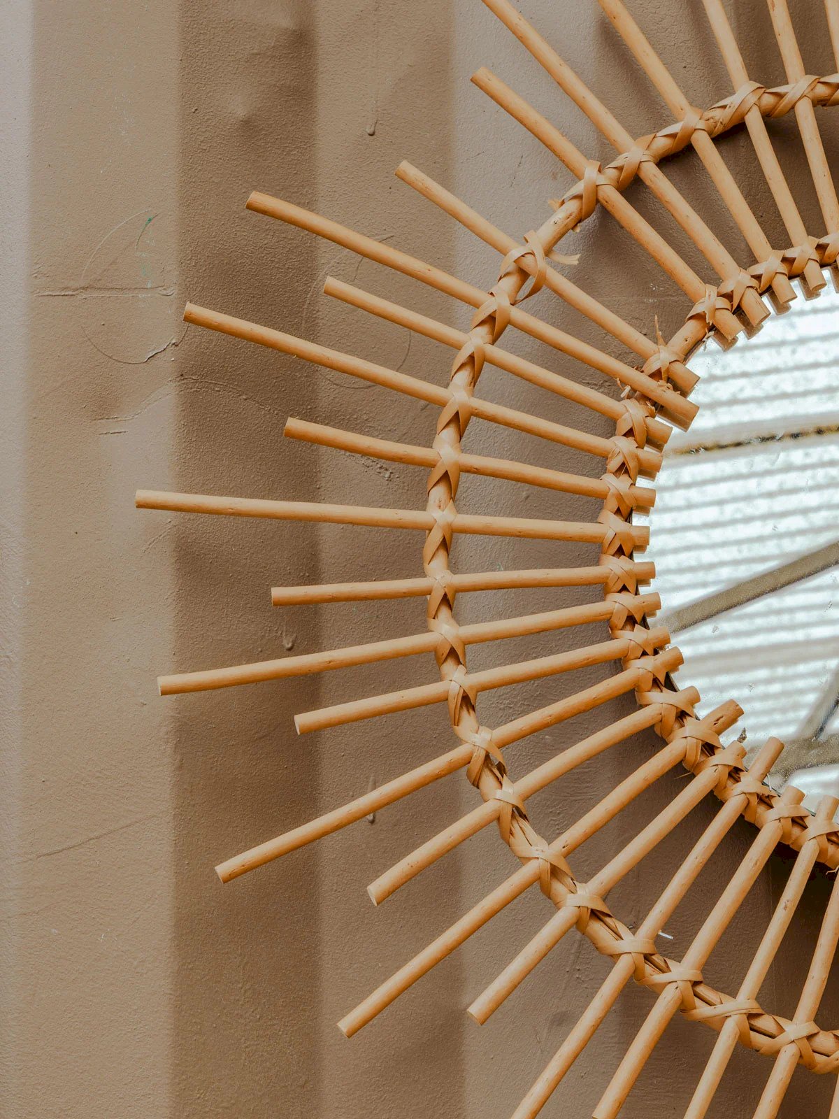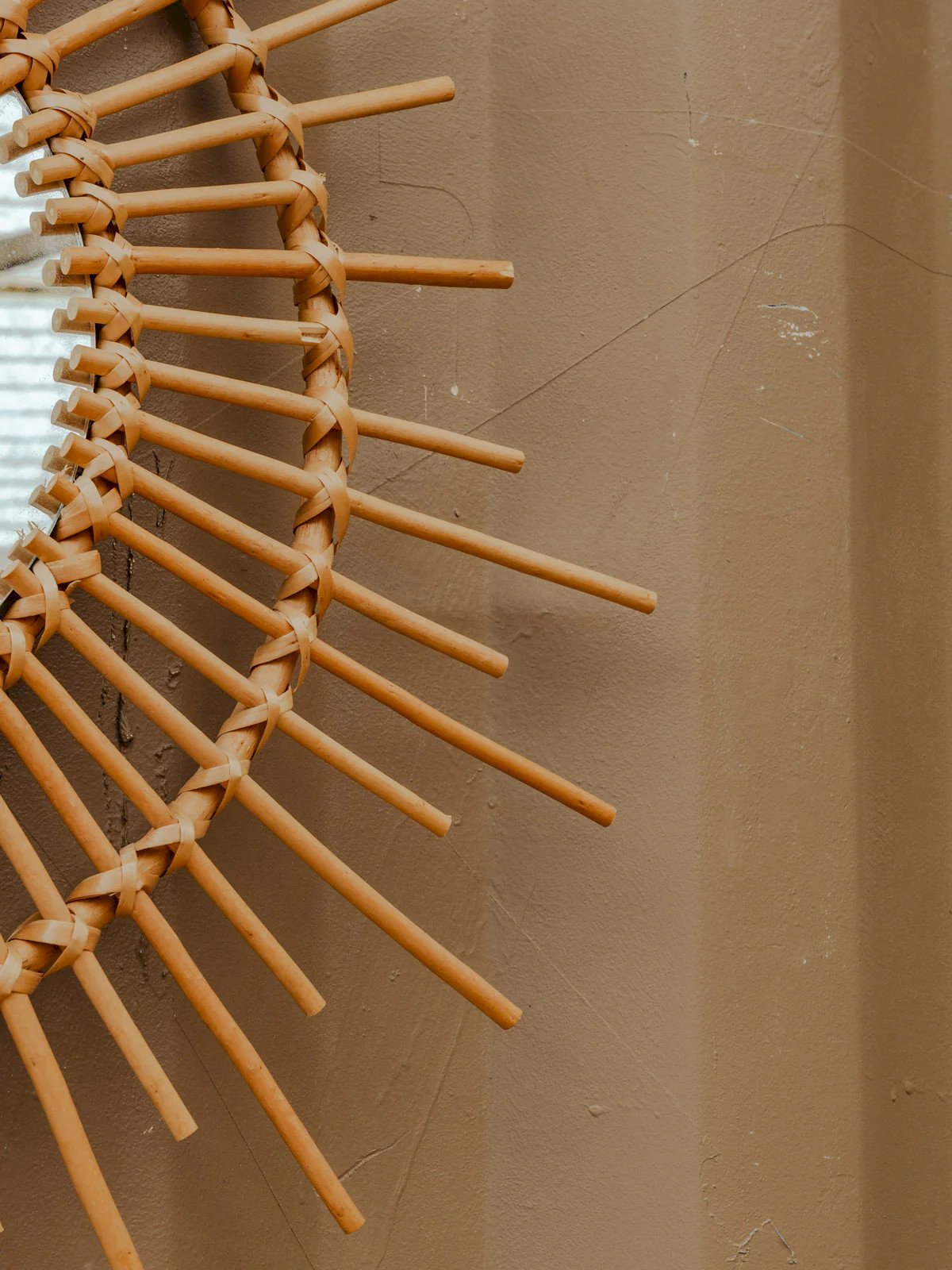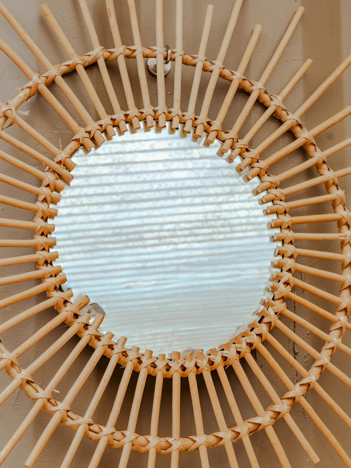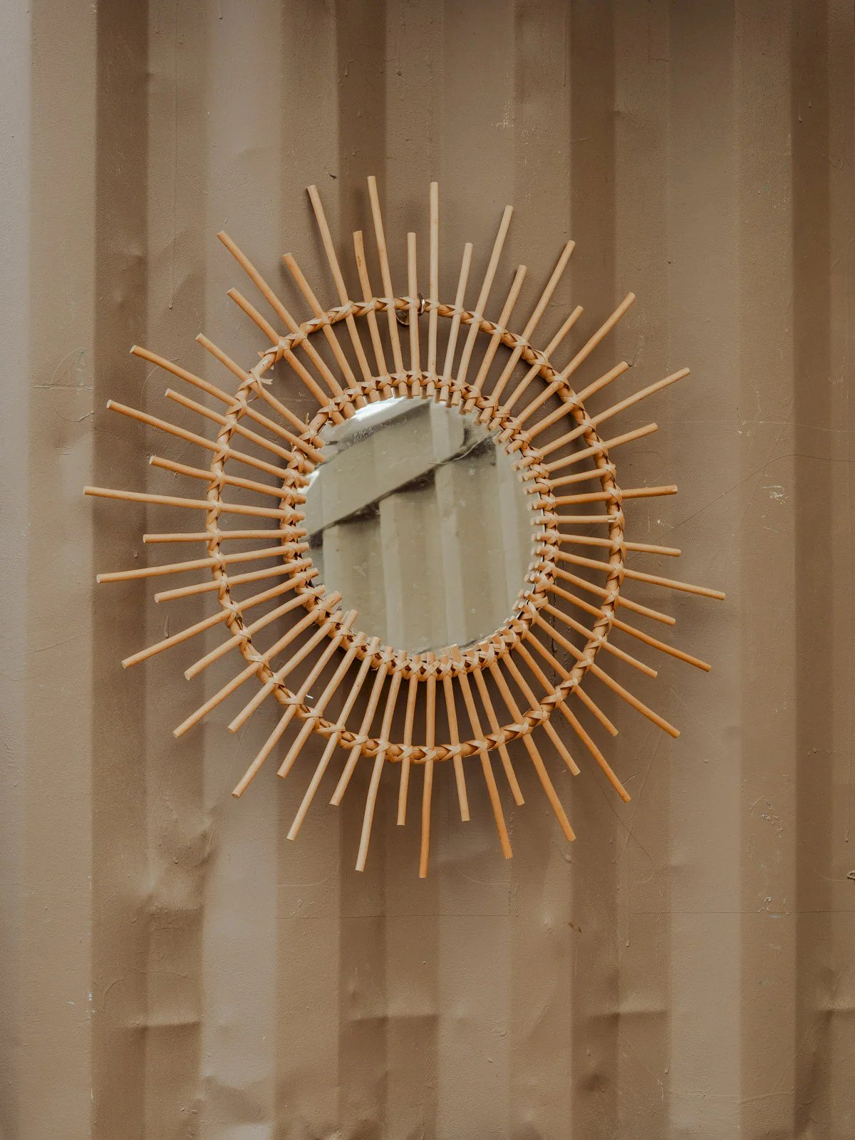 Enhance your interior with this rattan sun mirror, whose structure adds a natural and elegant touch. Its presence diffuses light and creates an ideal focal point above a console, sofa, or in an entrance, establishing a warm and bohemian atmosphere. The mirror contrasts the raw material of rattan with a refined silhouette, perfect for visually enlarging a space and highlighting an organic decor. Total diameter: 76 cm Thickness: 2 cm Mirror diameter: 29.5 cm Condition: Used item: An item that has been used. Item showing some superficial signs of wear, fully operational and functioning correctly. It may be a demonstration model or a returned item after a short period of use. Any imperfections. Brand: Debongout Type: Vintage item Material: Rattan Style: Contemporary