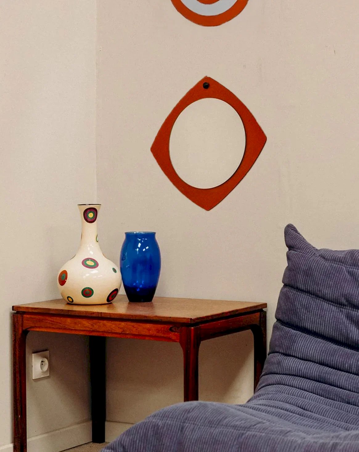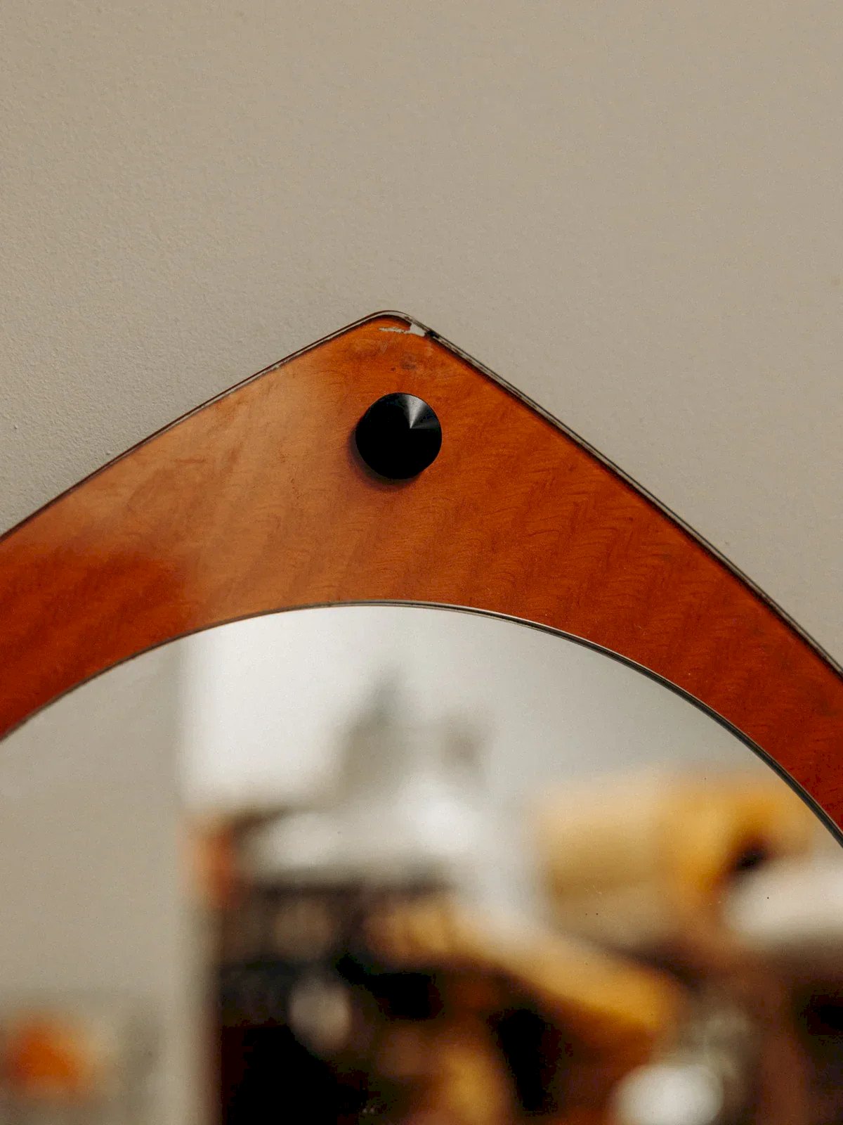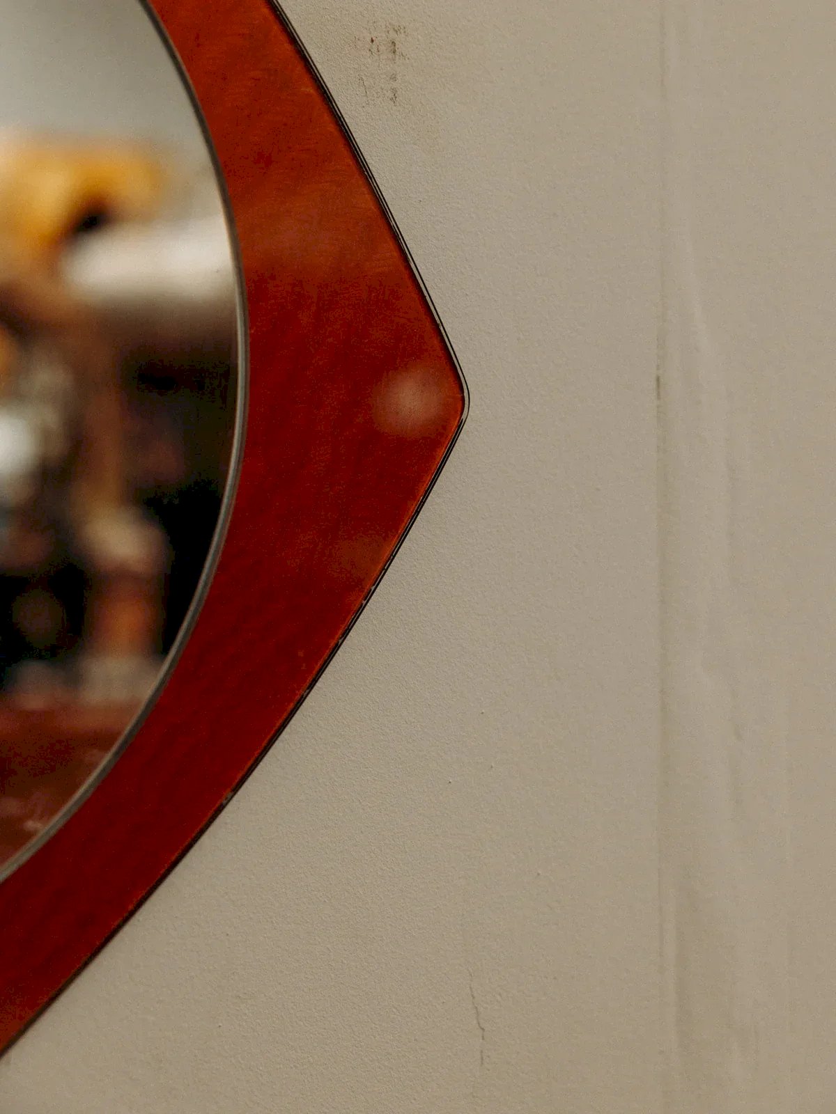This round mirror with a diamond-shaped border adds a beautiful touch of elegance to your interior. Its warm brown hue gives character, while its reflective surface gently captures light. Perfect for dressing up an entry hall, a bedroom, or a vanity, it combines utility and style with simplicity. A small decorative detail that makes all the difference. Height: 36 cm Diameter: 29 cm Condition: Used: Item has been used. Item shows some superficial signs of wear, ...Used: Item has been used. Item shows some superficial signs of wear, fully operational and functioning correctly. It may be a demonstration model or an item returned to the store after a short period of use. any possible imperfections. Brand: Debongout Type: Vintage product Material: Glass Style: Contemporary