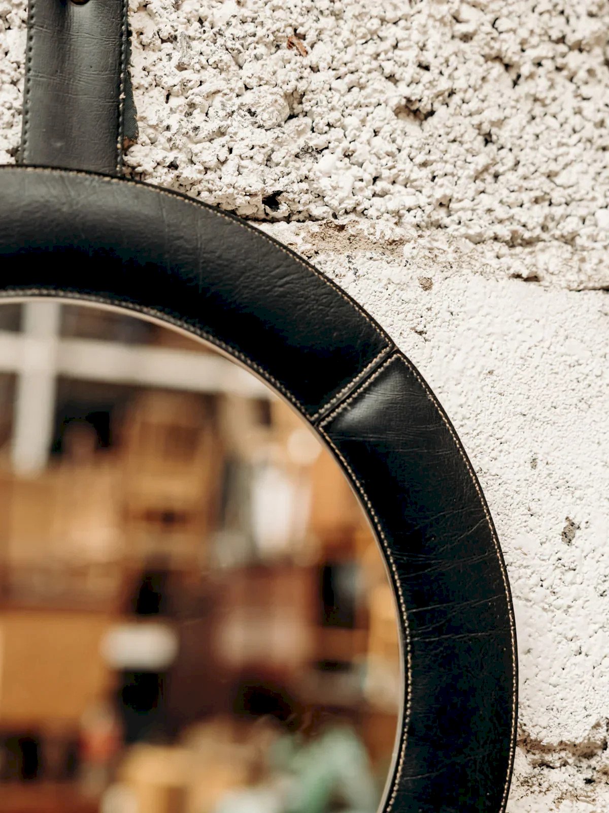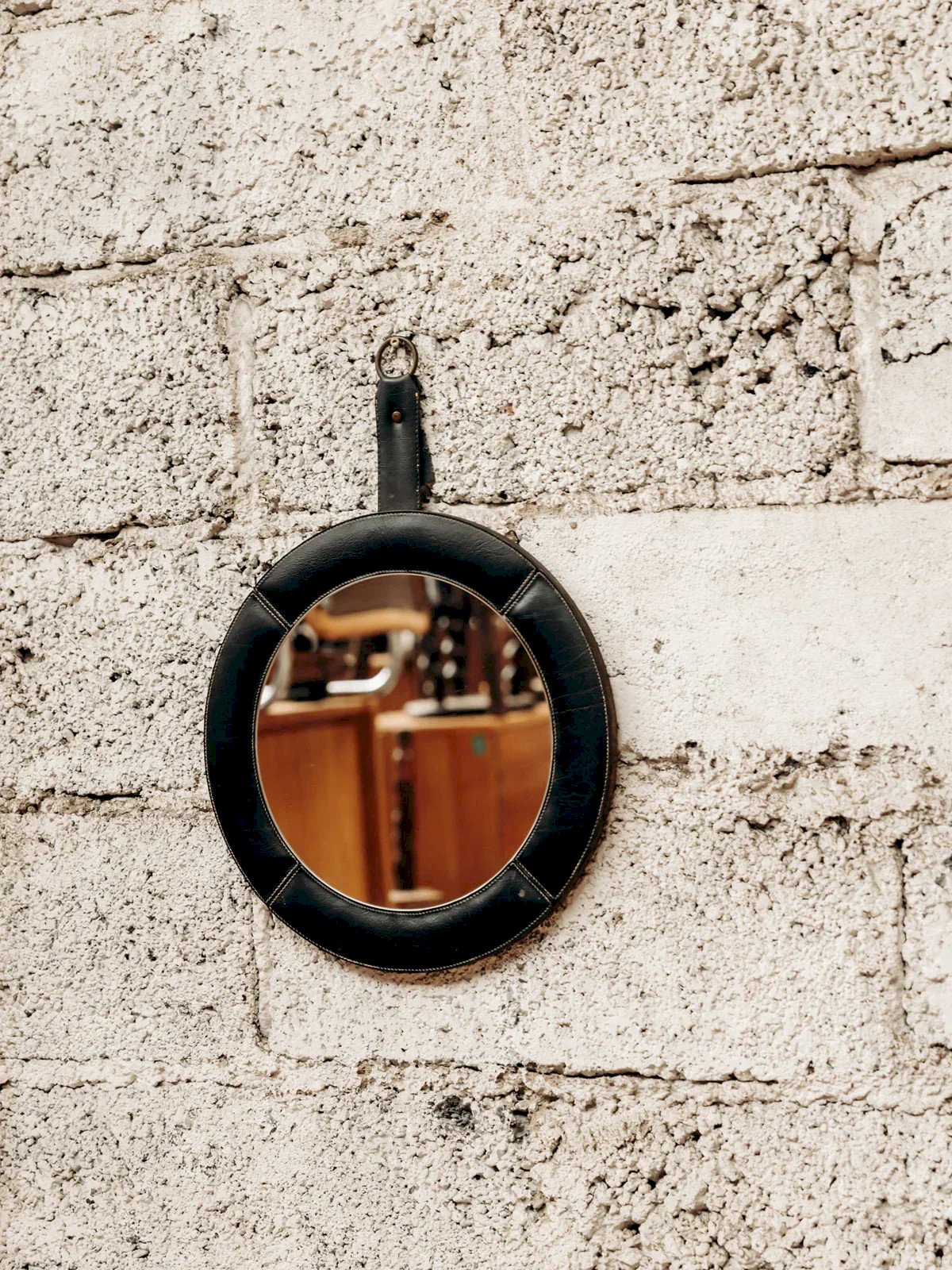 Discover this round leather mirror, an essential item to add a touch of elegance and modernity to your interior. Its sleek design, enhanced by a round hook and a leather strap, makes it both a practical and aesthetic accessory. Perfect for visually enlarging your space, it harmoniously fits into all rooms of the house. A true style statement, this mirror will appeal to fans of refined decor. Diameter: 36 cm Condition: Used: Item that has been used. Item shows some superficial signs of wear, fully operational and functioning correctly. It may be a demonstration model or an item returned to the store after a short period of use, with potential imperfections. Brand: Debongout Type: Thrifted product Material: Leather, Glass Style: Contemporary
