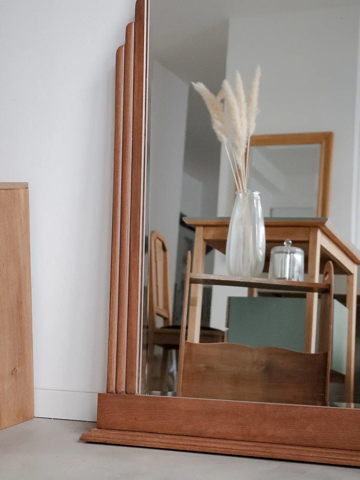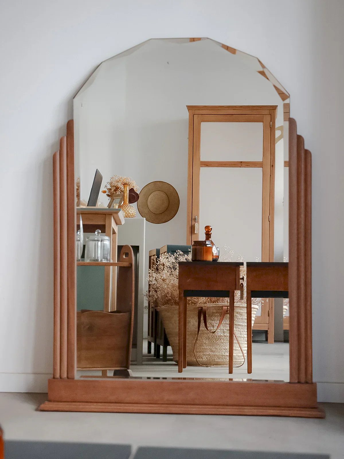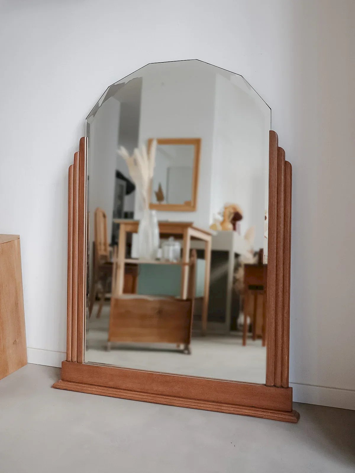 Enhance your interior with this Art Deco mirror made of stained beech, where a geometric bevel elegantly punctuates the upper part. To be placed, its vertical format offers a generous presence, ideal for a fireplace, an entrance, or to visually enlarge a room. The wooden frame highlights the surface of the mirror, with the upper edge revealing the bare glass for a graphic and contemporary touch. Light signs of time on the mirror contribute to its charm. Length: 88 cm Width: 5 cm Height: 114 cm Condition: Used: Item has been used. Item shows some superficial signs of wear, ...Used: Item has been used. Item shows some superficial signs of wear, fully operational and functioning correctly. It may be a display model or an item returned to the store after a short period of use. Any imperfections. Brand: Debongout Type: Vintage product Material: Beech Style: Contemporary