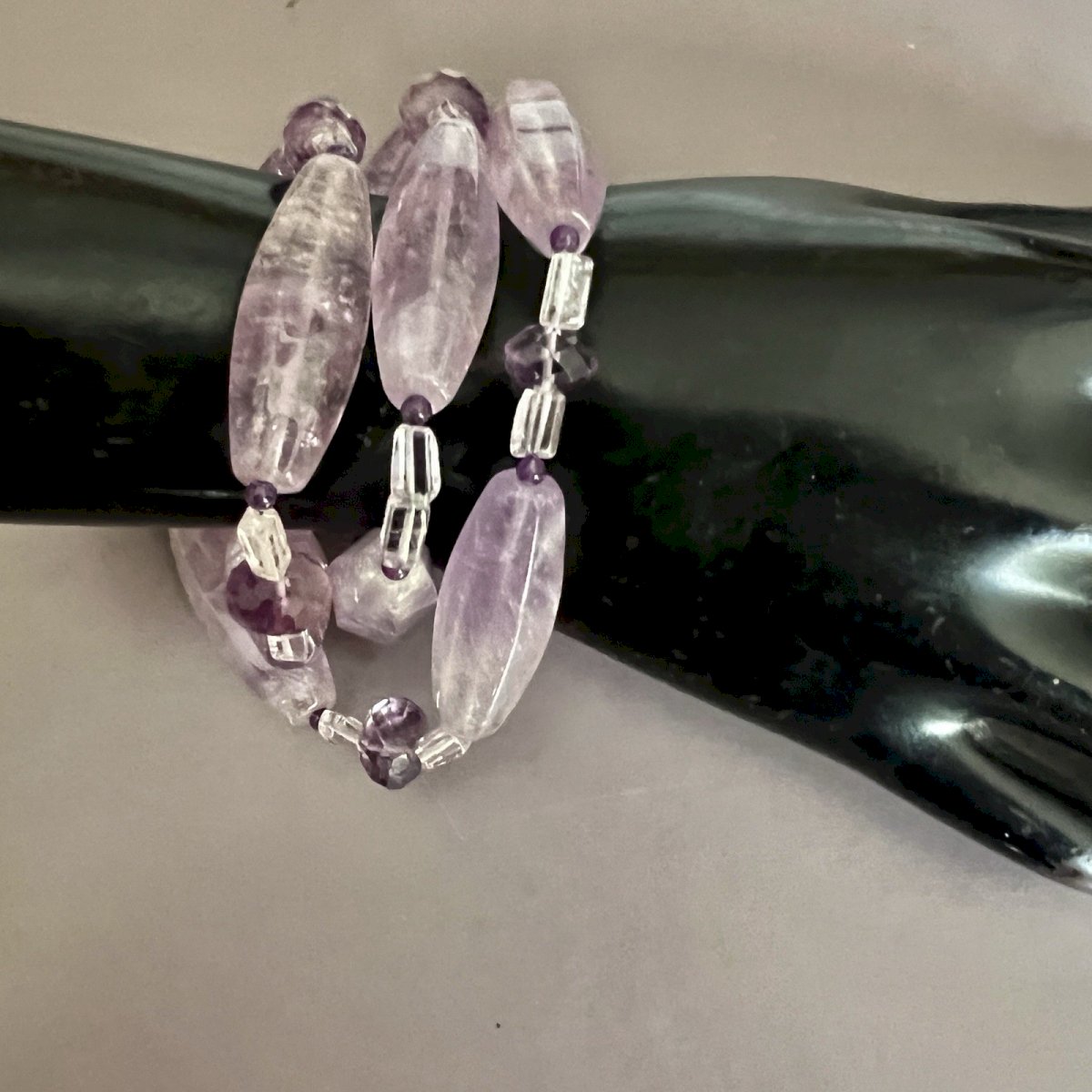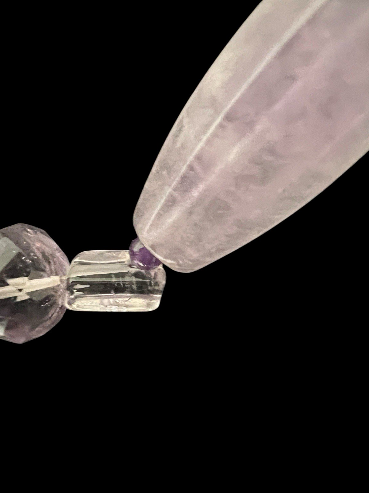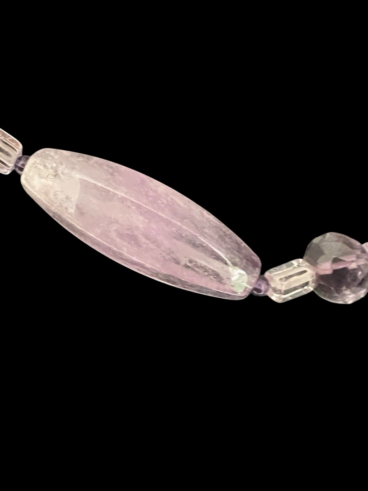 Amethyst necklace consisting of long, oblong, polished beads, measuring approximately 4 cm in length, in a translucent light purple shade. Each long bead is bordered with mini round amethyst beads at its ends. These mini beads are followed by a faceted beveled bead, itself framed by small rectangular rock crystal beads. There is a drilling defect on one rock crystal bead: the thread is slightly visible due to a small lack of material caused by drilling too close to the wall. The necklace has a total length of about 63 cm and weighs 104 g. It is equipped with a solid silver clasp, the authenticity of which has been verified by an acid test on the touchstone. Condition: Used: Item that has been worn. ...Used: Item that has been worn. any possible imperfections. Dominant stone: Amethyst Type: Pearl necklace Dominant color: Green Material: Stone Theme: Beads Type: Pearl necklace