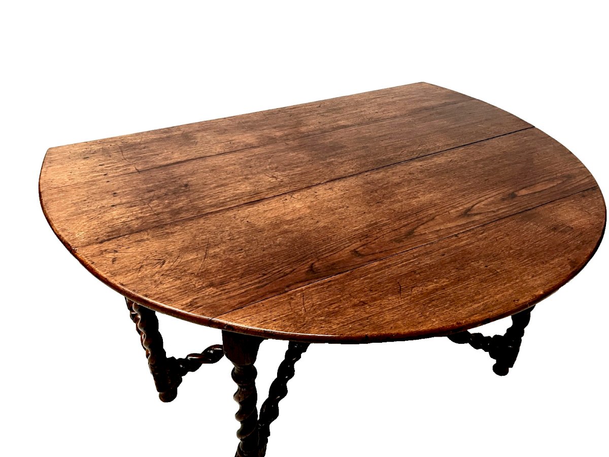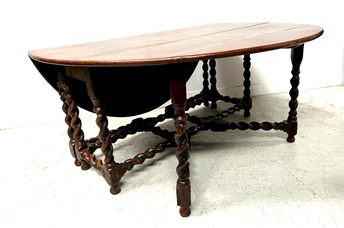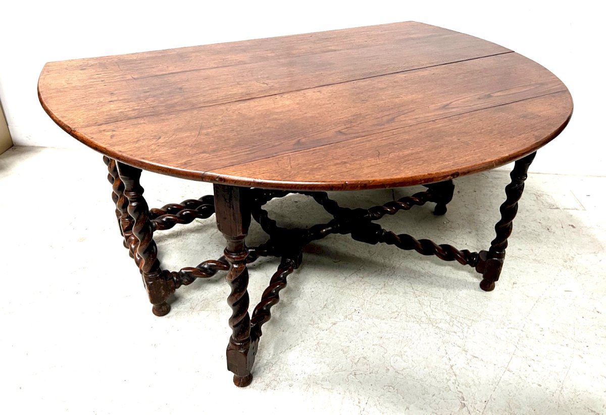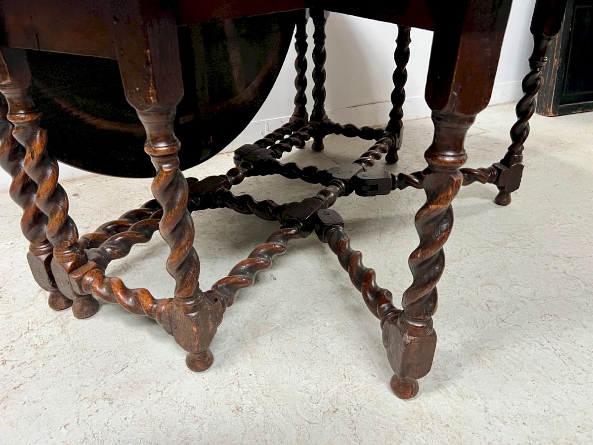 Imposing Gateleg table in solid oak with two leaves. Four cross legs in twisted oak. Once folded, you can use it as a console. Very good condition. Open dimensions H 75 x L 175 x W 158 cm. Folded table H 75 x L 158 x W 58 cm. 19th-century period. Type: Table Period: 19th century and earlier Origin: France Height: 75 Style: English Length: 175 Width: 158.