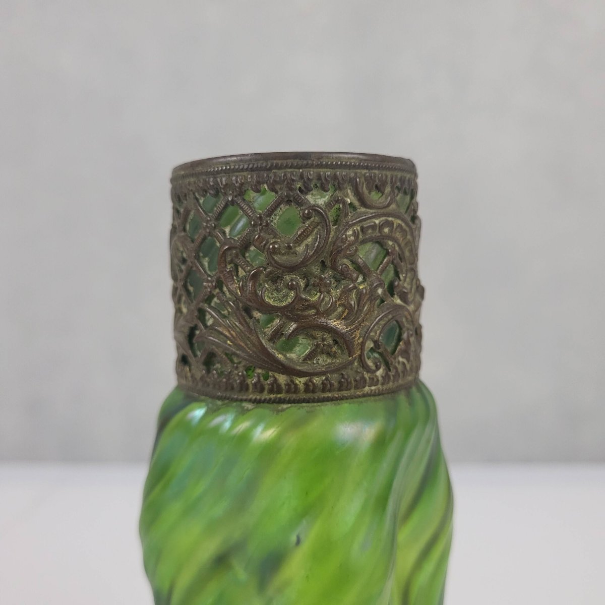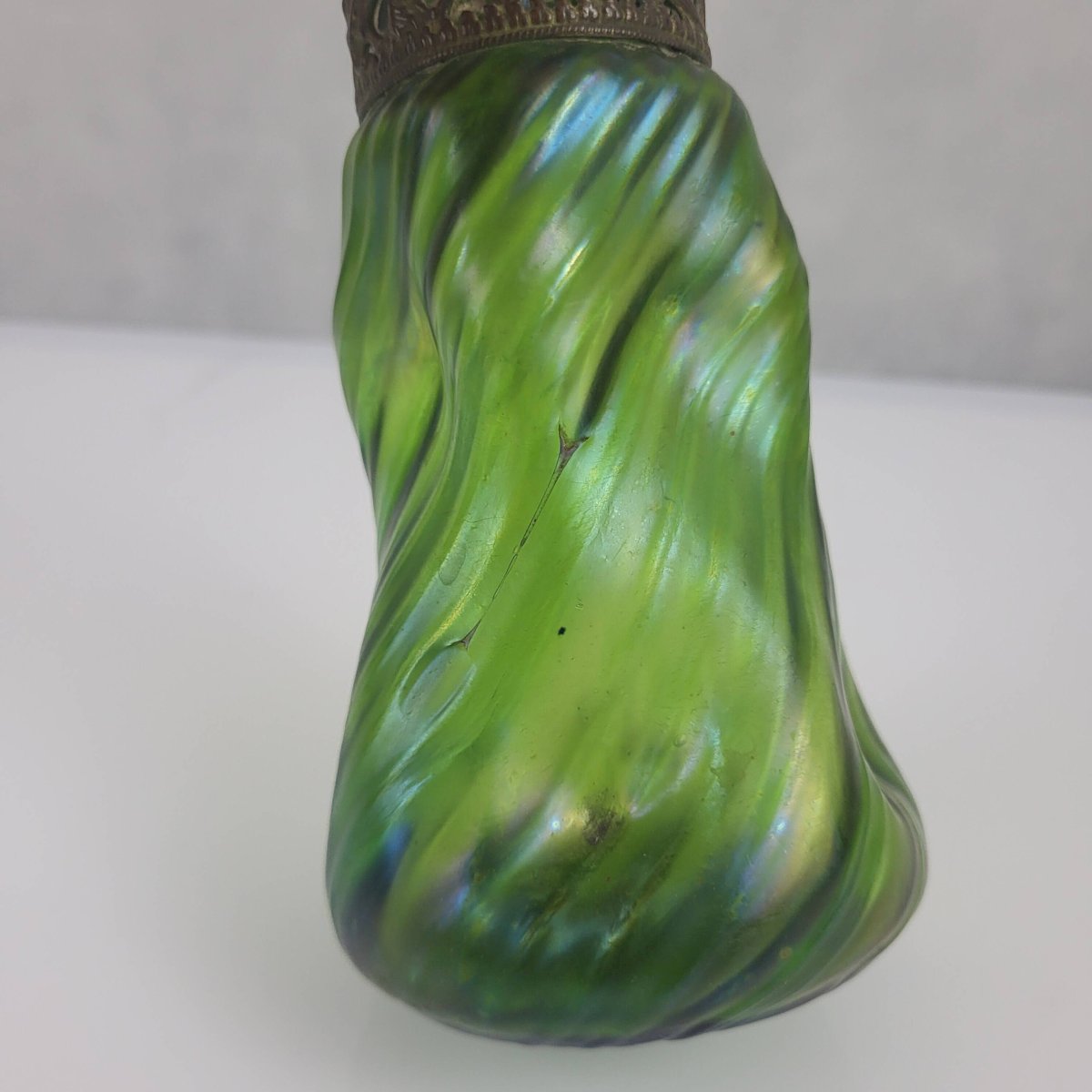 Iridescent glass vase in the Art Nouveau style, reminiscent of the productions of Loetz. Gilded patinated brass mount. Height 16 cm. Diameter 8.5 cm. In good condition, there is a defect resembling a very discreet hairline crack in the glass.