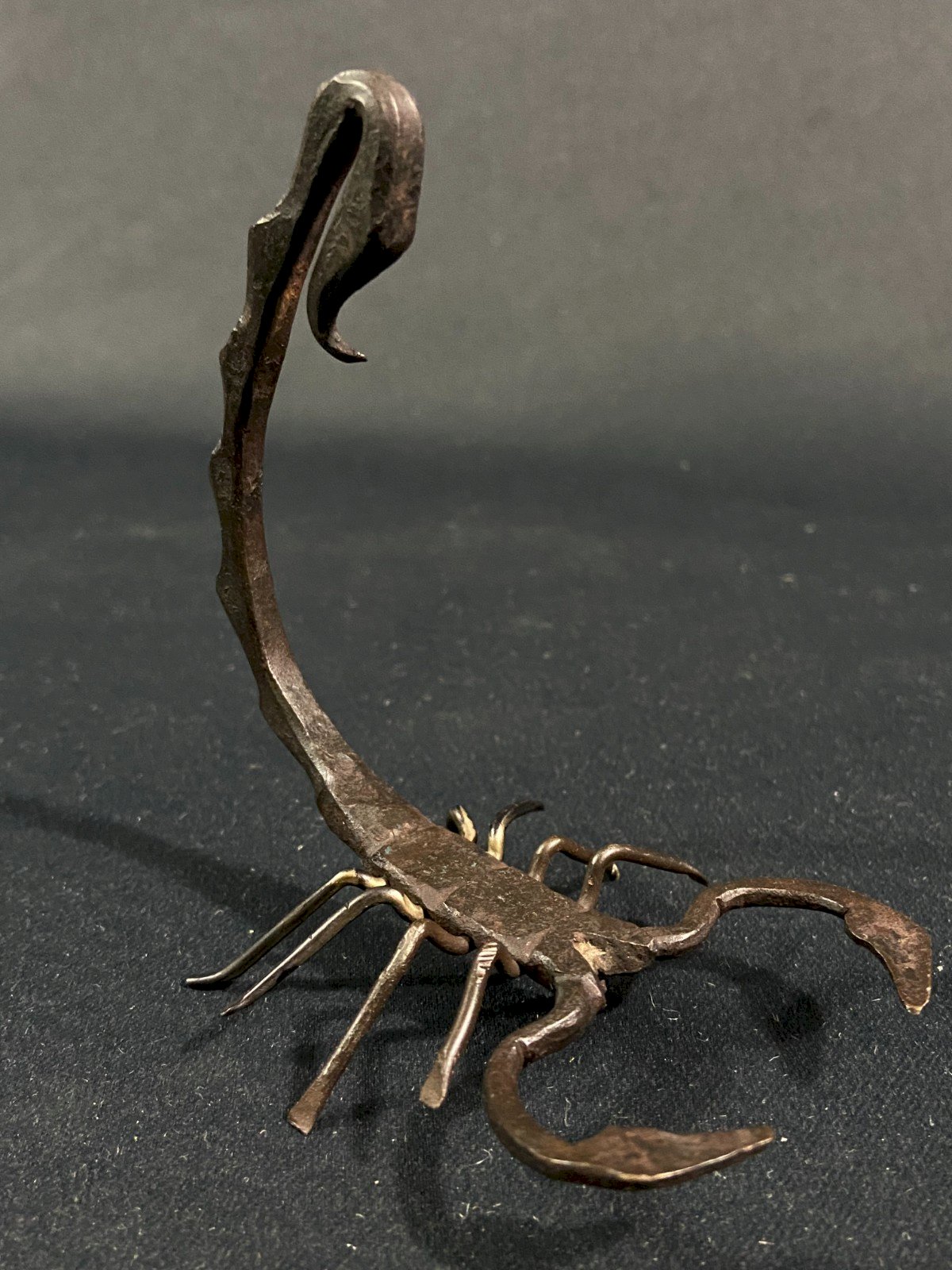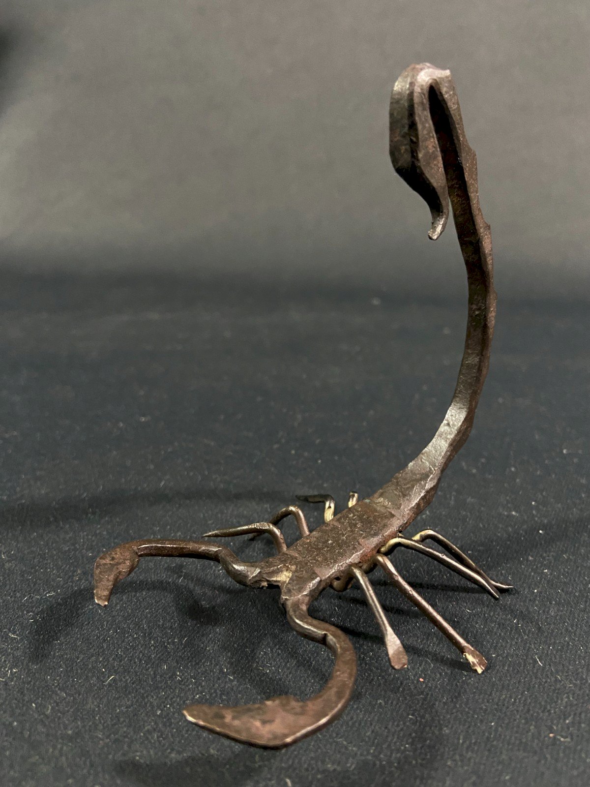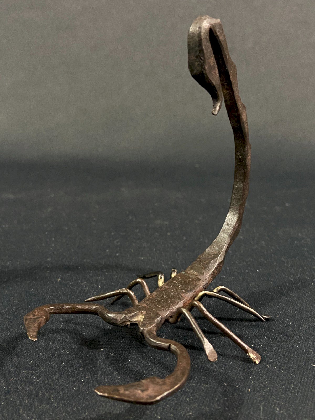 Handcrafted wrought iron piece representing a scorpion. Morocco, 1970s Handmade ironwork, fully forged and hammered, beautiful natural brown patina. Max dimensions: Height 10.2 x Length 9.2 x 6.2 cm Weight: 51 grams Very careful shipping worldwide Authenticity: Original Type: Showcase item, Decorative Period: 20th-century design Origin: Africa Country of origin: Morocco Subtype: Figurine, Statue Material: Wrought iron Style: 1970