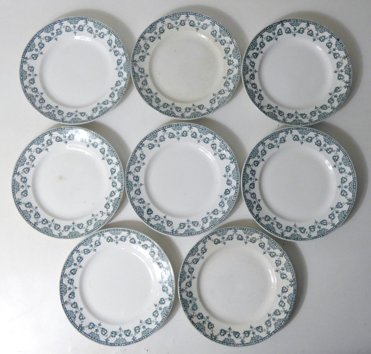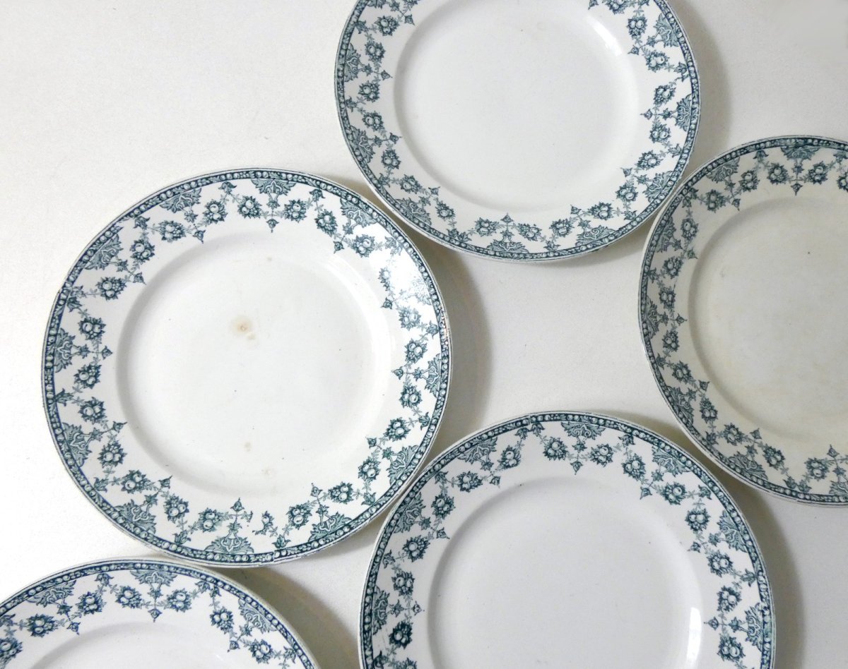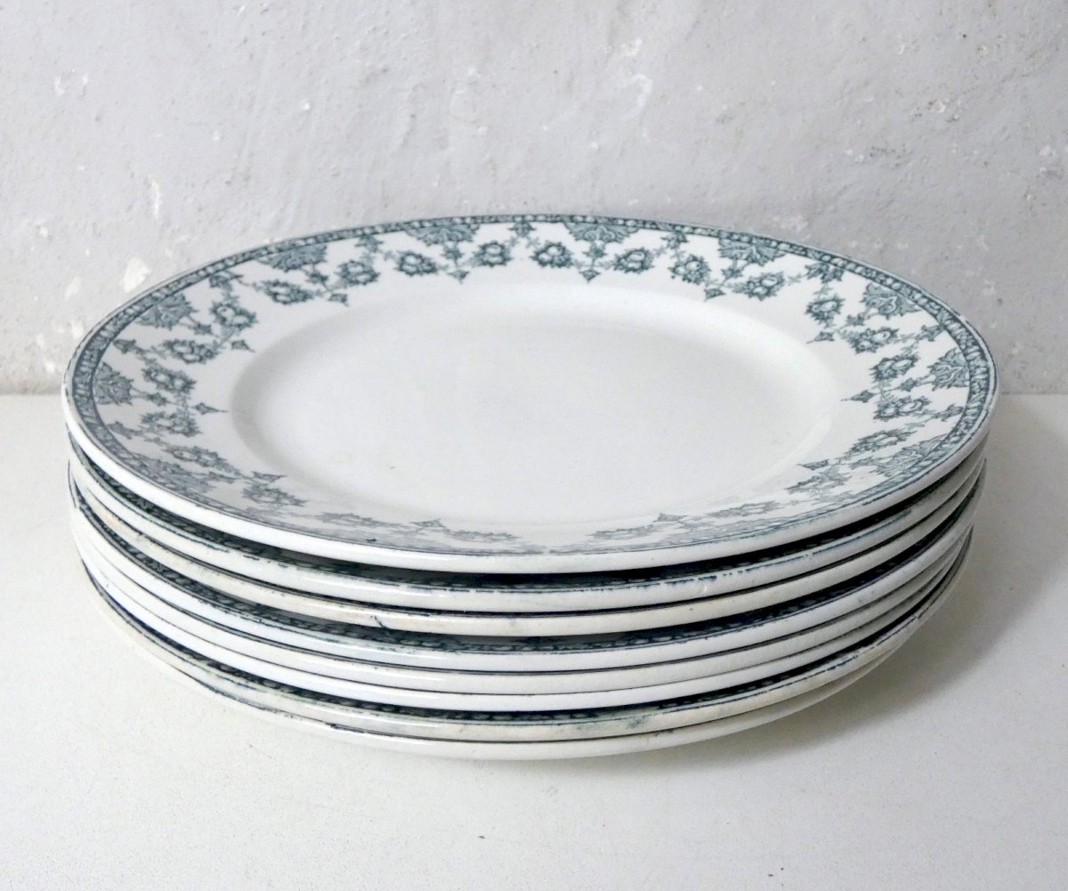 Ironstone. 8 flat plates. NORMAND model, Ste AMANDINOISE manufacture. Diameter: 23.5 cm. Height: 2.5 cm. In very good condition, with some signs of aging, patina consistent with the age of the plates. Very pretty Art Deco model, midnight blue.
