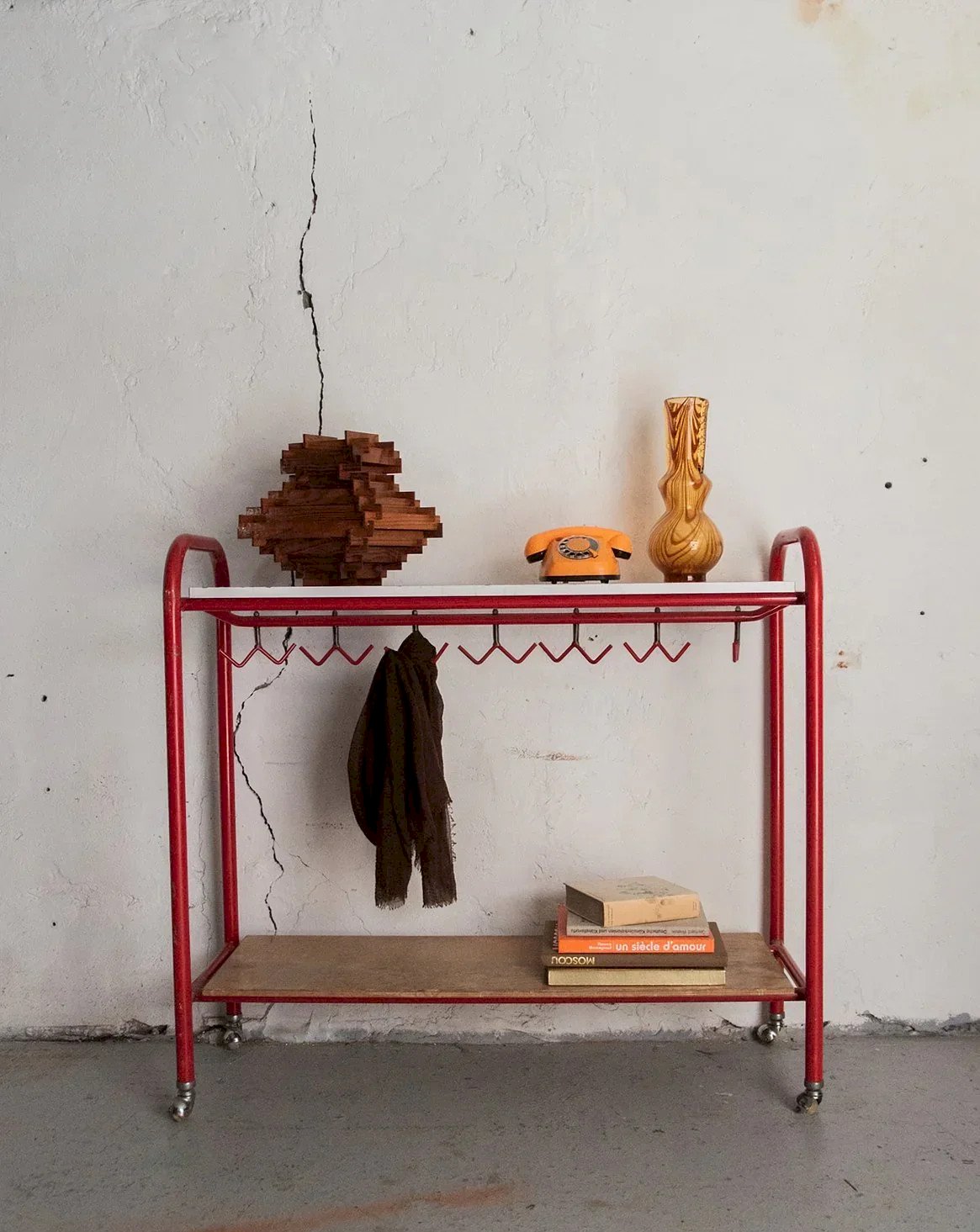 Add an industrial and practical touch to your interior with this shelf featuring a red metal structure and wooden shelves. Equipped with 7 hooks, it is ideal for hanging jackets, bags, or scarves in the entryway or bedroom. Mounted on 4 wheels, it moves easily according to your needs. Some signs of wear give it authentic charm. Perfect for an entryway, workshop, or versatile space. Length: 120 cm Height: 110.5 cm Depth: 44 cm Condition: Used: Item has been used. Item shows some superficial wear marks, ... Used: Item has been used. Item shows some superficial wear marks, fully operational and functioning properly. It may be a demonstration model or an item returned to the store after a short period of use. Any imperfections. Brand: Debongout Type: Thrifted product Material: Metal, Wood Style: Contemporary Custom: Shelves