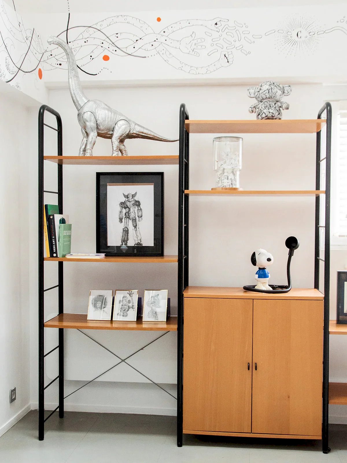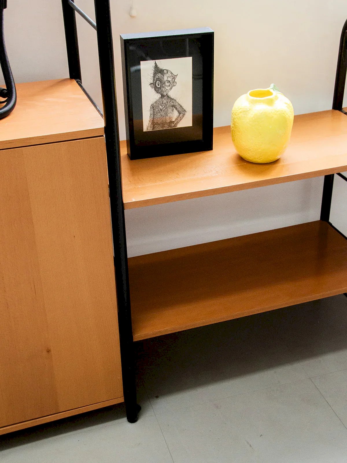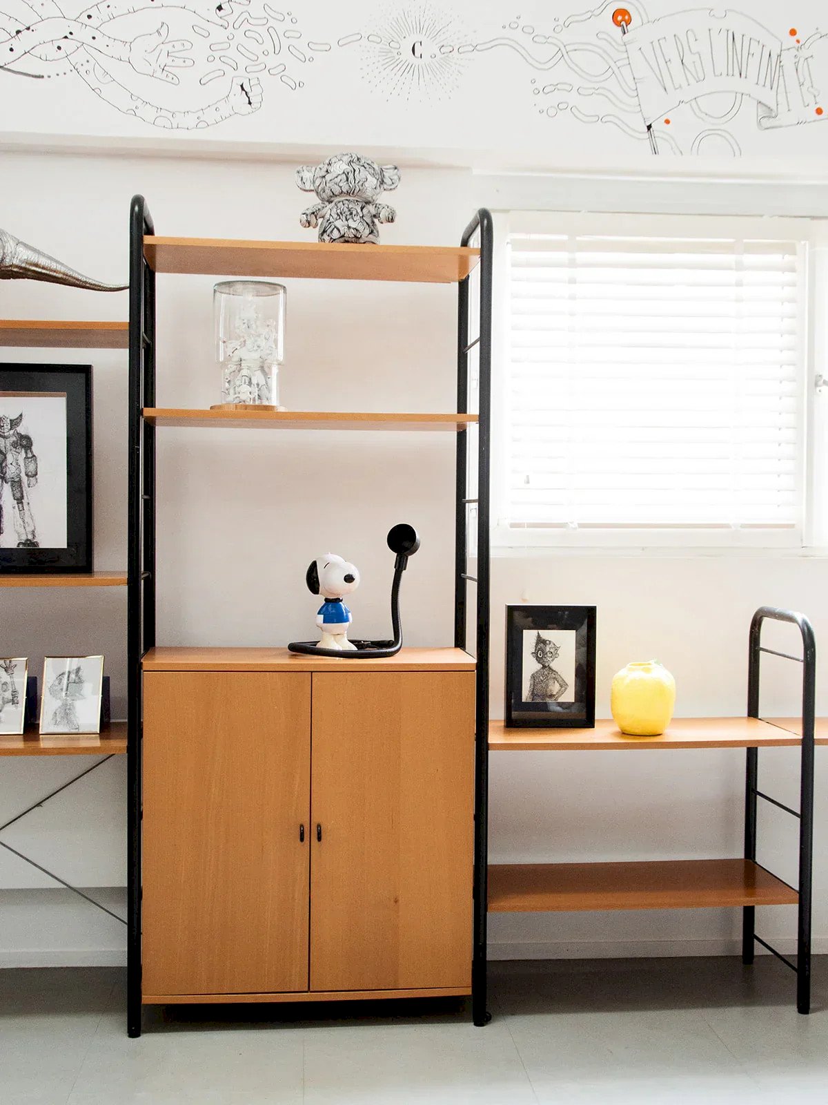 Discover these shelves with a sleek design, combining a black metal structure with wooden shelves and doors. The shelves are modular and easy to adjust thanks to an ingenious clipping system. Two closed compartments allow for discreet storage. This model can be assembled with two other shelves available on our site. Perfect for creating a custom, functional, and aesthetic composition. Length: 251.5 cm Height: 200 cm Depth: 41 cm Condition: Used: Item that has been used. Item showing some superficial signs of wear, ...Used: Item that has been used. Item showing some superficial signs of wear, fully operational and functioning correctly. It may be a display model or an item returned to the store after a short period of use. Any imperfections. Brand: Debongout Type: Thrifted product Material: Metal, Wood Style: Contemporary Custom: Shelves