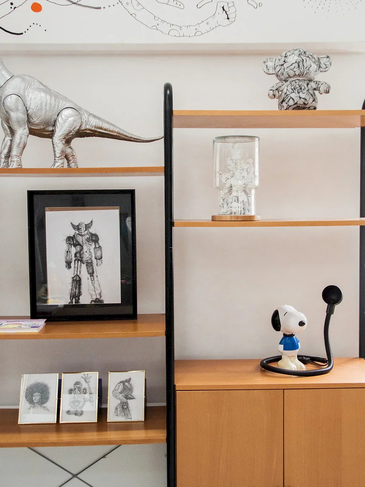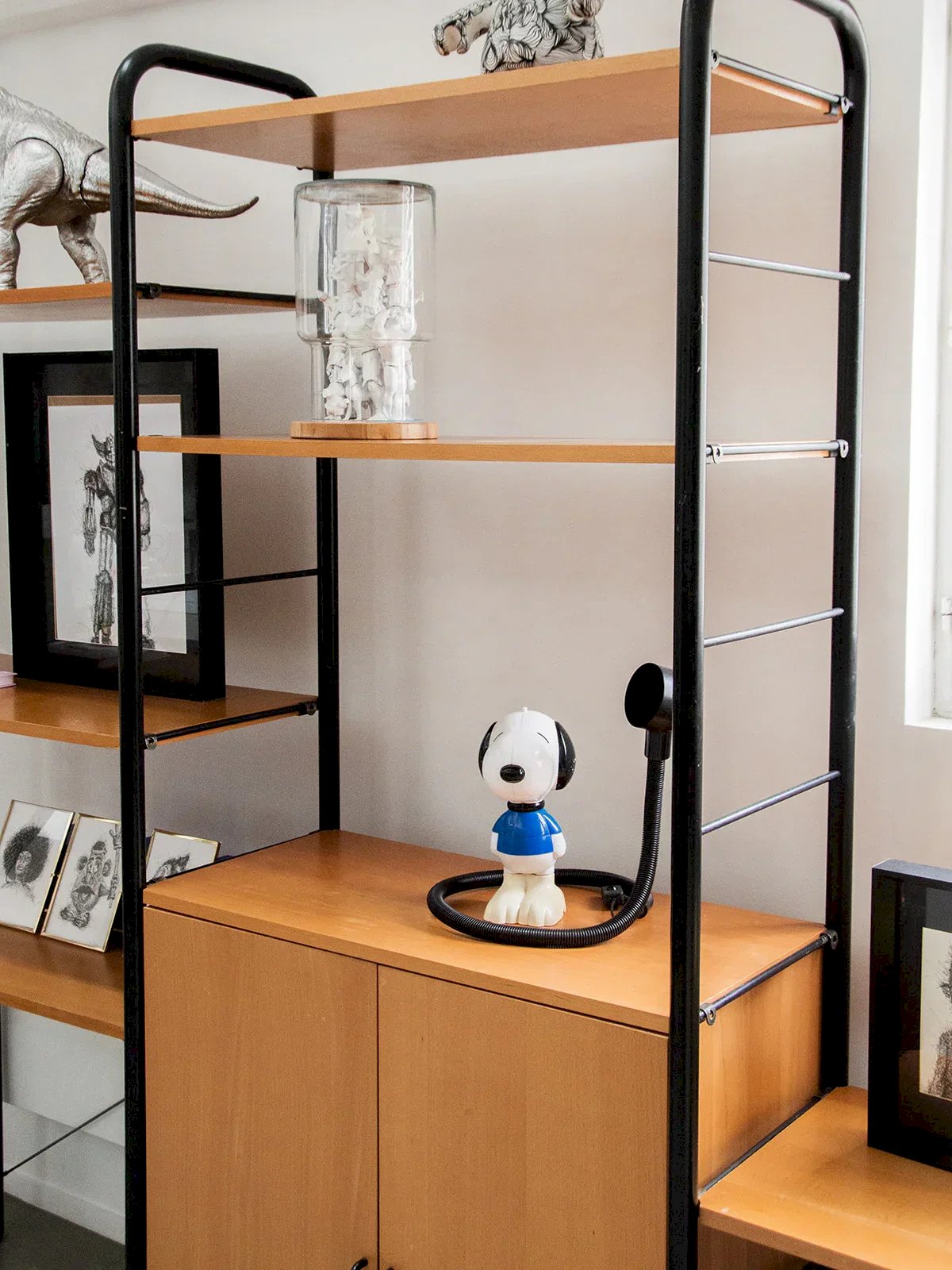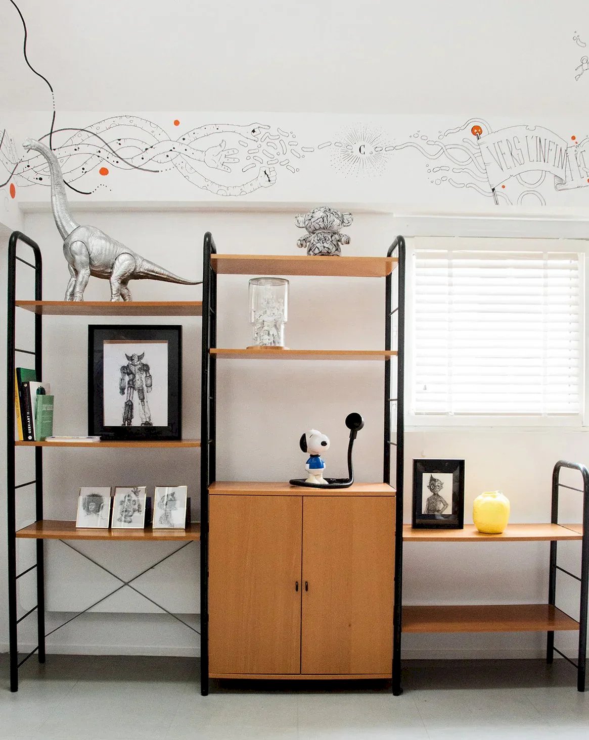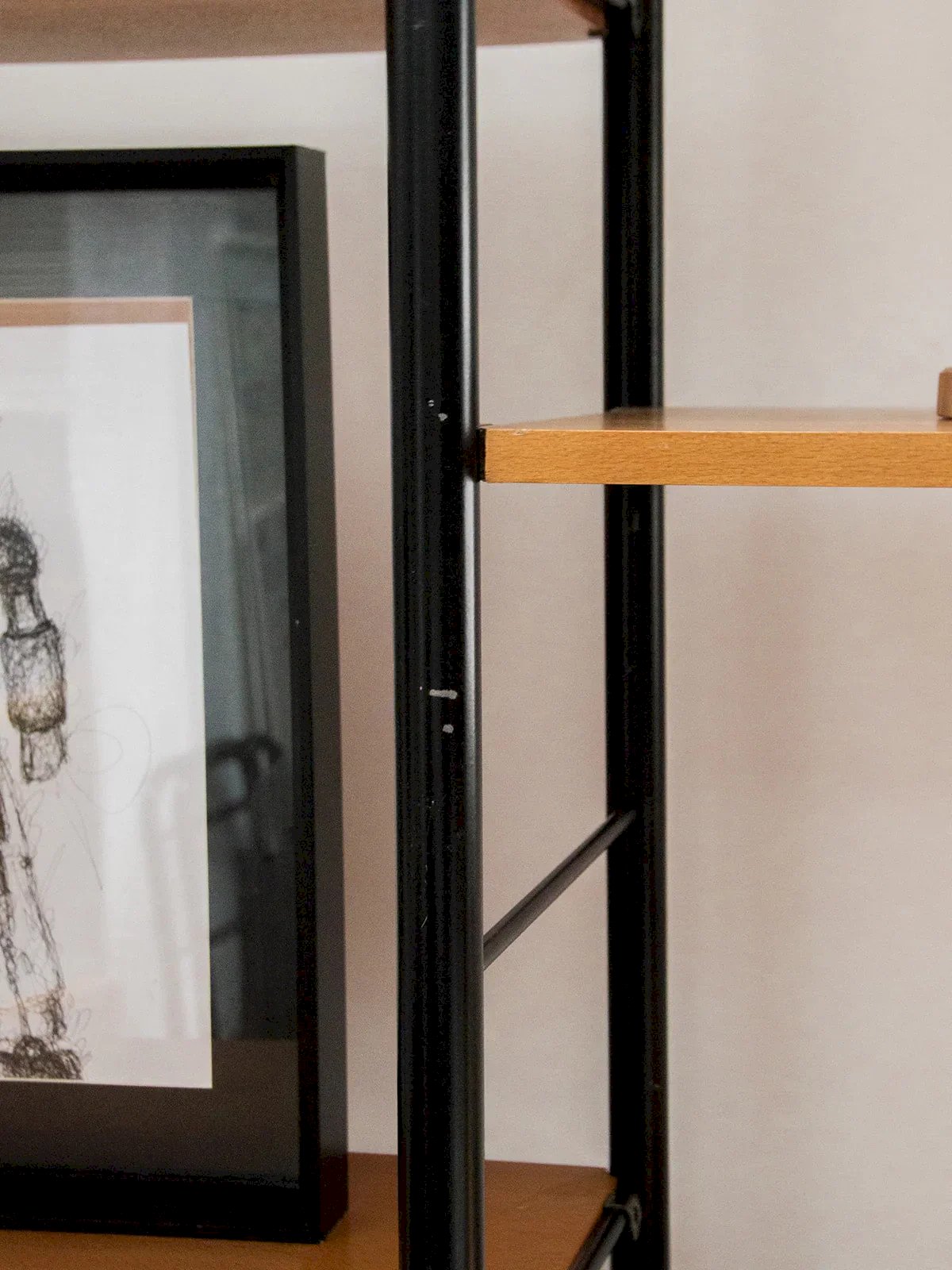 Discover these shelves with a sleek design, combining a black metal structure with wooden shelves and doors. The shelves are modular and easy to adjust thanks to an ingenious clipping system. Two closed compartments allow for discreet storage. This model can be assembled with two other shelves available on our site. Perfect for creating a custom, functional, and aesthetic composition. Length: 251.5 cm Height: 200 cm Depth: 41 cm Condition: Used: Item that has been used. Item showing some superficial signs of wear, ...Used: Item that has been used. Item showing some superficial signs of wear, fully operational and functioning correctly. It may be a display model or an item returned to the store after a short period of use. Any imperfections. Brand: Debongout Type: Thrifted product Material: Metal, Wood Style: Contemporary Custom: Shelves