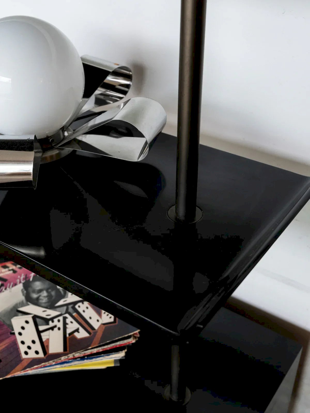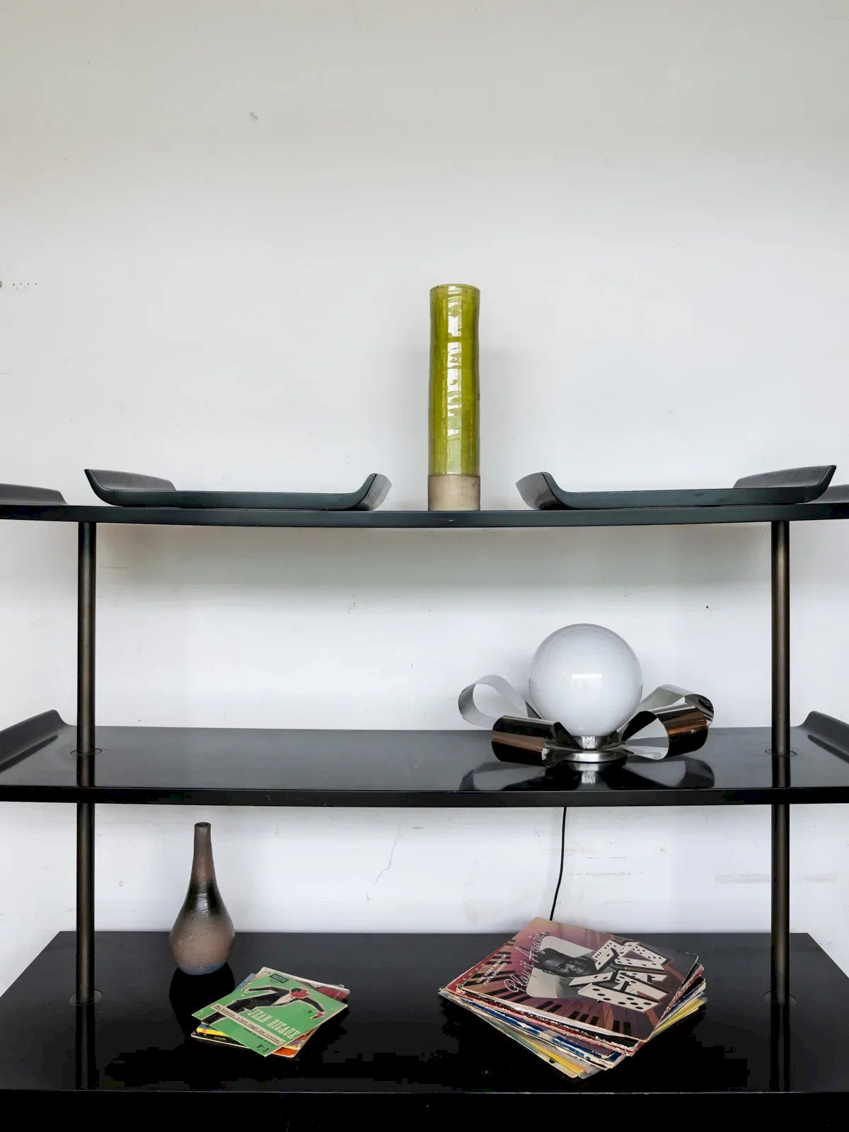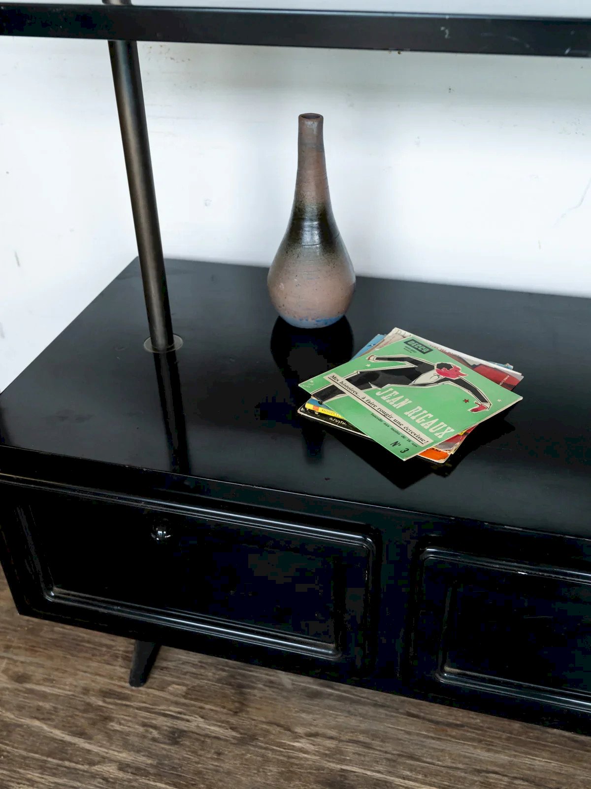 Alert nugget! This double-sided Japanese furniture combines elegance and functionality. With its sleek design and black lacquered finish, it adds a touch of sophistication to any space. Featuring a single drawer, a double drawer, and two shelves, it provides practical and well-organized storage space. Designed with sturdy steel tubes, it can also serve as a room divider, ideal for structuring and enhancing your interior. Web exclusive, the meeting will take place at your home! Length: 150 cm Width: 55 cm Height: 140 cm Condition: Used: Item that has been used. Item showing some superficial wear marks... Used: Item that has been used. Item showing some superficial wear marks, fully operational and functioning correctly. It may be a demo model or an item returned to the store after a short period of use, the possible imperfections. Brand: Debongout Type: Thrifted product Material: Wood Style: Contemporary Customized: Shelves