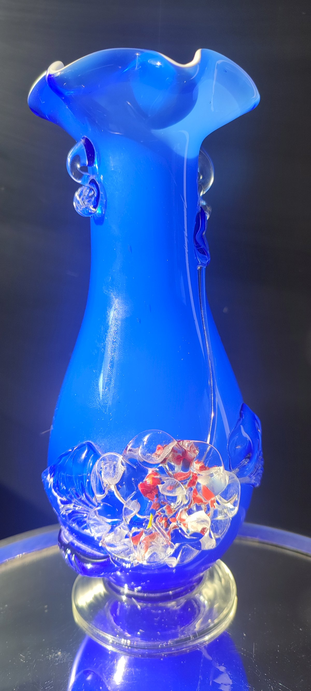 Italian handcrafted vase from the 60s/70s in perfect condition. This is a mouth-blown glass with an intense cobalt blue exterior and a white opaline interior. The pontil mark is clearly visible under the base, which attests to the cane work. The decoration is also adorned with a flower and applied leaves in relief and a flared neck.