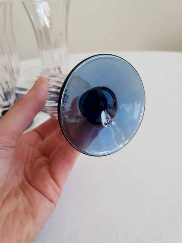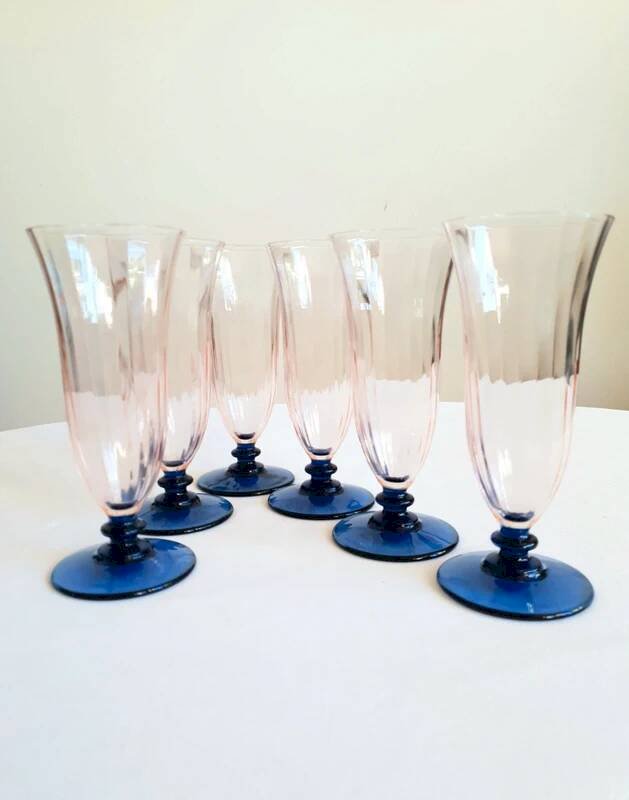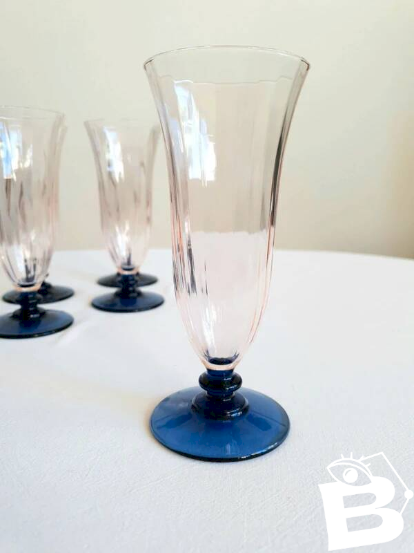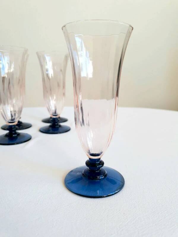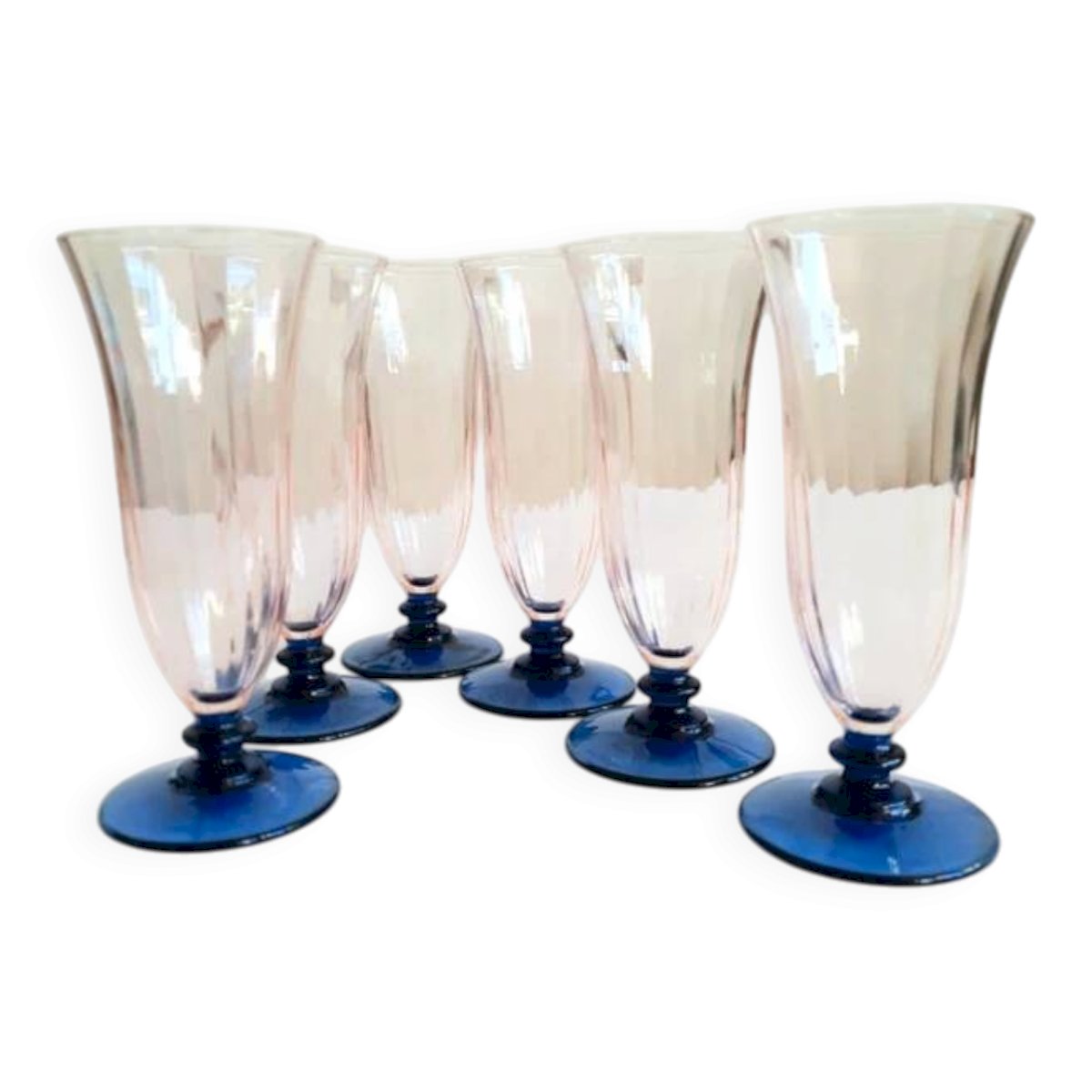 Set of 6 champagne flutes from the 70s. Beautiful Italian design for these pink-blue glasses, delicately grooved. "Italy" embossed under the base. Perfect condition. Height 15.5 cm. Drinking diameter 6.5 cm. L: 6 W: 6 H: 15