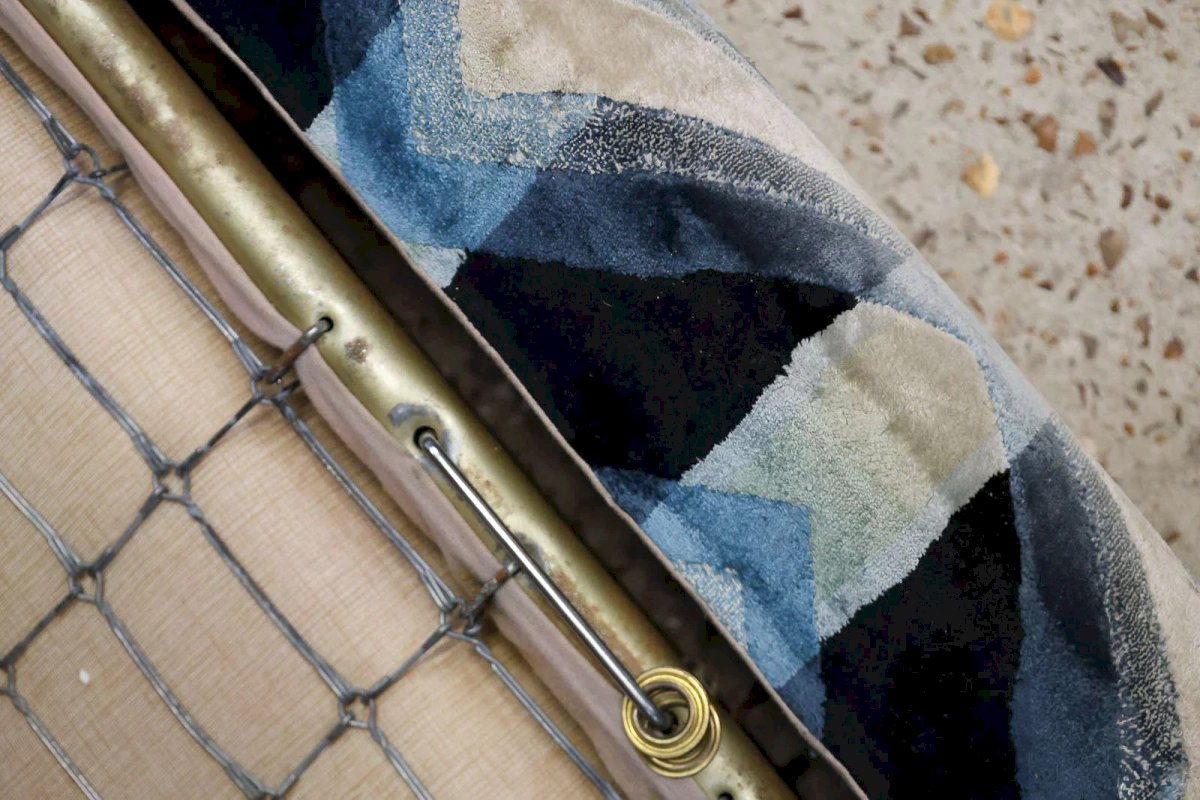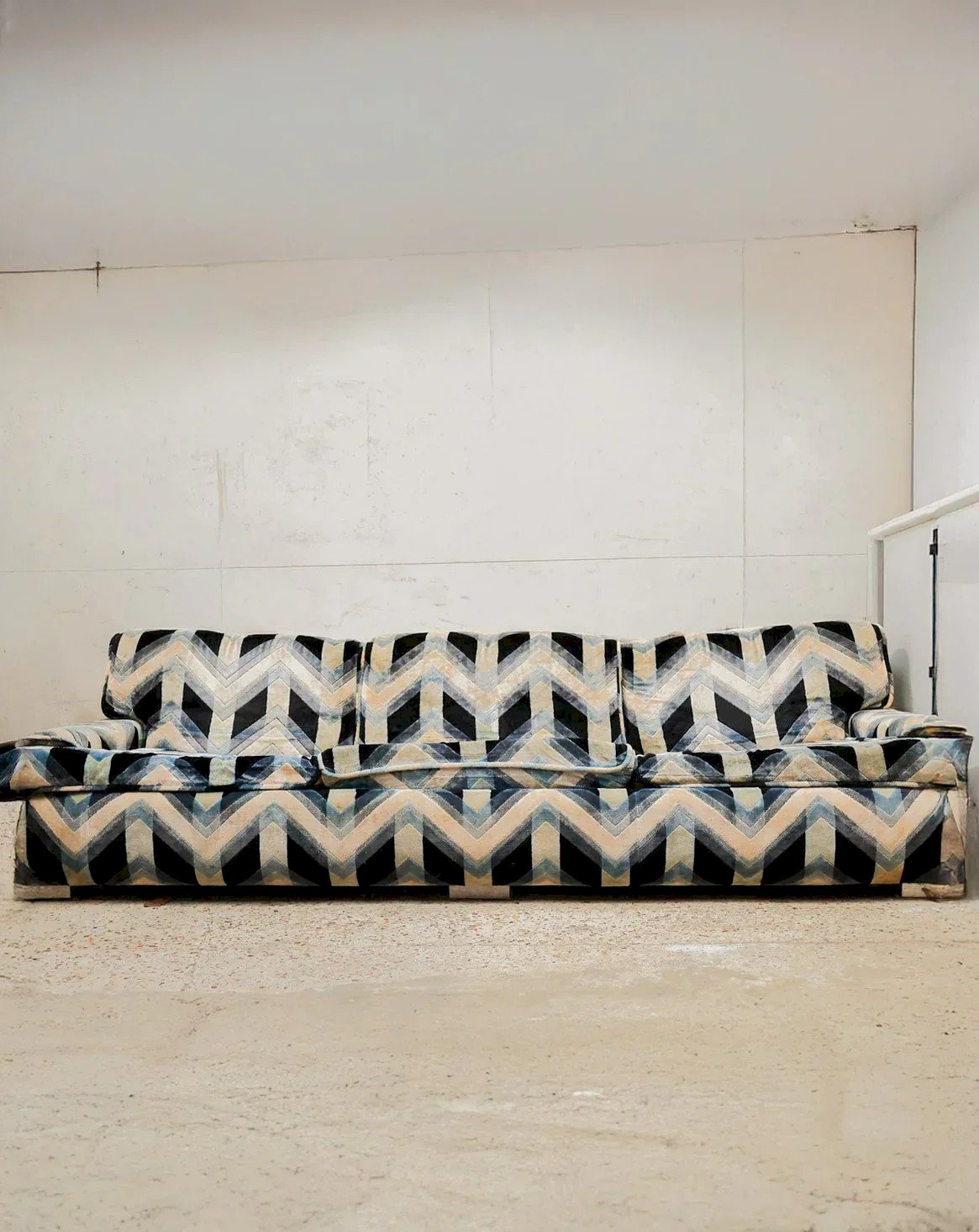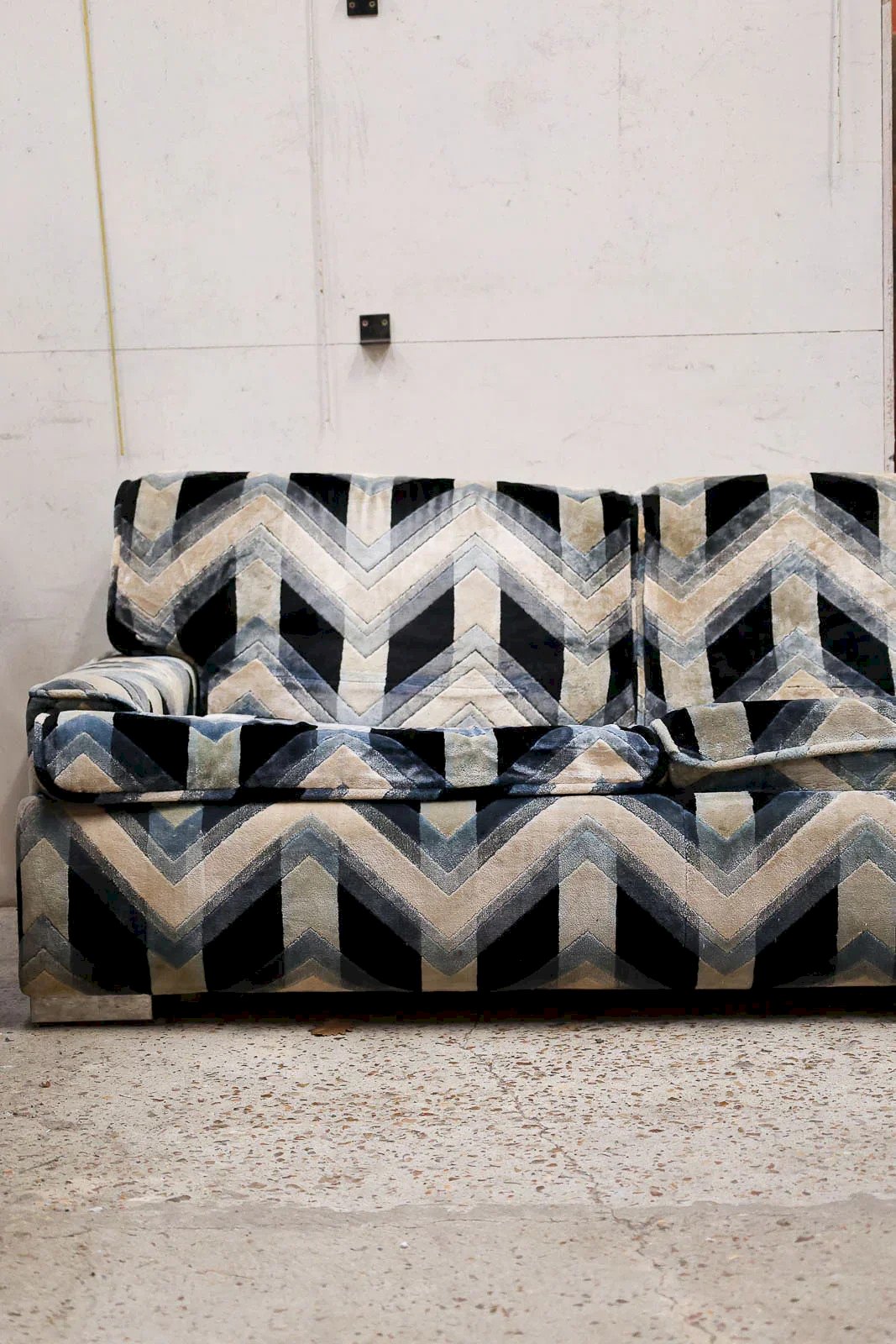 Adopt this 1970s velvet sofa designed by Gerard Guermonprez, with shades of black, blue, cream, and green that give it a refined yet warm appearance. Its metal frame mechanism unfolds to provide a 120 cm sleeping area, ideal for accommodating guests occasionally. With its generous seating and low backrest, it fits perfectly in both a contemporary living room and a guest bedroom, creating a retro and elegant atmosphere. Length: 242 cm Width: 94 cm Height: 68 cm Seat height: 40 cm Condition: Used: Item has been used. Item shows some superficial signs of wear, fully operational and functioning correctly. It may be a display model or an item returned to the store after a short period of use. Possible imperfections. Color: Multicolored Height: Velvet, Fabric Width: Sofas and benches Brand: Debongout Type: Thrifted product Material: Velvet, Fabric Style: Contemporary