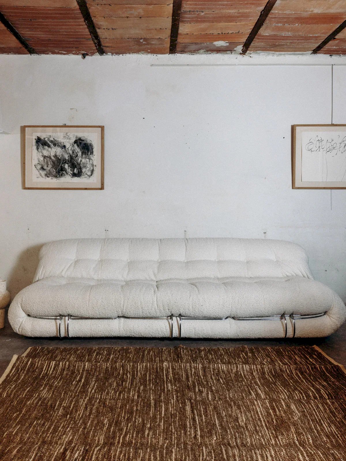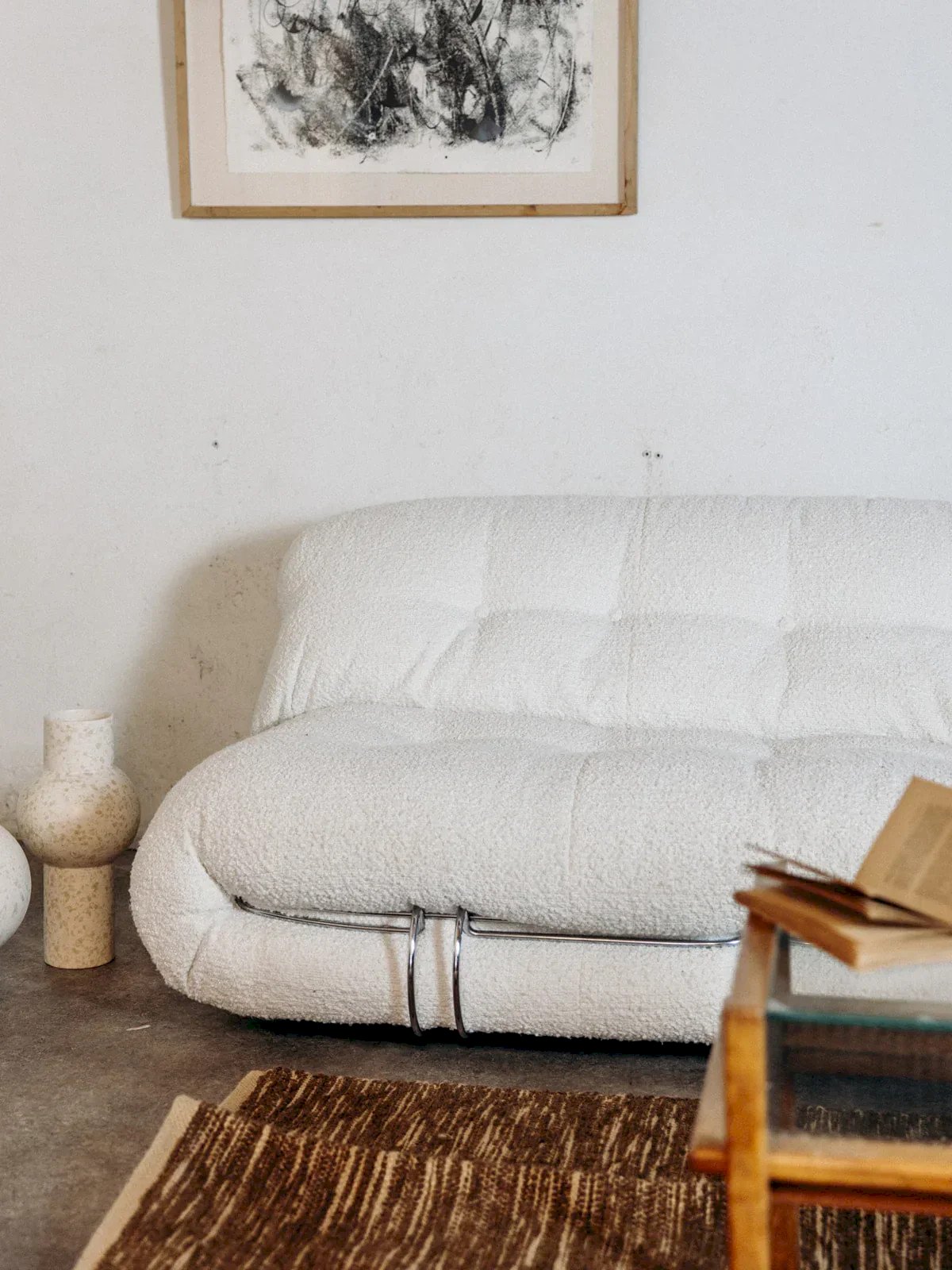 Alert nugget! This 4-seater Soriana sofa by Afra & Tobia Scarpa, designed for Cassina in the 1970s, embodies the elegance and comfort of Italian design. Fully restored and covered in white boucle wool fabric, it offers a luxurious and modern seating experience. Its structure is supported by a chrome-plated steel clamp, a signature of its innovative design. The publisher's label, visible under the seat, attests to its authenticity. An iconic piece of furniture that will bring a designer and refined touch to your interior. Length: 245 cm Height: 65 cm Seat height: 37 cm Depth: 100 cm Seat depth: 56 cm Condition: Used: Item has been used. Item shows some signs of superficial wear,... Used: Item has been used. Item shows some signs of superficial wear, fully operational and functioning correctly. It may be a demonstration model or an item returned to the store after a short period of use. the possible imperfections. Color: Multicolor Height: Boucle fabric, Chrome Width: Sofas and benches Brand: Debongout Type: Vintage product Material: Boucle fabric, Chrome Style: Contemporary