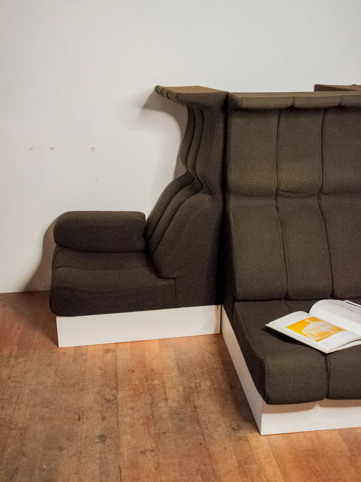 Embrace this 70s sofa composed of three independent modules, easily customizable to fit the proportions of your living room and create cozy configurations. Its wavy seating and dark brown wool fabric give it a warm look that invites relaxation. While its movable armrest increases its use cases, the top serves as a shelf and the refurbished white melamine boxes provide a contemporary and structured contrast. A small snag on the fabric of one module and minor wear visible in the photos. Total length: 200 cm Length of one module: 66 cm Width: 81 cm Total height: 119 cm Seat height: 36 cm Seat depth: 52.5 cm Width of the upper shelf: 24.5 cm Condition: Used: Item has been used. Item shows some superficial wear marks... Used: Item has been used. Item shows some superficial wear marks, fully operational and functioning properly. It could be a demonstration model or a returned item after a short period of use. Possible imperfections. Color: Multicolor Height: Wool, Wood Width: Sofas and benches Brand: Debongout Type: Vintage product Material: Wool, Wood Style: Contemporary