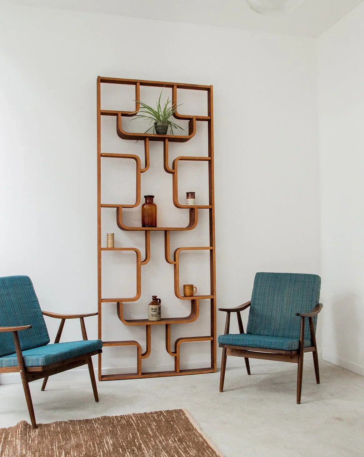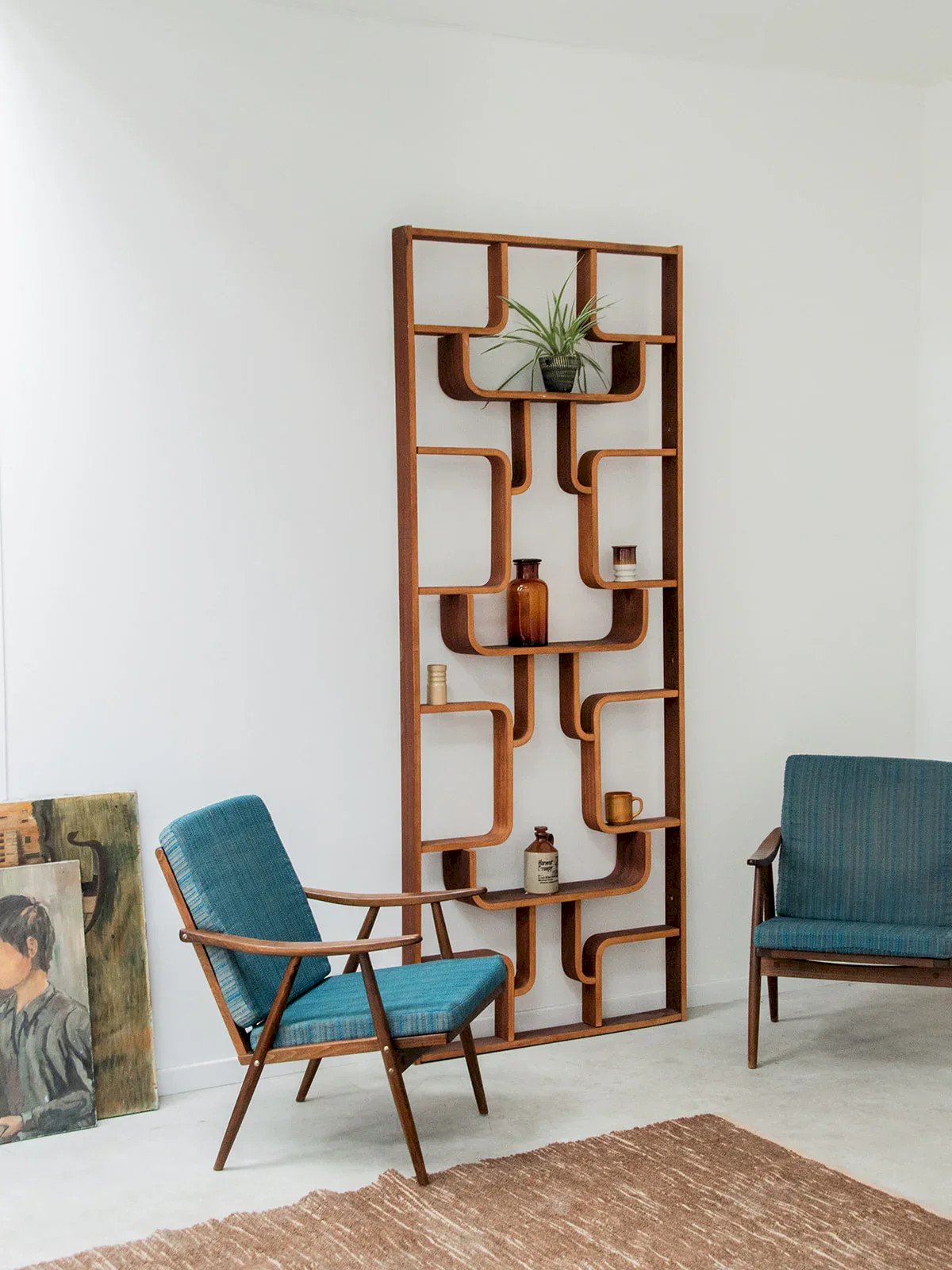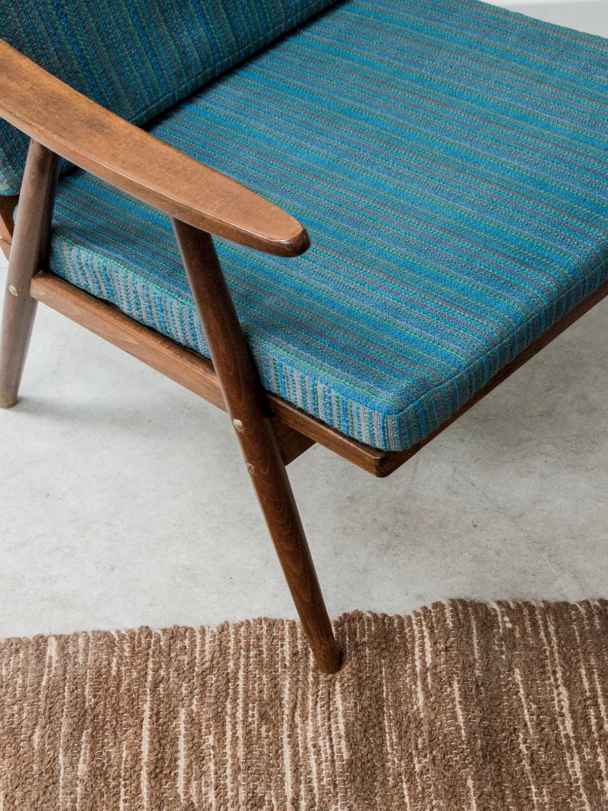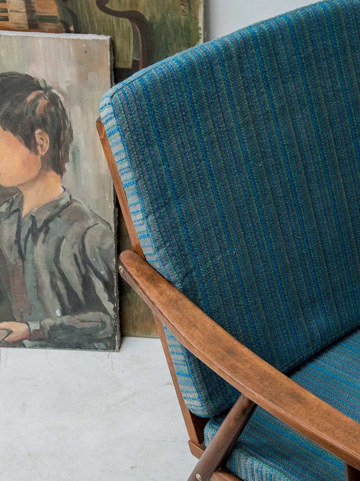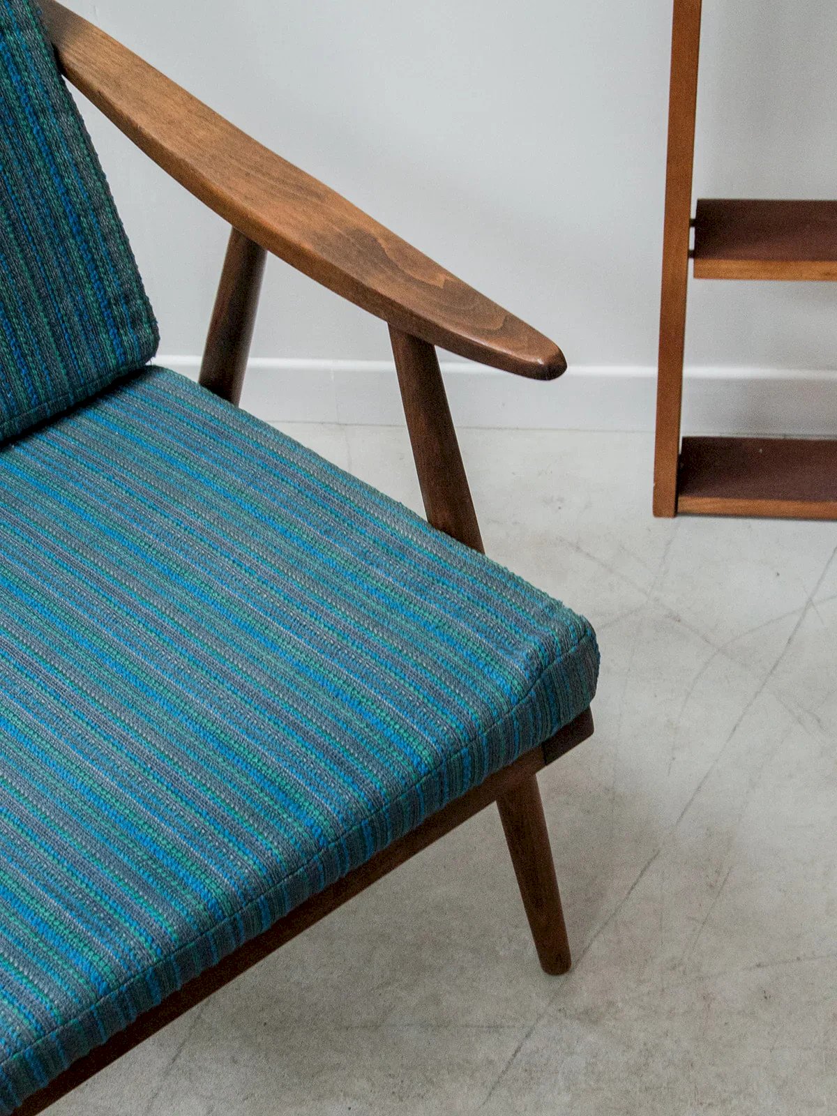 This dark wood armchair combines vintage charm and comfort thanks to its carefully crafted design: a curved backrest, enveloping armrests, and typical 50s splayed feet. The seat and backrest are covered in a blue fabric with fine stripes, adding a graphic and elegant touch. Note: one of the armrests shows slight discoloration, discreetly highlighting the unique and authentic character of this piece with a strong style. Sold individually, 2 quantities are available. Length: 61 cm Width: 56 cm Height: 81 cm Seat height: 39 cm Condition: Used: Item that has been used. Item showing some superficial signs of wear, ...Used: Item that has been used. Item showing some superficial signs of wear, fully operational and functioning correctly. It may be a demonstration model or an item returned to the store after a short period of use. potential imperfections. Color: Multicolor Height: Wood, Fabric Width: Armchairs and lounge chairs Brand: Debongout Type: Vintage find Material: Wood, Fabric Style: Contemporary