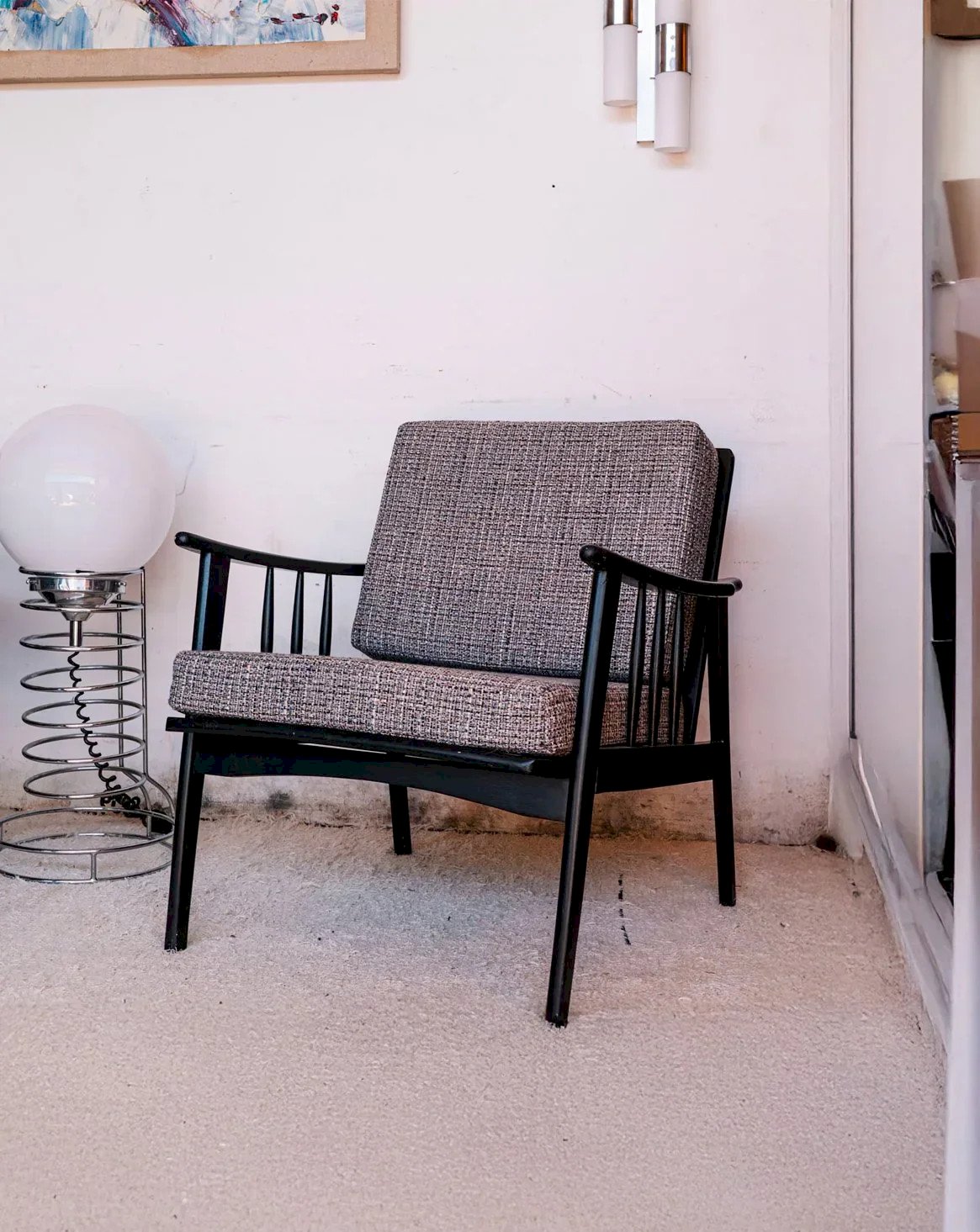 Discover our magnificent 1960s armchair, designed by Roche Bobois. Upholstered in a woolen fabric with shades of blue, gray, and brown, it adds a touch of vintage elegance to your home. Its sturdy wooden structure stands on a black base, offering both style and comfort. This iconic model is perfect for those who appreciate authentic French design. Don't miss the opportunity to add this timeless piece to your collection. Sold individually, available in 2 copies. Width: 65 cm Height: 69 cm Seat height: 41 cm Depth: 67 cm Seat depth: 44 cm Condition: Used: Item has been used. Item shows some superficial signs of wear, fully operational and functioning correctly. It may be a demonstration model or an item returned to the store after a short period of use. potential imperfections. Color: Multicolor Height: Wood, Fabric Width: Armchairs and lounge chairs Brand: Debongout Type: Curated product Material: Wood, Fabric Style: Contemporary