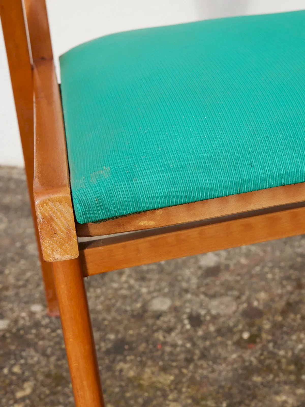 Adopt this 1950s green wood and faux leather armchair, with a retro profile and warm presence. Sold as is, it offers a welcoming seat and comfortable height, perfect for a reading nook, a living room, or a vintage and elegant office. The studded details on the back and the wooden structure emphasize its authenticity and add a touch of character. Light traces of time are present. Length: 54 cm Width: 50 cm Height: 81 cm Seat height: 46 cm Seat depth: 54 cm Seat width: 50 cm Condition: Used: Item has been used. Item shows some superficial signs of wear, fully operational and functioning correctly. It may be a demonstration model or an item returned to the store after a short period of use, as well as any possible imperfections. Color: Multicolor Height: Wood Width: Armchairs and lounge chairs Brand: Debongout Type: Vintage product Material: Wood Style: Contemporary