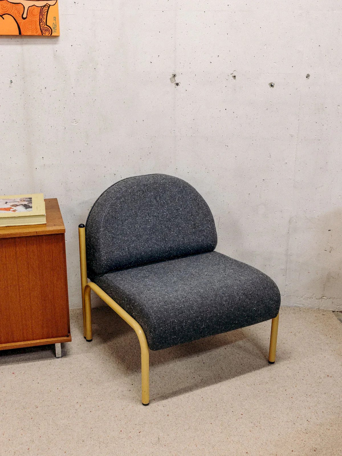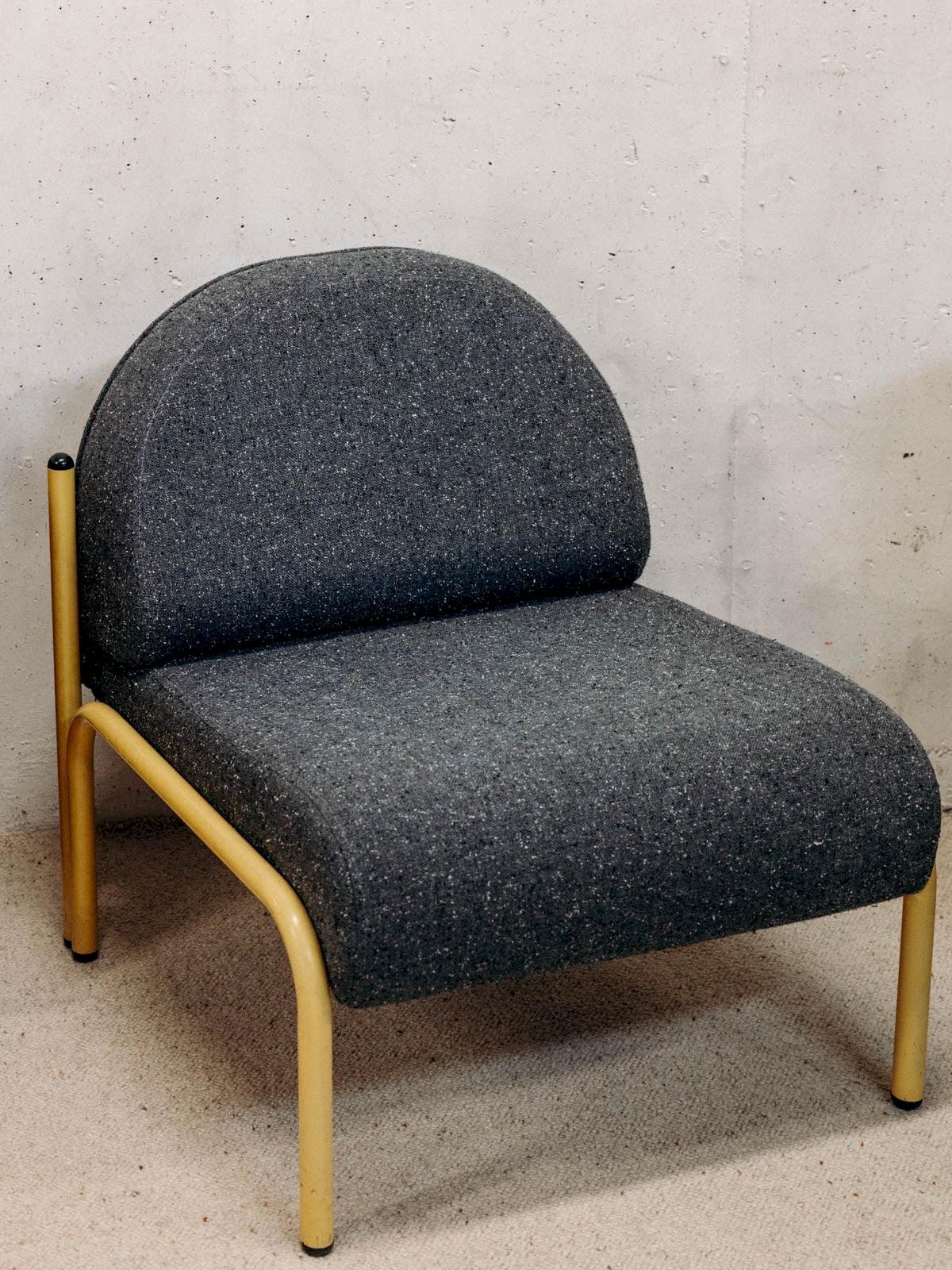 Add a touch of modernity to your interior with this speckled grey fabric armchair. Its yellow metal frame brings a dynamic splash of color, while its rounded backrest ensures optimal comfort. Ideal for a reading nook or to enhance your living room, this armchair combines contemporary style with comfort. A unique piece that is sure to catch the eye! Length: 67 cm Height: 77 cm Seat height: 44 cm Depth: 68 cm Seat depth: 45 cm Seat width: 61 cm Condition: Used: Item that has been used. Item showing some superficial signs of wear, fully operational and working correctly. It may be a display model or an item returned to the store after a short period of use. Possible imperfections. Color: Multicolor Height: Fabric, Metal Width: Armchairs and lounge chairs Brand: Debongout Type: Vintage product Material: Fabric, Metal Style: Contemporary