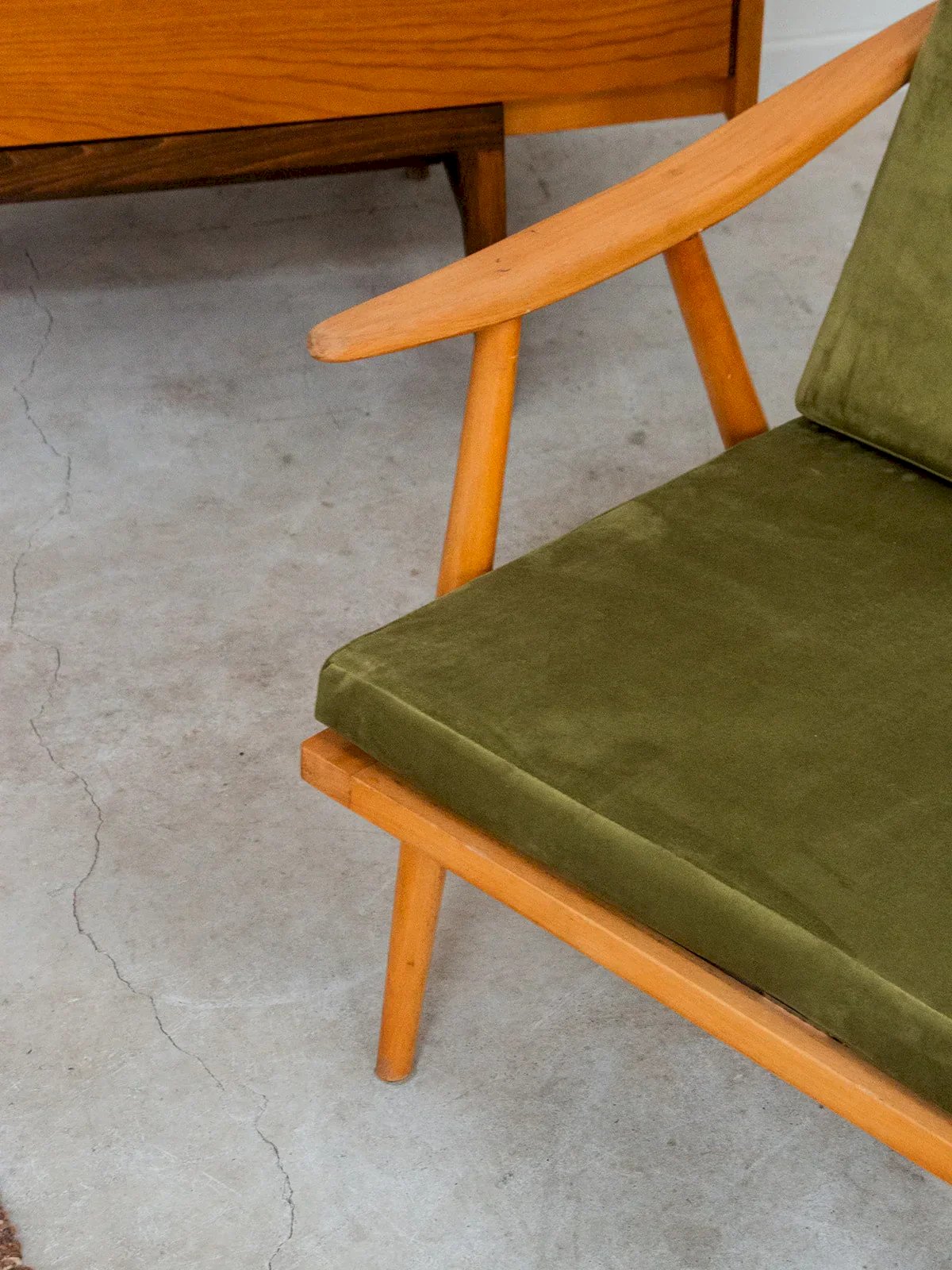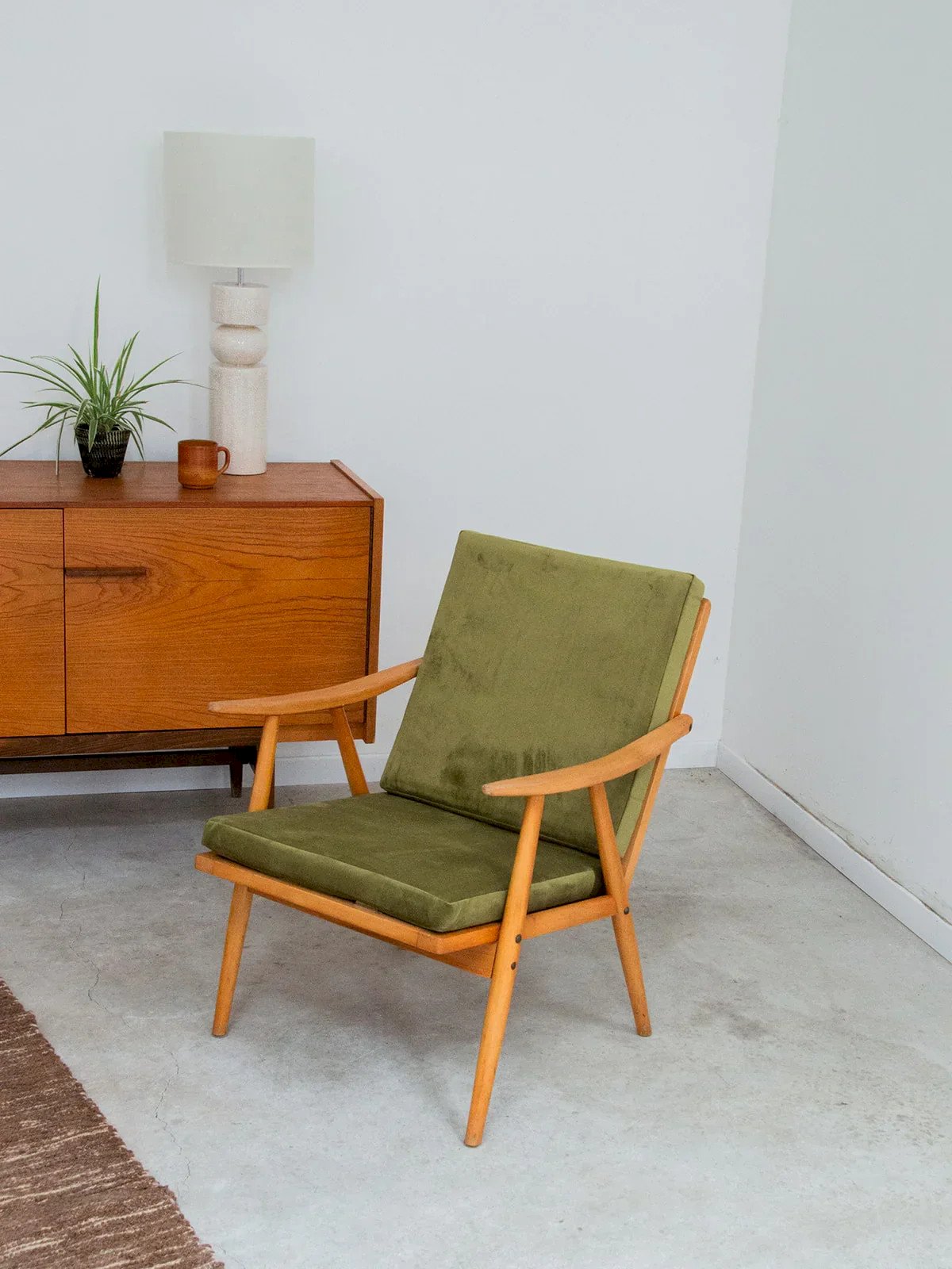This Scandinavian-inspired armchair charms with its sober and elegant appearance. Made of light wood, it features a sloped seat and backrest upholstered in green velvet, soft to the touch and warm to the eye. Its splayed legs enhance its retro style while ensuring great stability. A comfortable and refined piece, ideal for creating a cozy and contemporary atmosphere. Length: 58 cm Height: 74 cm Seat height: 38 cm Depth: 62 cm Condition: Second hand: Item has been used. Item shows some signs of superficial wear, fully operational and functioning correctly. It may have been a demonstration model or a returned item after a short period of use. Any imperfections. Color: Multicolor Height: Wood, Fabric Width: Armchairs and lounge chairs Brand: Debongout Type: Thrifted product Material: Wood, Fabric Style: Contemporary