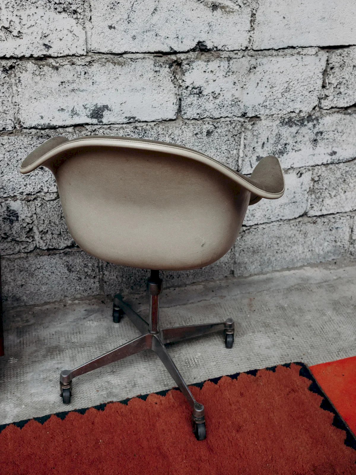 Discover this Vitra office chair with an iconic design by Eames, combining comfort and functionality. Swiveling and mounted on wheels, it offers great freedom of movement, ideal for a dynamic workspace. Its metal base shows some pitting, testament to its age. The fabric is stained but retains all its comfort and style. A cult piece for vintage design lovers. Length: 67 cm Seat length: 40 cm Width: 61 cm Seat width: 45 cm Height: 87 cm Seat height: 46 cm Condition: Used: Item that has been used. Item showing some superficial signs of wear, fully operational and functioning properly. It may be a display model or an item returned to the store after a short period of use. Any imperfections. Color: Multicolor Height: Fabric, Metal Width: Armchairs and lounge chairs Brand: Debongout Type: Vintage product Material: Fabric, Metal Style: Contemporary