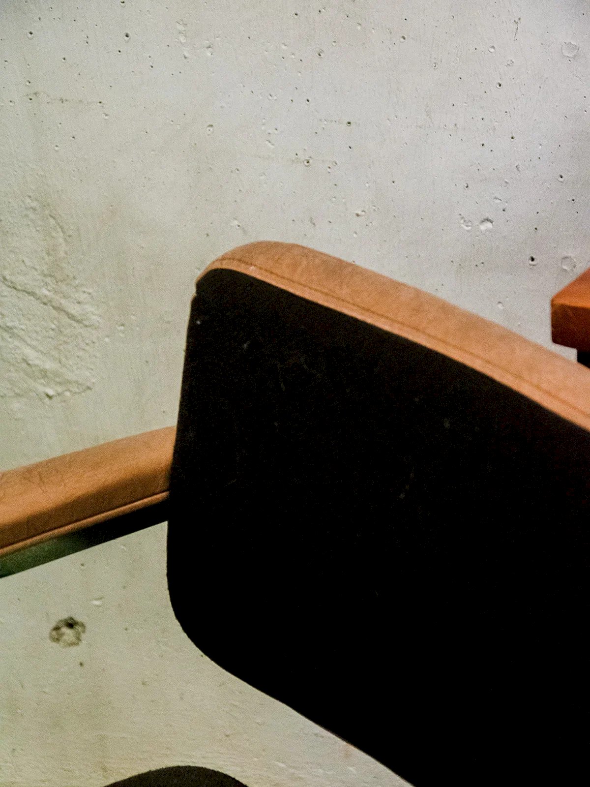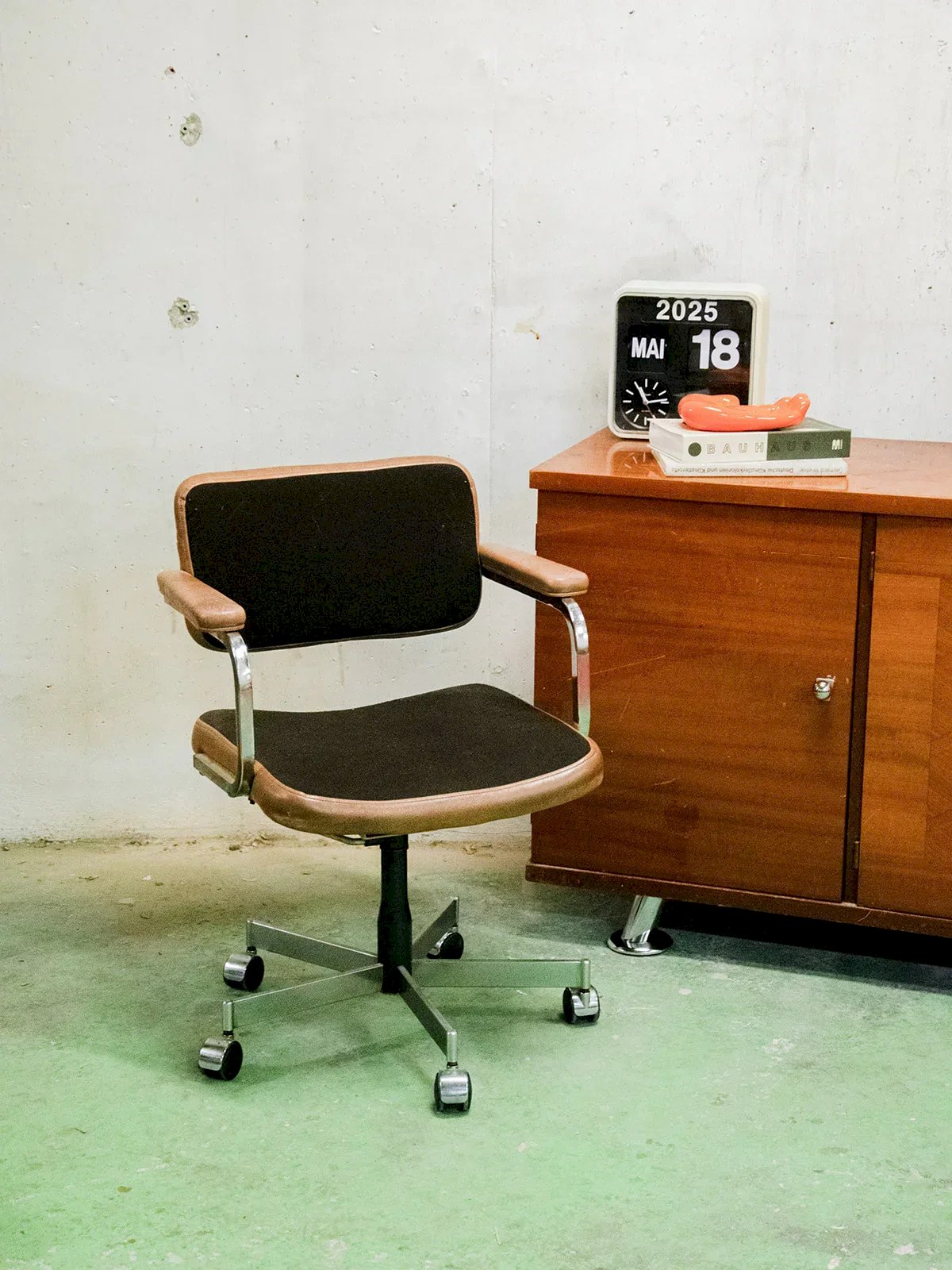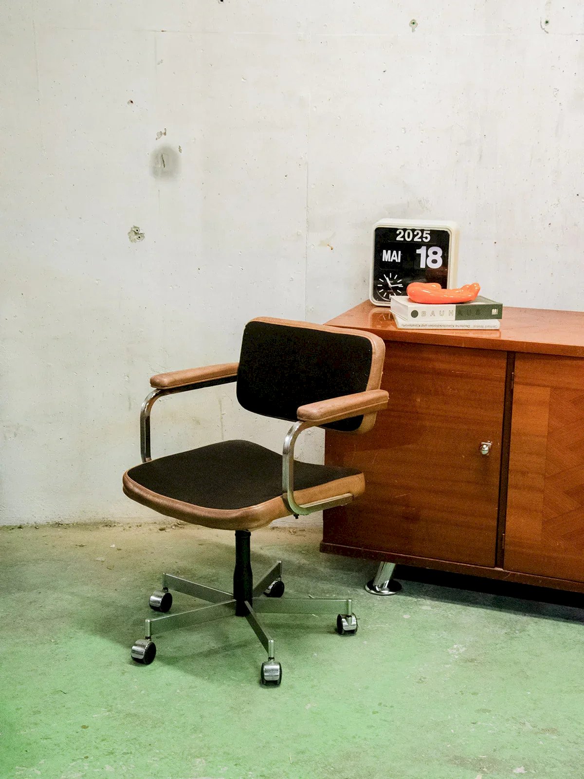 Discover this wheeled armchair that combines comfort and elegance. Its covering, blending leather and brown fabric, harmoniously fits into any interior, while its chrome base adds a modern touch and ensures great stability. Perfect for an office or work space, it provides a pleasant seating experience to accompany you daily. Length: 57 cm Width: 47 cm Height: 77 cm Seat height: 45 cm Condition: Used: Item that has been used. Item showing some signs of superficial wear, fully operational and functioning correctly. It may be a demonstration model or a returned item after a short period of use. Possible imperfections. Color: Multicolor Height: Leather, Fabric, Chrome Width: Armchairs and lounge chairs Brand: Debongout Type: Vintage product Material: Leather, Fabric, Chrome Style: Contemporary