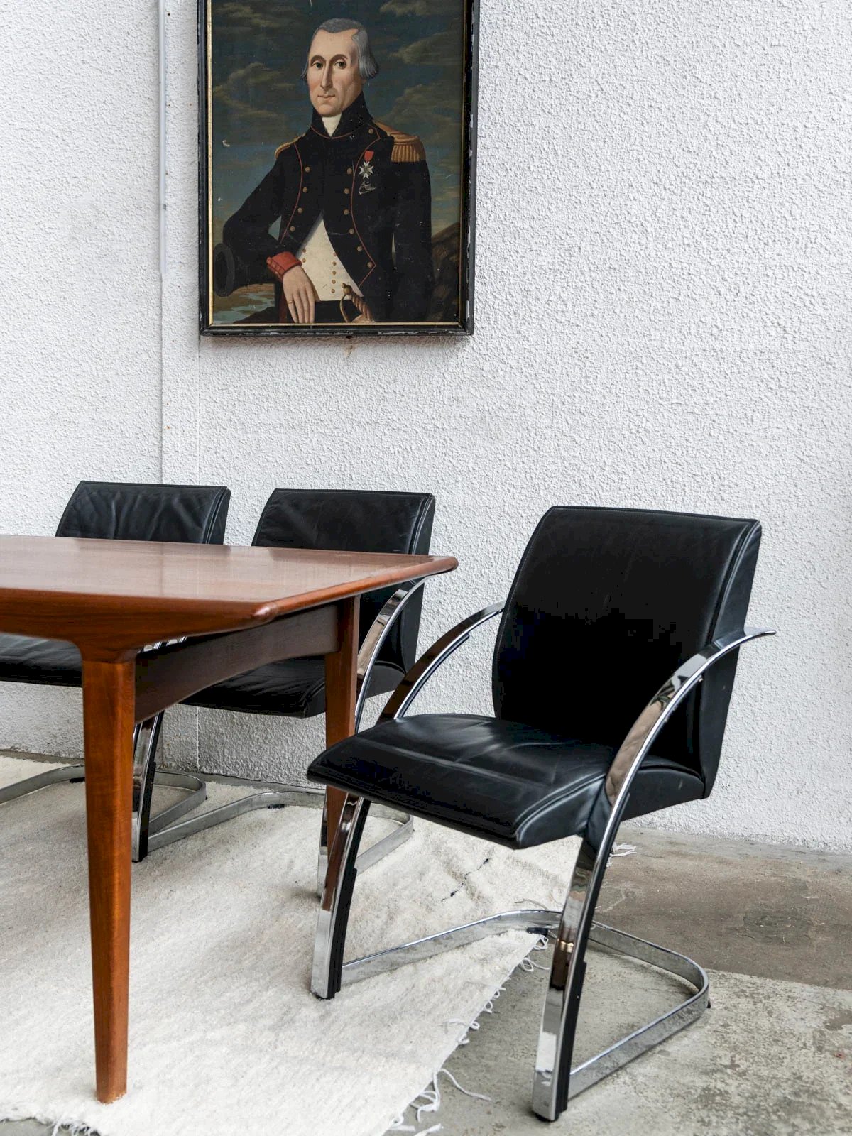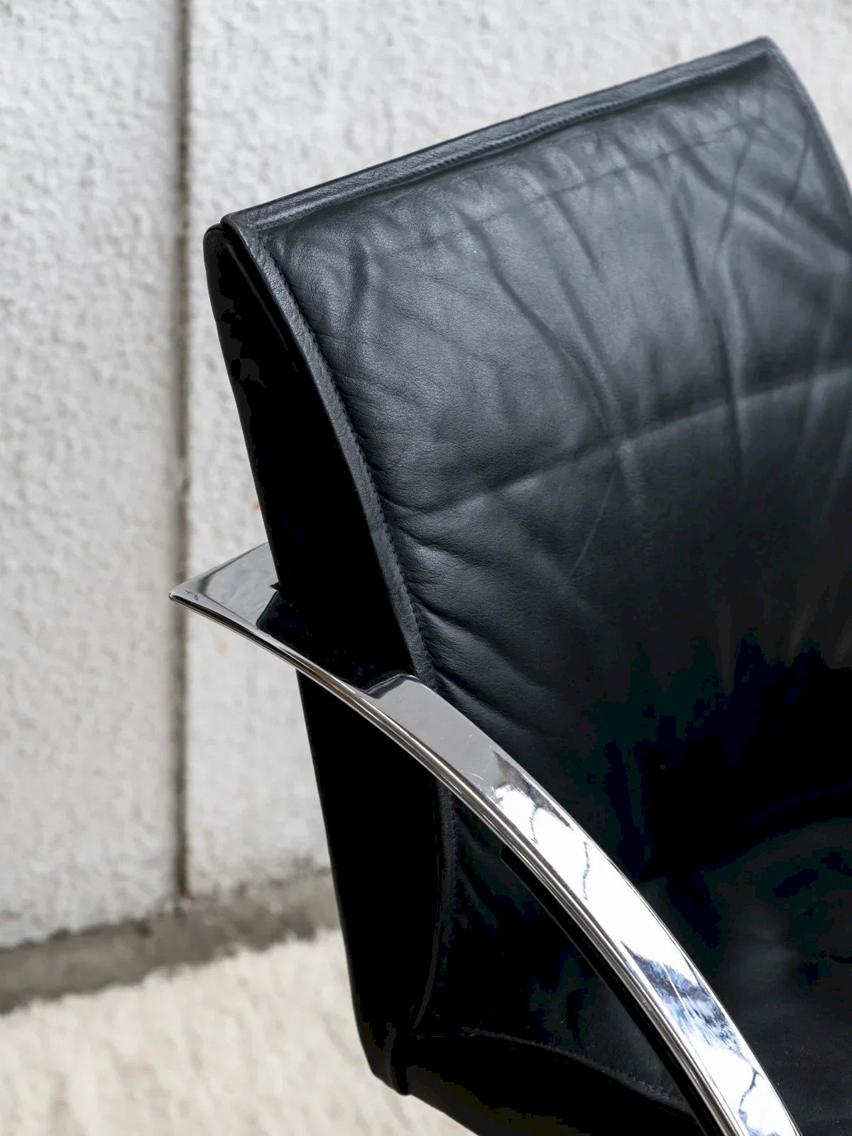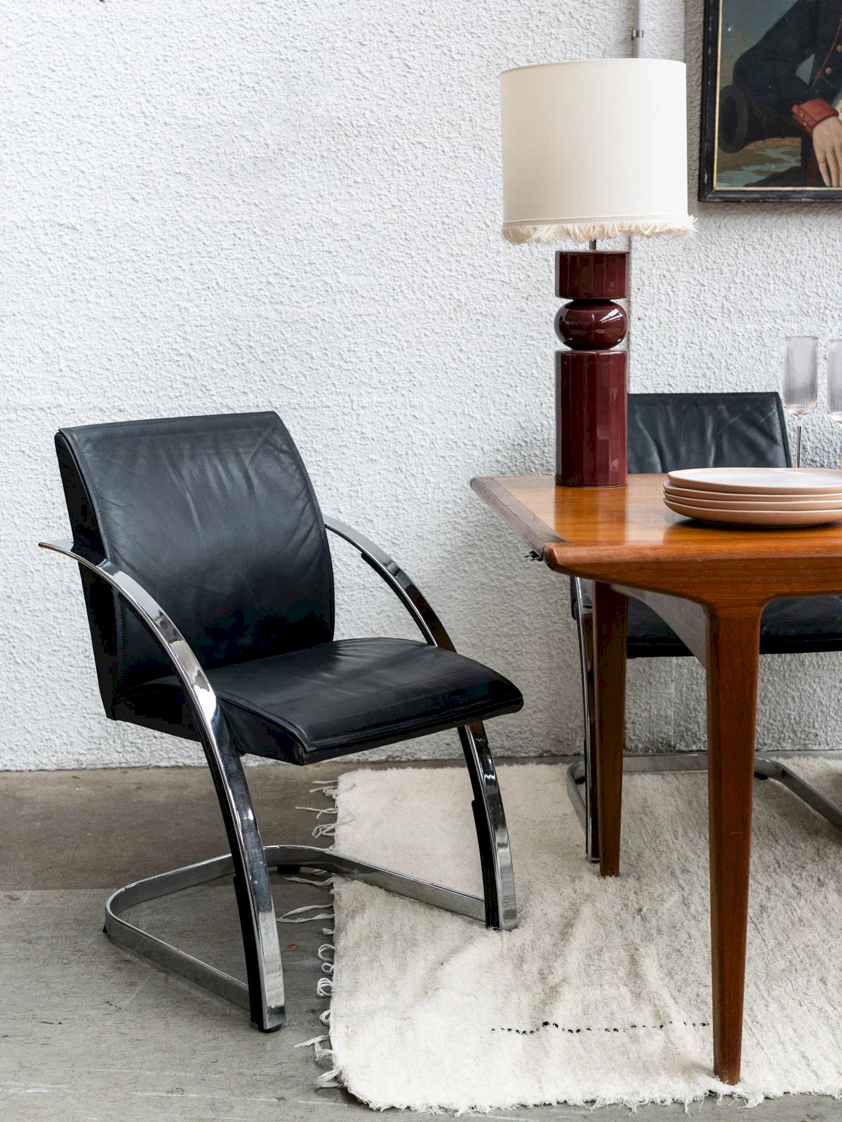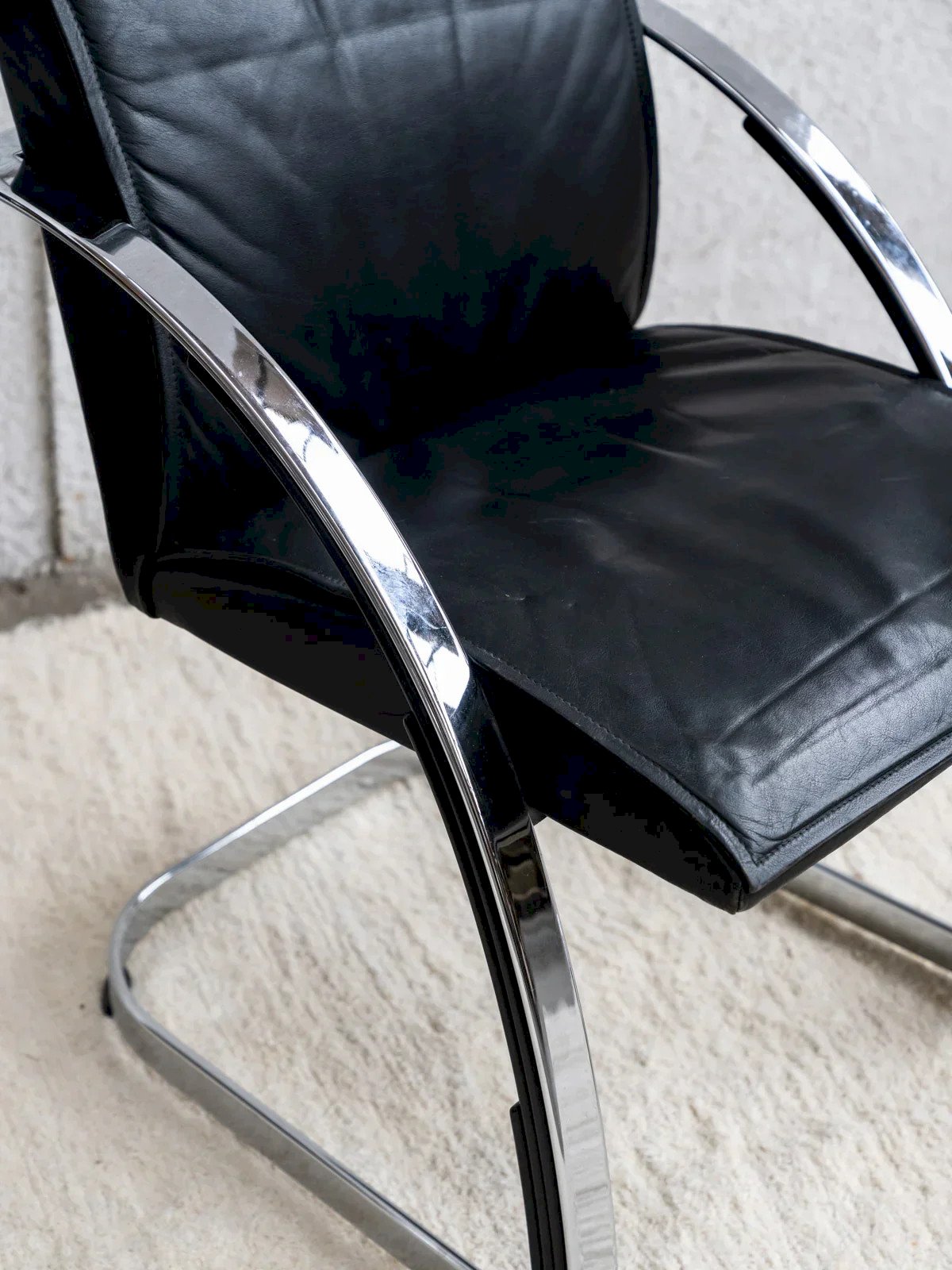 Discover the black leather Gisberger chair, a model that combines elegance and comfort. Its chrome-plated steel structure gives this seat a modern and timeless style, perfect for living spaces or represented offices. Made in Switzerland, it embodies the quality and craftsmanship inherent to the Gisberger brand. Chairs sold individually, 8 units available to meet all your furnishing needs. Web exclusivity, the meeting will take place at your home! Length: 46 cm Width: 54.5 cm Height: 86 cm Seat height: 46 cm Condition: Used: Item that has been used. Item showing some superficial wear marks,... Used: Item that has been used. Item showing some superficial wear marks, fully operational and functioning correctly. This may be a display model or an item returned to the store after a short period of use. any possible imperfections. Color: Multicolor Height: Leather, Metal Width: Chairs and armchairs Brand: Debongout Type: Vintage product Material: Leather, Metal Style: Contemporary