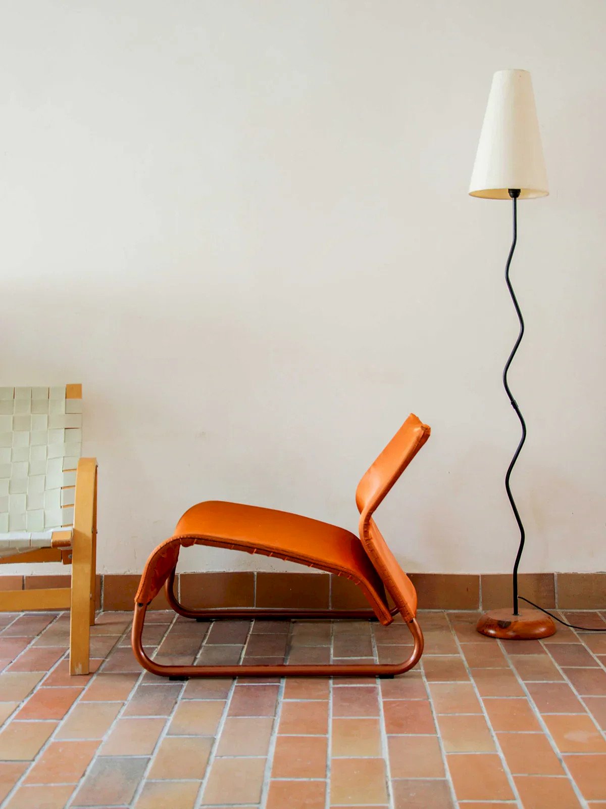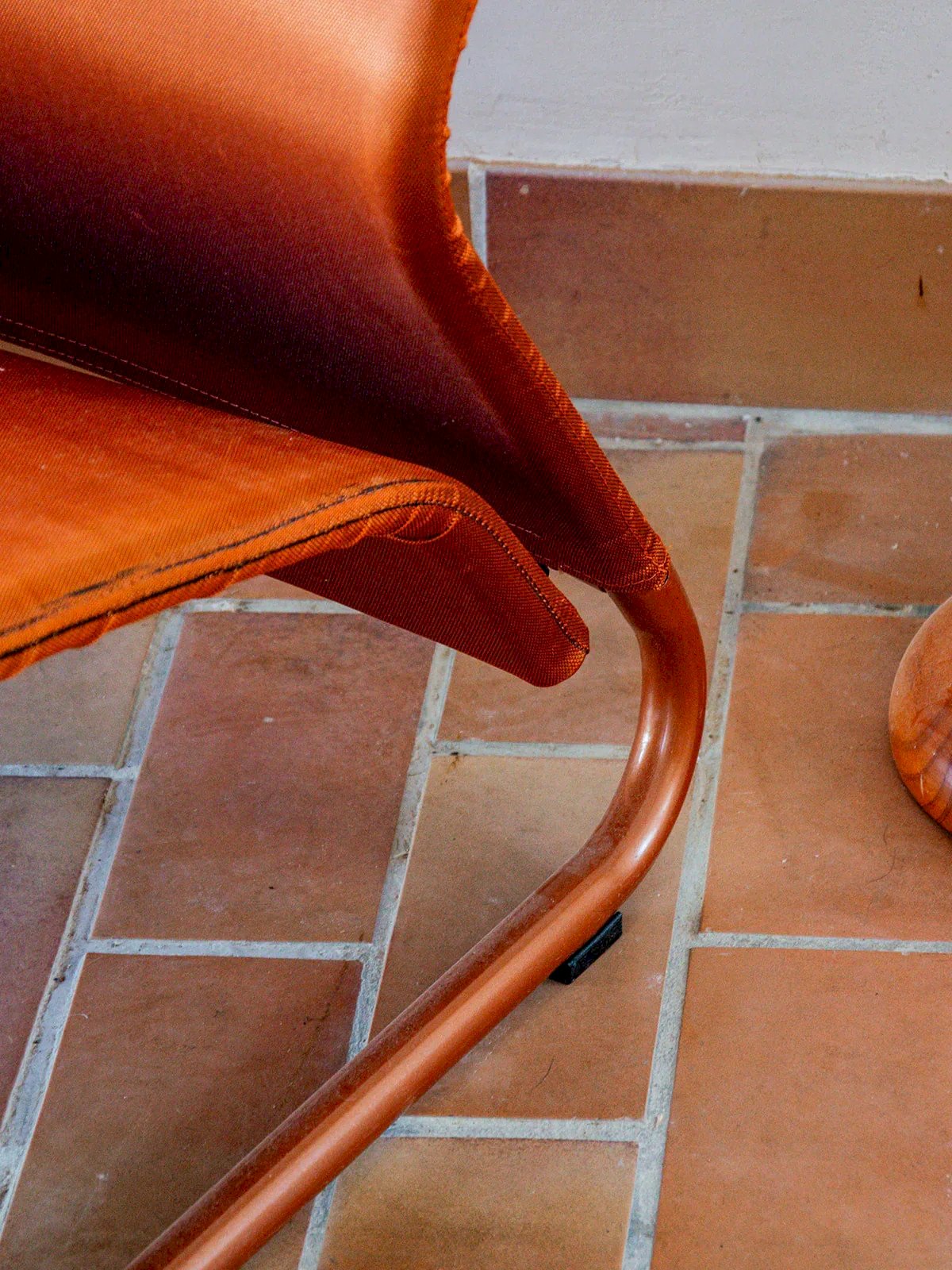 This low chair with a bold look combines a comfortable seat made of woven orange polyester fabric with a black metal tubular frame. Its curved backrest and streamlined design give it a modern yet retro appearance. Lightweight, graphic, and decidedly stylish, it will add a splash of color and character to a living room, bedroom, or relaxation space. Length: 62 cm Width: 62 cm Height: 65 cm Seat height: 37 cm Condition: Used item: An item that has been used. Item showing some superficial wear, fully operational and functioning correctly. It may be a demonstration model or an item returned to the store after a short period of use. Possible imperfections. Color: Multicolor Height: Metal, Steel Width: Chairs and armchairs Brand: Debongout Type: Vintage product Material: Metal, Steel Style: Contemporary