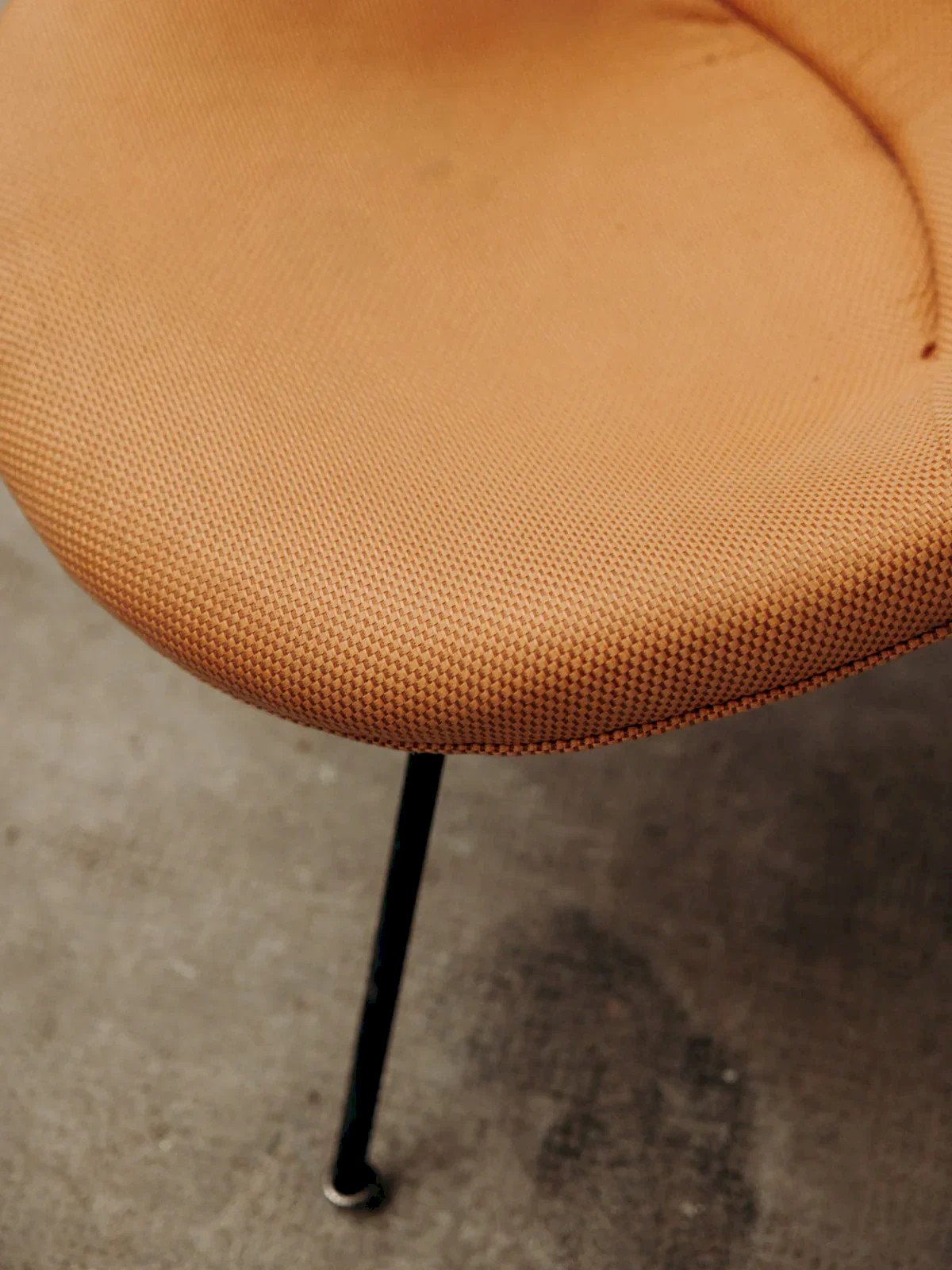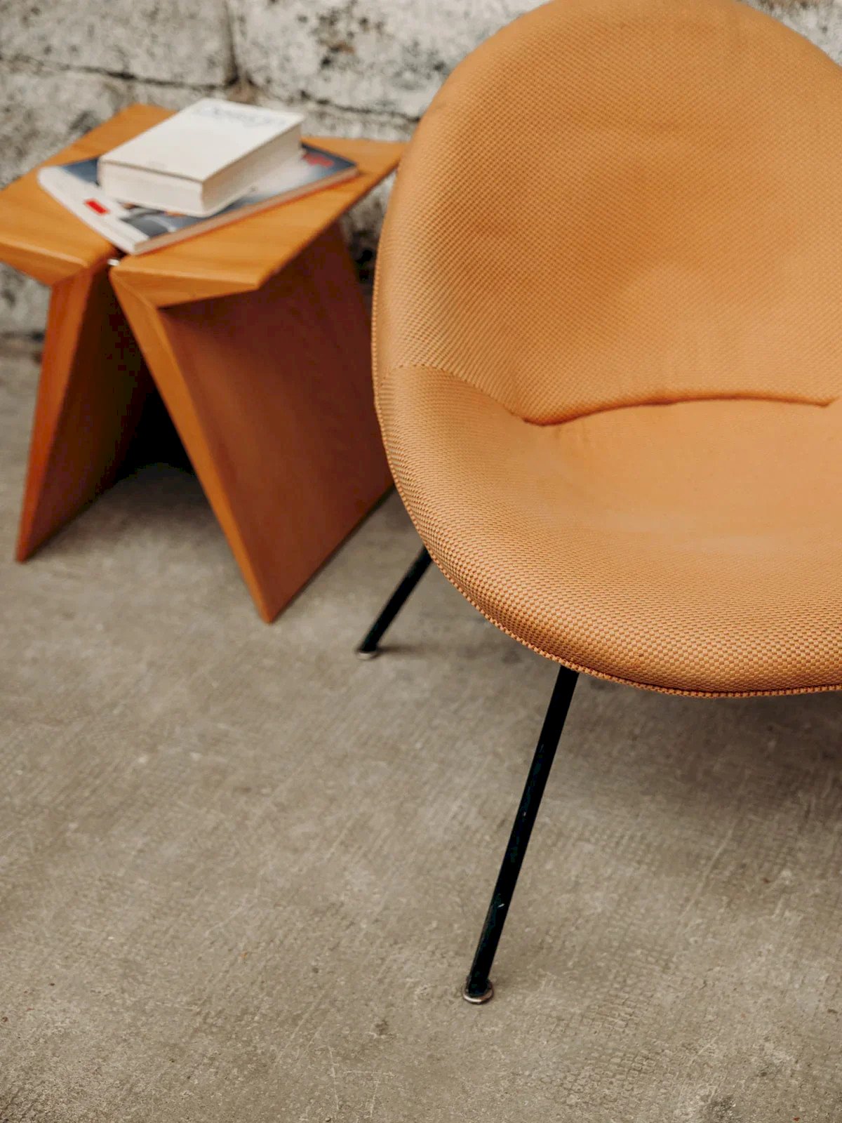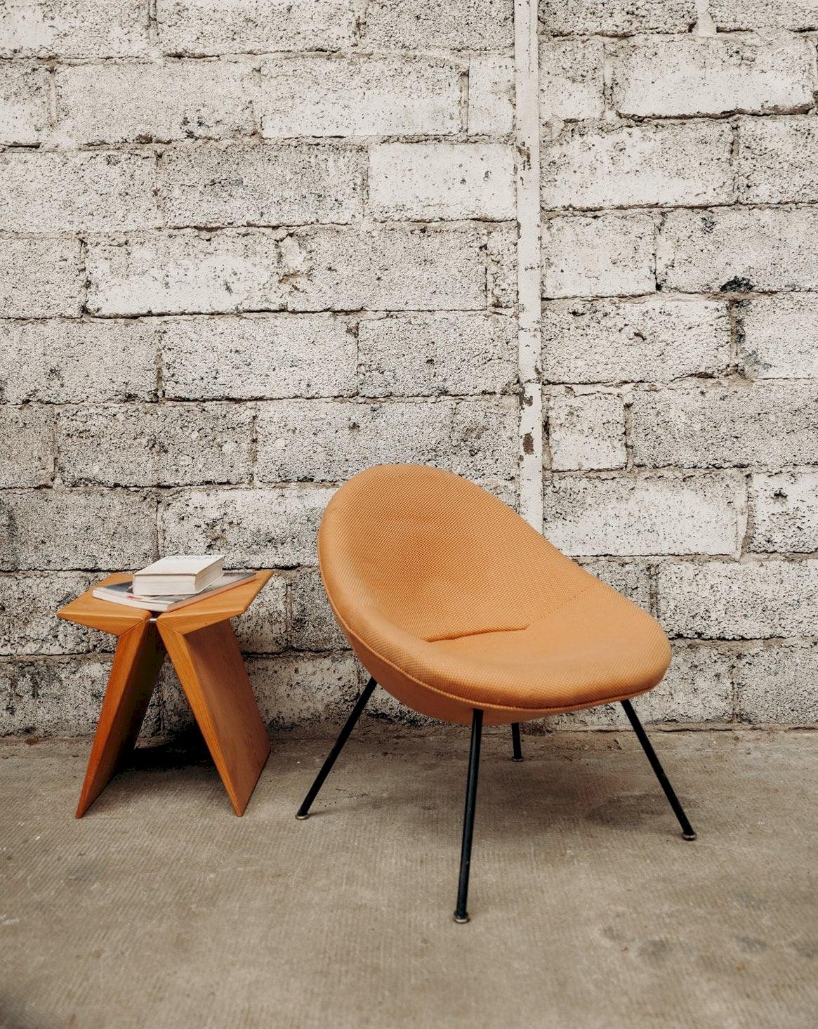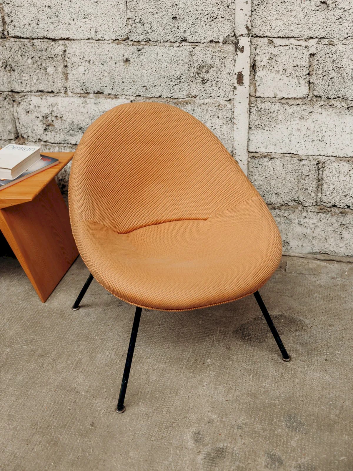 Discover this elegantly designed armchair, featuring black metal compass-style legs that add a retro touch to your interior. Its bright orange wool fabric brings warmth and color to your space while providing optimal comfort. Ideal for modern or vintage decor, it will seamlessly fit into various styles of living rooms. This armchair is a perfect blend of comfort and aesthetics, ideal for creating a welcoming atmosphere. A functional and decorative piece that won't go unnoticed. Online exclusive, the meeting will take place at your home! Length: 63 cm Height: 72 cm Seat height: 40.5 cm Depth: 76 cm Condition: Used: Item that has been used. Item shows some superficial signs of wear. Fully operational and functioning correctly. It may be a demonstration model or an item returned to the store after a short period of use. Possible imperfections. Color: Multicolor Height: Fabric, Metal Width: Armchairs and lounge chairs Brand: Debongout Type: Vintage product Material: Fabric, Metal Style: Contemporary