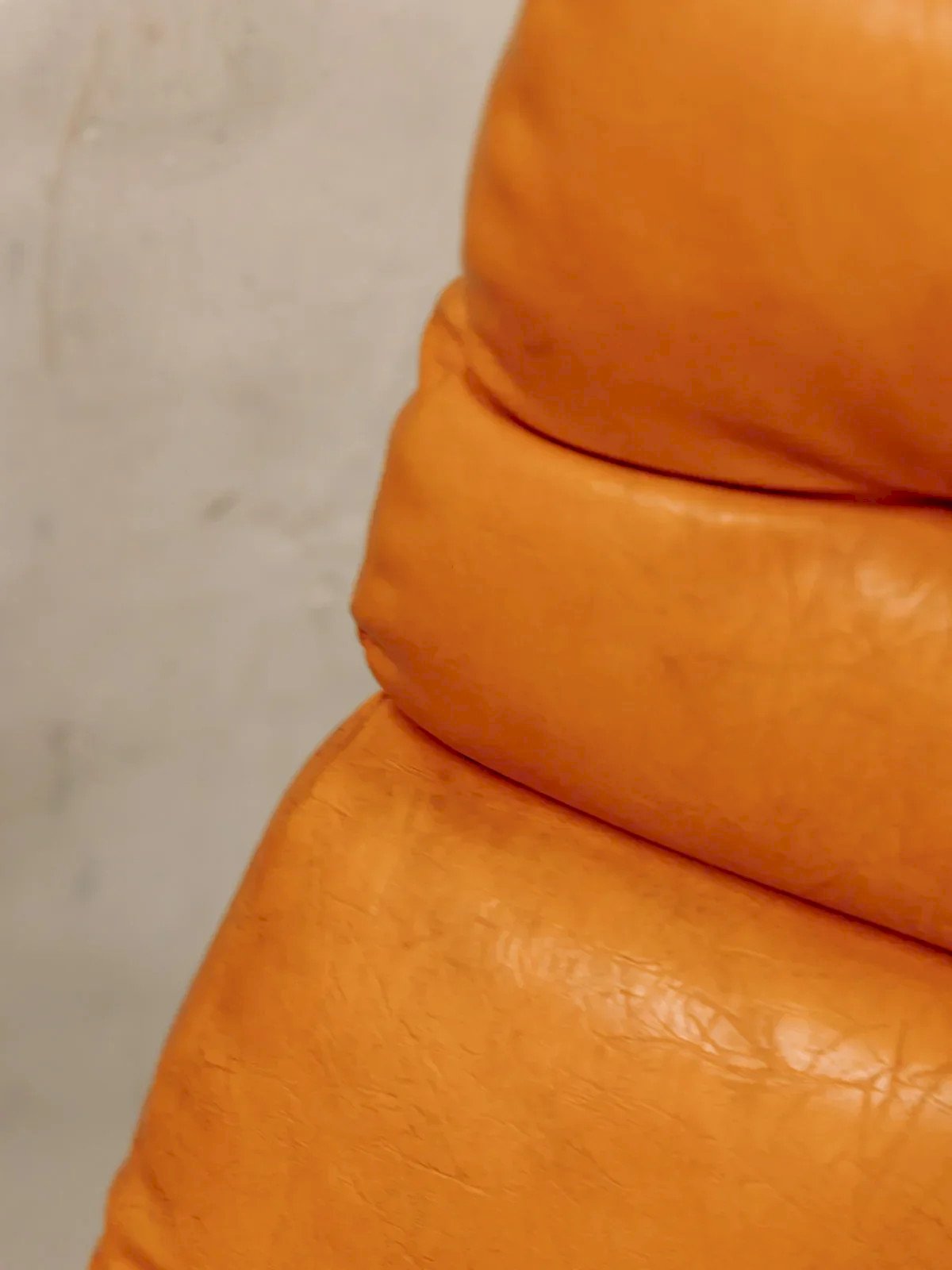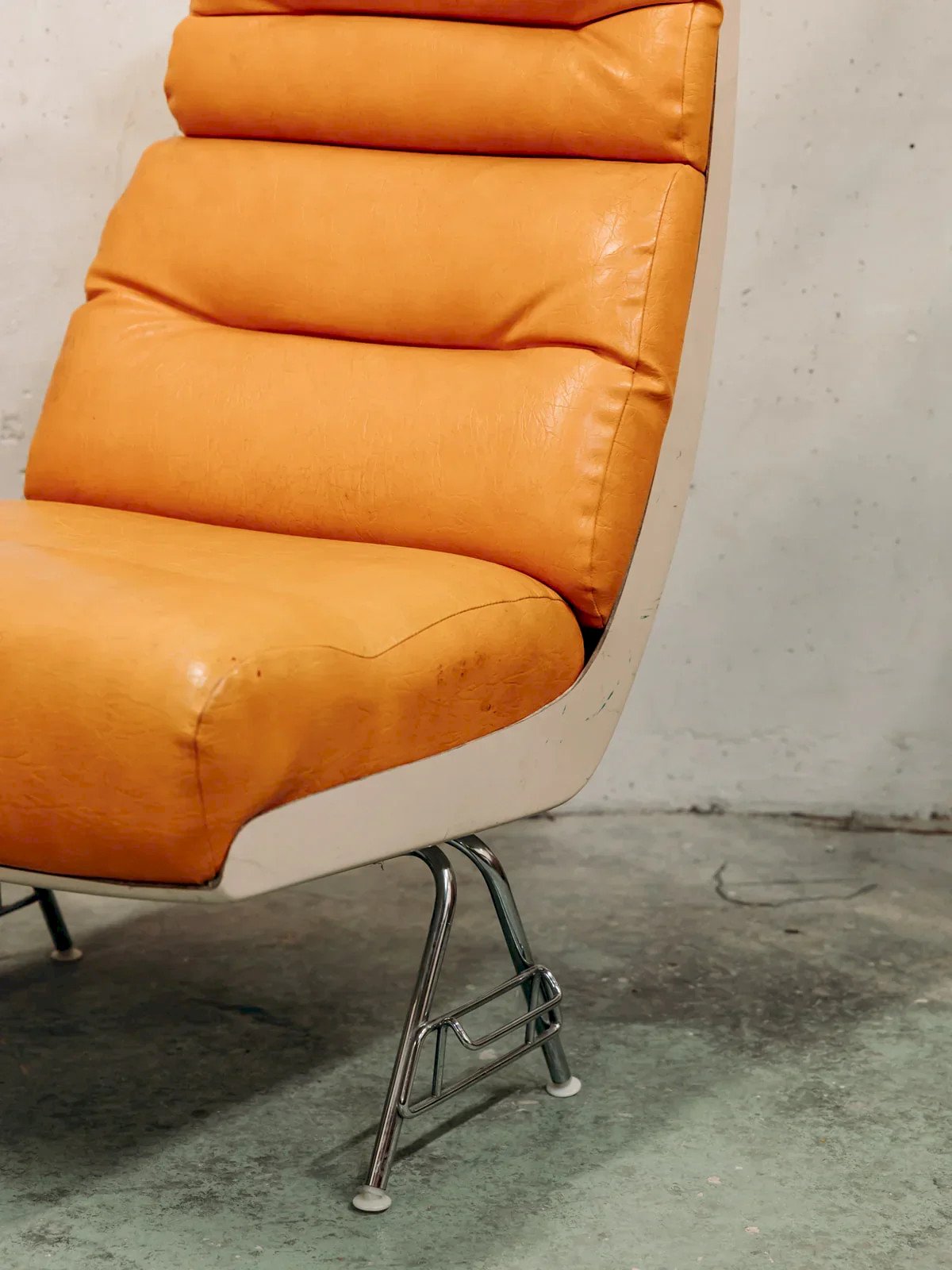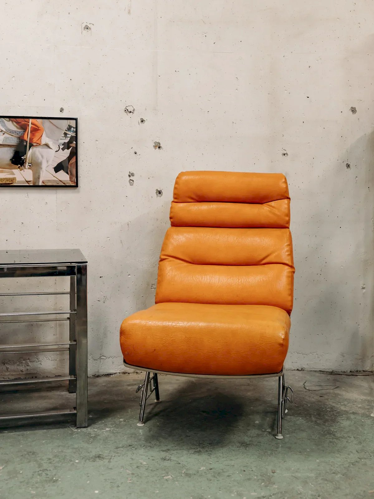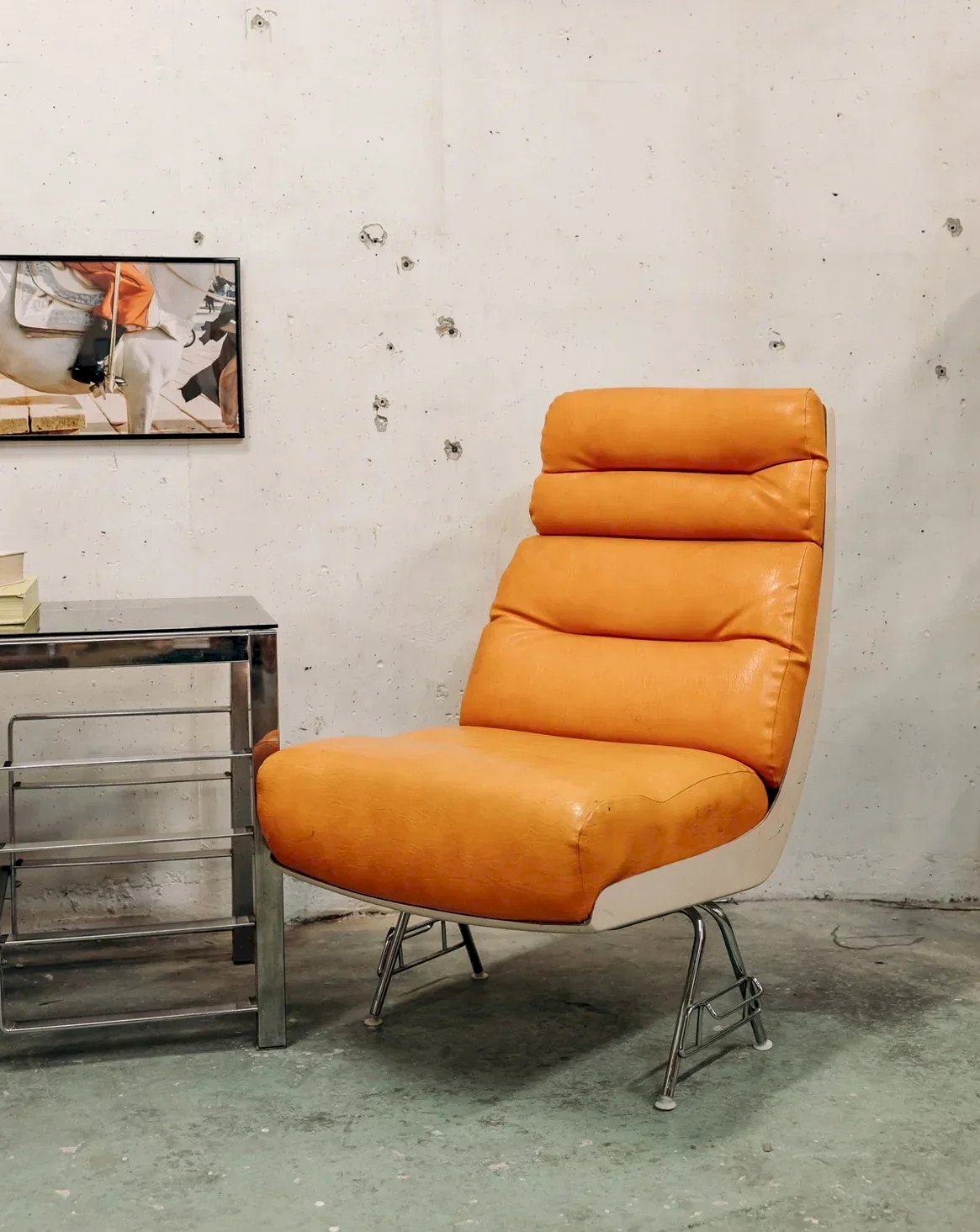 Orange upholstered chair with a retro style and comfortable design, perfect for adding a touch of color to your interior. Its faux leather seat, slightly worn, gives it an authentic charm and a unique character. The lightweight plastic frame combined with metal legs ensures stability and modernity. Ideal for a reading nook, an office, or a living room, this chair combines comfort and vintage design with personality. Length: 52 cm Width: 72 cm Seat depth: 44 cm Height: 95 cm Seat height: 45 cm Condition: Used: Item that has been used. Item shows some signs of superficial wear... Used: Item that has been used. Item shows some signs of superficial wear, fully operational and functioning correctly. It may be a demonstration model or an item returned to the store after a short period of use. Possible imperfections. Color: Multicolor Height: Faux leather, Metal, Plastic Width: Armchairs and lounge chairs Brand: Debongout Type: Thrifted product Material: Faux leather, Metal, Plastic Style: Contemporary