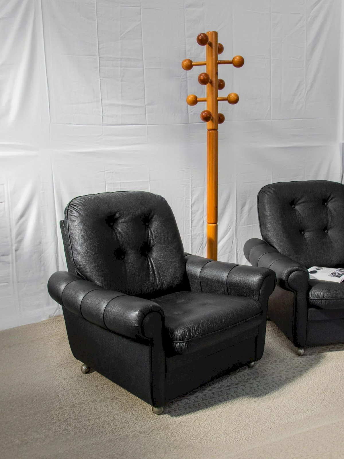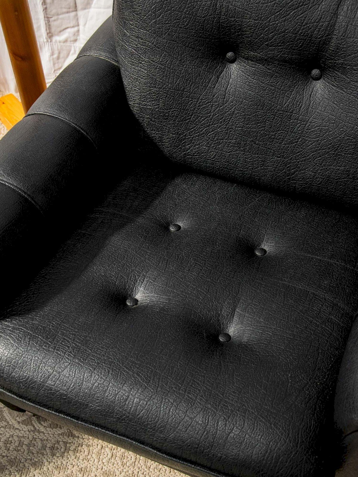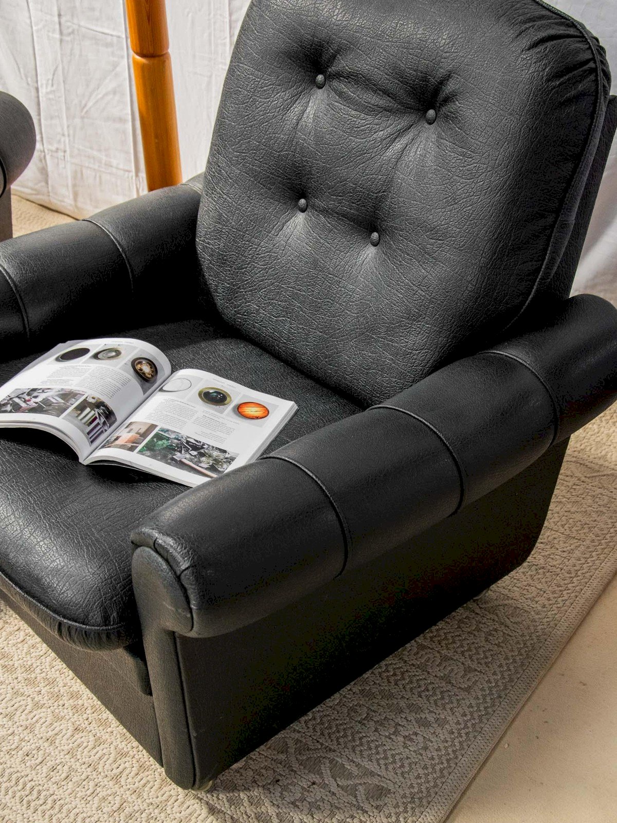 Discover our pair of black faux leather armchairs, combining elegance and comfort. With their generous seating, these armchairs are perfect for long hours spent working or relaxing. Featuring round wheels, they provide easy mobility in your space while adding a modern touch to your interior. An ideal choice to combine style and practicality! Length: 83 cm Width: 55 cm Height: 85 cm Seat height: 42 cm Seat depth: 55 cm Seat width: 55 cm Condition: Used: Item has been used. Item shows some signs of superficial wear, fully operational and functioning correctly. It may be a demonstration model or a returned item after a short period of use, with possible imperfections. Color: Multicolor Height: Faux leather, Simulated leather Width: Armchairs and lounge chairs Brand: Debongout Type: Thrifted product Material: Faux leather, Simulated leather Style: Contemporary