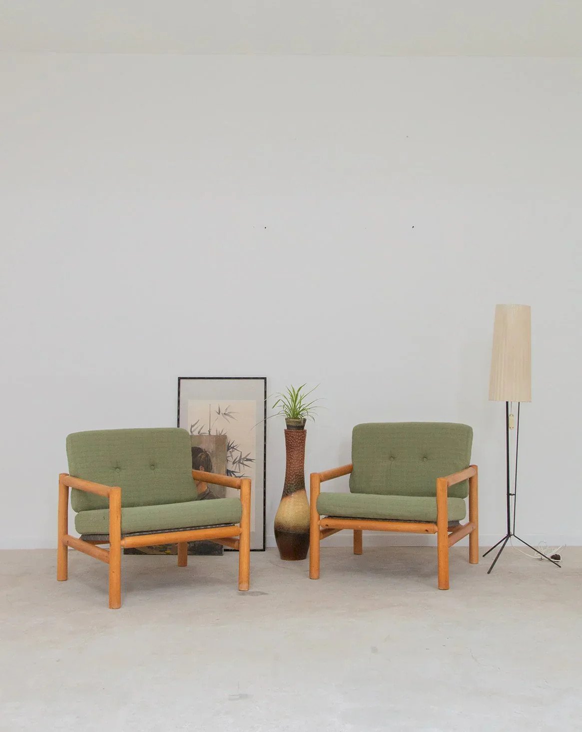 Add a touch of softness and elegance to your space with this pair of green fabric armchairs, accompanied by a light wood structure with rounded lines. The soft and soothing fabric perfectly complements the lightness of the wood, creating a perfect balance between comfort and aesthetics. The subtle curves of the structure bring a warm and modern dimension, ideal for any type of interior. These armchairs will be perfect for adding a note of freshness and friendliness to your living room or relaxation corner. Online exclusive, the meeting will take place at your home! Length: 68 cm Width: 69 cm Height: 68 cm Seat height: 40 cm Condition: Used: Item that has been used. Item showing some signs of superficial wear... Used: Item that has been used. Item showing some signs of superficial wear, fully operational and functioning correctly. It may be a demonstration model or an item returned to the store after a short period of use. any potential imperfections. Color: Multicolor Height: Fabric, Wood Width: Armchairs and lounge chairs Brand: Debongout Type: Thrifted product Material: Fabric, Wood Style: Contemporary