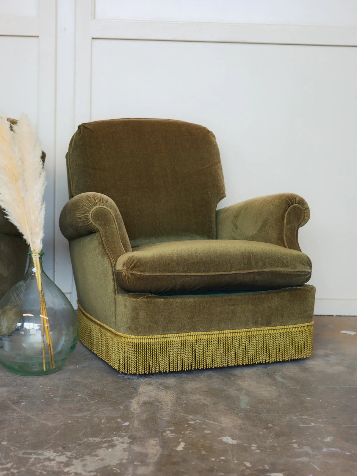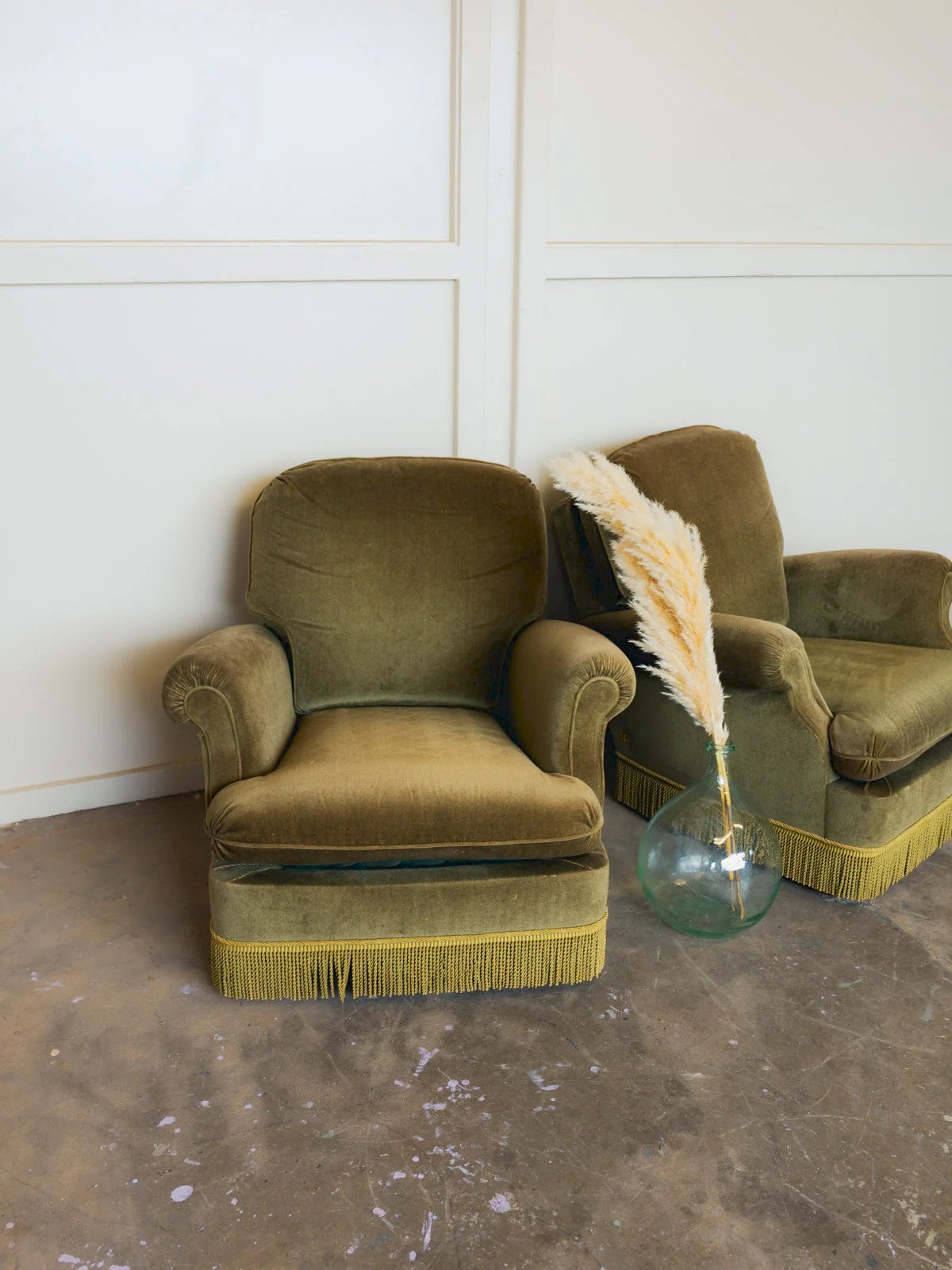 Adopt this pair of gray-green velvet armchairs, with soft lines and delicate fringes that bring a retro and sophisticated touch to your interior. The fabric, in good condition without any tears, covers generous and particularly comfortable seats; the fully removable cushions make maintenance simple and practical. Their warm silhouette fits well in both an intimate living room and a reading nook, creating an elegant and welcoming atmosphere. Light discoloration of the fabric. Length: 53 cm Width: 85 cm Height: 80 cm Seat height: 40 cm Seat depth: 50 cm Seat width: 53 cm Condition: Used: Item that has been used. Item showing some superficial signs of wear,... Used: Item that has been used. Item showing some superficial signs of wear, fully operational and working properly. It may be a display model or an item returned to the store after a short period of use, with possible imperfections. Color: Multicolor Height: Velvet, Foam, Wood Width: Armchairs and loungers Brand: Debongout Type: Vintage product Material: Velvet, Foam, Wood Style: Contemporary