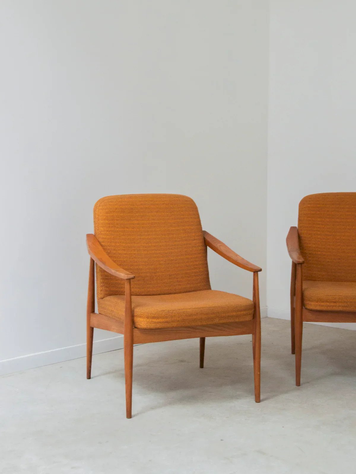 Adopt this pair of light wood armchairs with curved armrests and seats and backs covered in vibrant orange fabric. The wooden structure brings a warm and graphic presence, while the continuous upholstery offers enveloping support for long conversations or a reading nook. Compact yet generous in seating, these pieces fit into a contemporary living room or a welcoming entrance, creating a refined and colorful atmosphere. Width: 62 cm Depth: 62 cm Seat depth: 48 cm Seat width: 50 cm Height: 83 cm Seat height: 42 cm Condition: Used: Item has been used. Item shows some superficial wear marks, ...Used: Item has been used. Item shows some superficial wear marks, fully operational and functioning properly. It may be a demonstration model or an item returned to the store after a short period of use. any possible imperfections. Color: Multicolor Height: Wood, Fabric Width: Armchairs and lounge chairs Brand: Debongout Type: Vintage product Material: Wood, Fabric Style: Contemporary