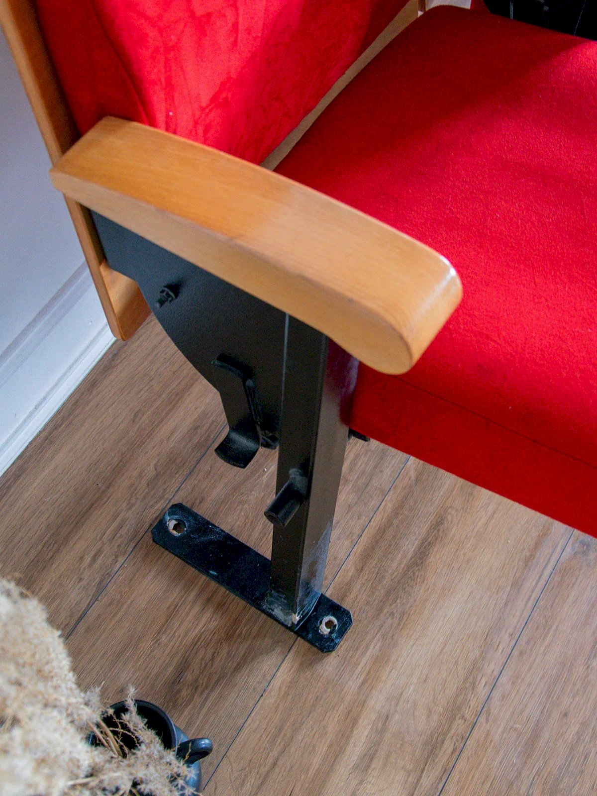 Discover this rare vintage piece made up of three securely assembled rocking chairs. Wood and metal structure, with a red fabric covering typical of the 70s. These chairs come from an old Parisian theater, adding a beautiful story to their charm. The fabric is slightly wrinkled, but the whole remains stable and functional. A unique retro-looking item, perfect for a bold interior or a screening room. Length: 154.5 cm Seat length: 47 cm Height: 88 cm Seat height: 46 cm Depth when closed: 34 cm Depth when open: 54 cm Condition: Used: Item that has been used. Item showing some superficial wear, fully operational and functioning correctly. It may be a demonstration model or an item returned to the store after a short period of use. Possible imperfections. Color: Multicolored Height: Wood, Metal, Fabric Width: Armchairs and lounge chairs Brand: Debongout Type: Thrifted product Material: Wood, Metal, Fabric Style: Contemporary